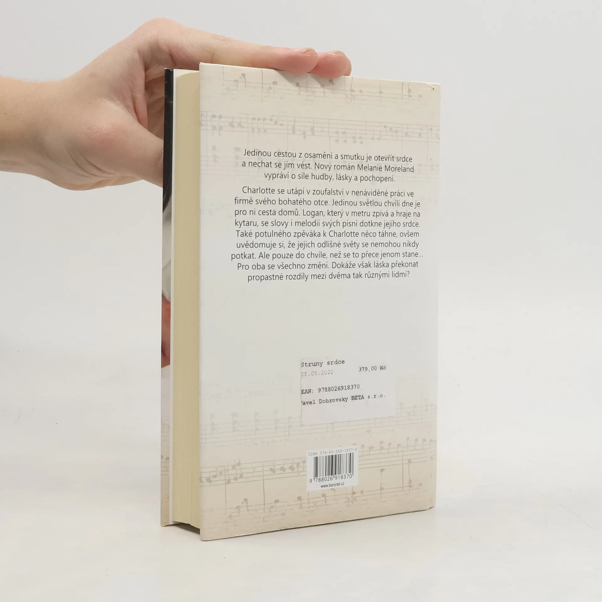 Jedinou cestou z osamění a smutku je otevřít srdce a nechat se jím vést. Nový román Melanie Moreland vypráví o síle hudby, lásky a pochopení. Charlotte se utápí v zoufalství v práci u bohatého otce, kterou nenávidí. Jedinou světlou chvílí dne je pro ni cesta domů. Montgomery, který v metru zpívá a hraje na kytaru, se slovy i melodií svých písní dotkne jejího srdce. Také potulného zpěváka k Charlotte něco táhne, ale uvědomuje si, že jejich odlišné světy se nemohou nikdy potkat. Ale pouze do chvíle, kdy se to přece jenom stane… Pro oba se všechno změní. Dokáže však láska překonat propastné rozdíly mezi dvěma tak různými lidmi?