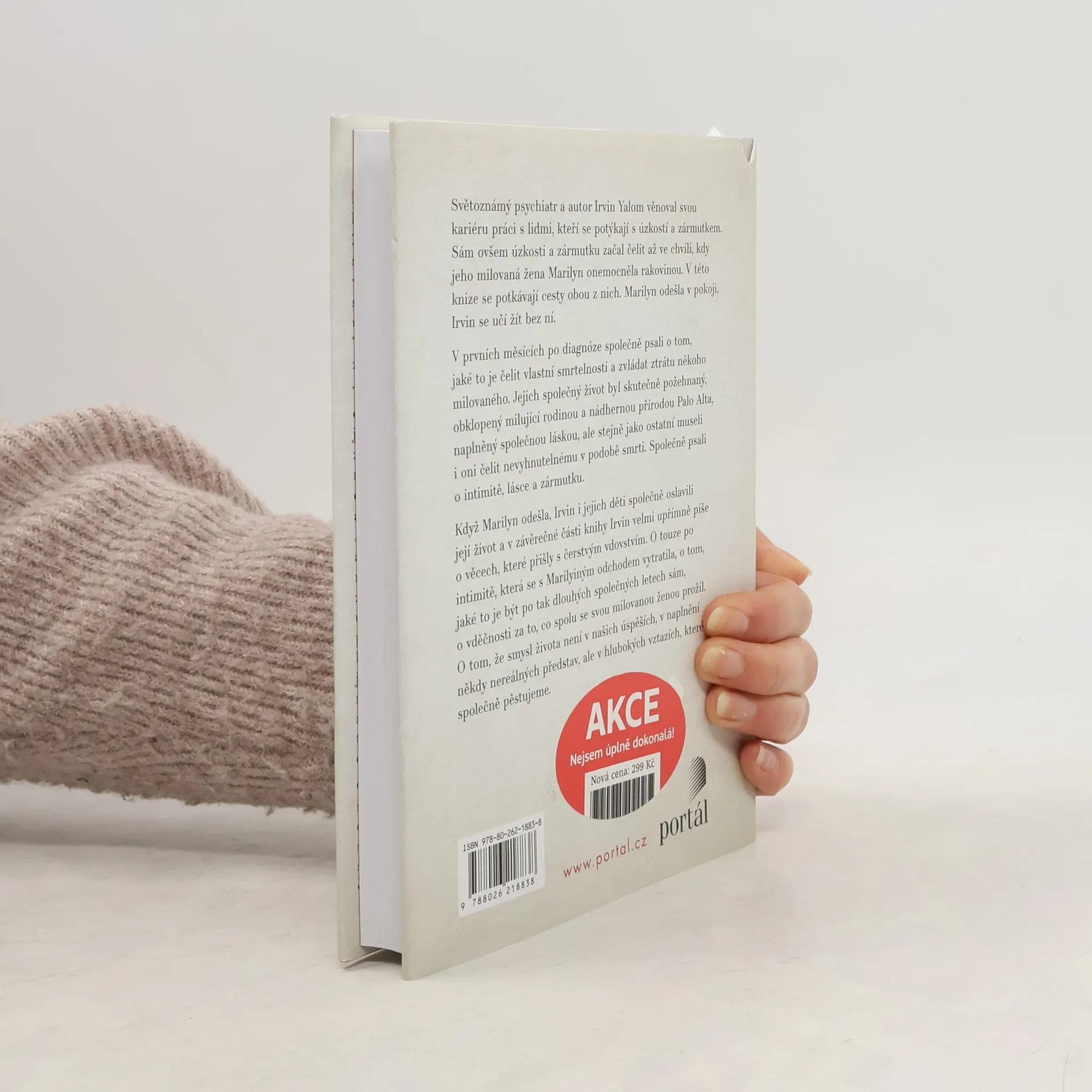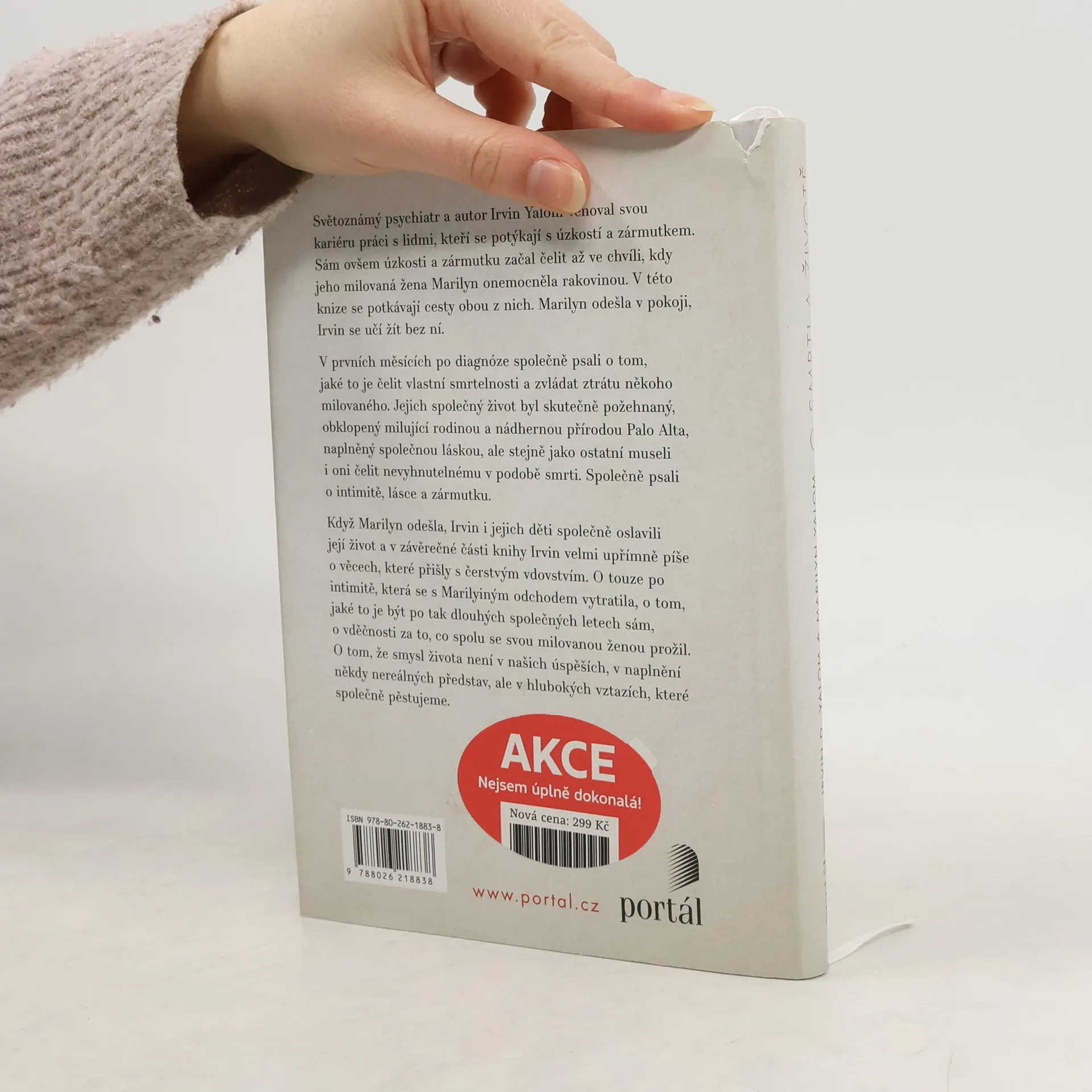 Světoznámý psychiatr a autor Irvin Yalom věnoval svou kariéru práci s lidmi, kteří se potýkají s úzkostí a zármutkem. Sám ovšem úzkosti a zármutku začal čelit až ve chvíli, kdy jeho milovaná žena Marylin onemocněla rakovinou. V této knize se potkávají cesty obou z nich. Marylin odešla v pokoji, Irvin se učí žít bez ní. V prvních měsících po diagnóze společně psali o tom, jaké to je, čelit vlastní smrtelnosti a zvládat to, že ztratí někoho, koho milujeme. Jejich společný život byl skutečně požehnaný, obklopený milující rodinou a nádhernou přírodou Palo Alta, naplněný společnou láskou, ale stejně jako my museli čelit nevyhnutelnému v podobě smrti. Společně psali o intimitě, lásce a zármutku. Když Marylin odešla, Irvin i jejich děti společně oslavili její život a v závěrečné části knihy Irvin velmi upřímně píše o věcech, které přišly s čerstvým vdovstvím. O touze po intimitě, která se s Maryliiným odchodem vytratila, o tom, jaké to je být po tak dlouhých společných letech sám, o vděčnosti za to, co spolu se svou milovanou ženou prožil. O tom, že smysl života není v našich úspěších, v naplnění někdy nereálných představ, ale v hlubokých vztazích, které společně pěstujeme.