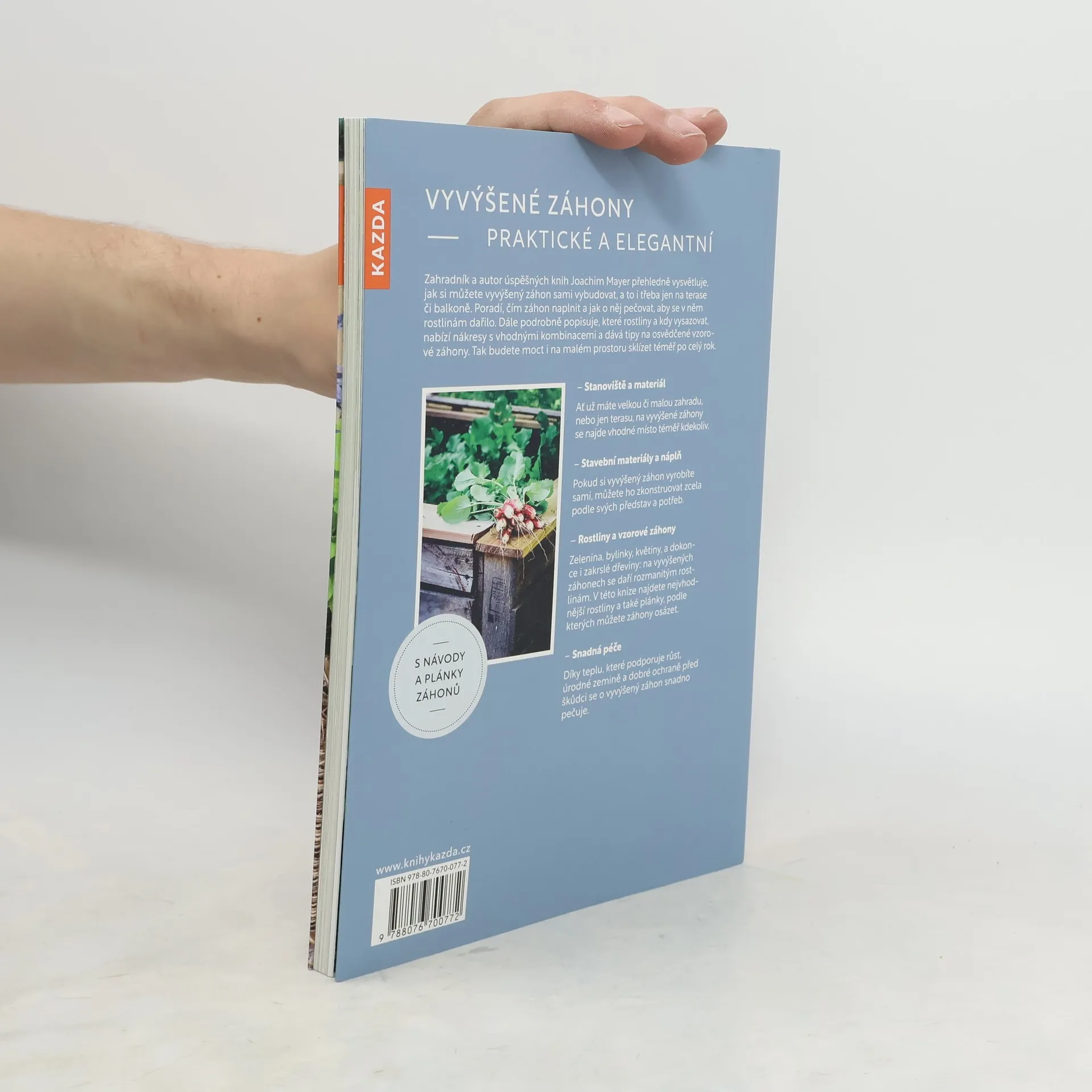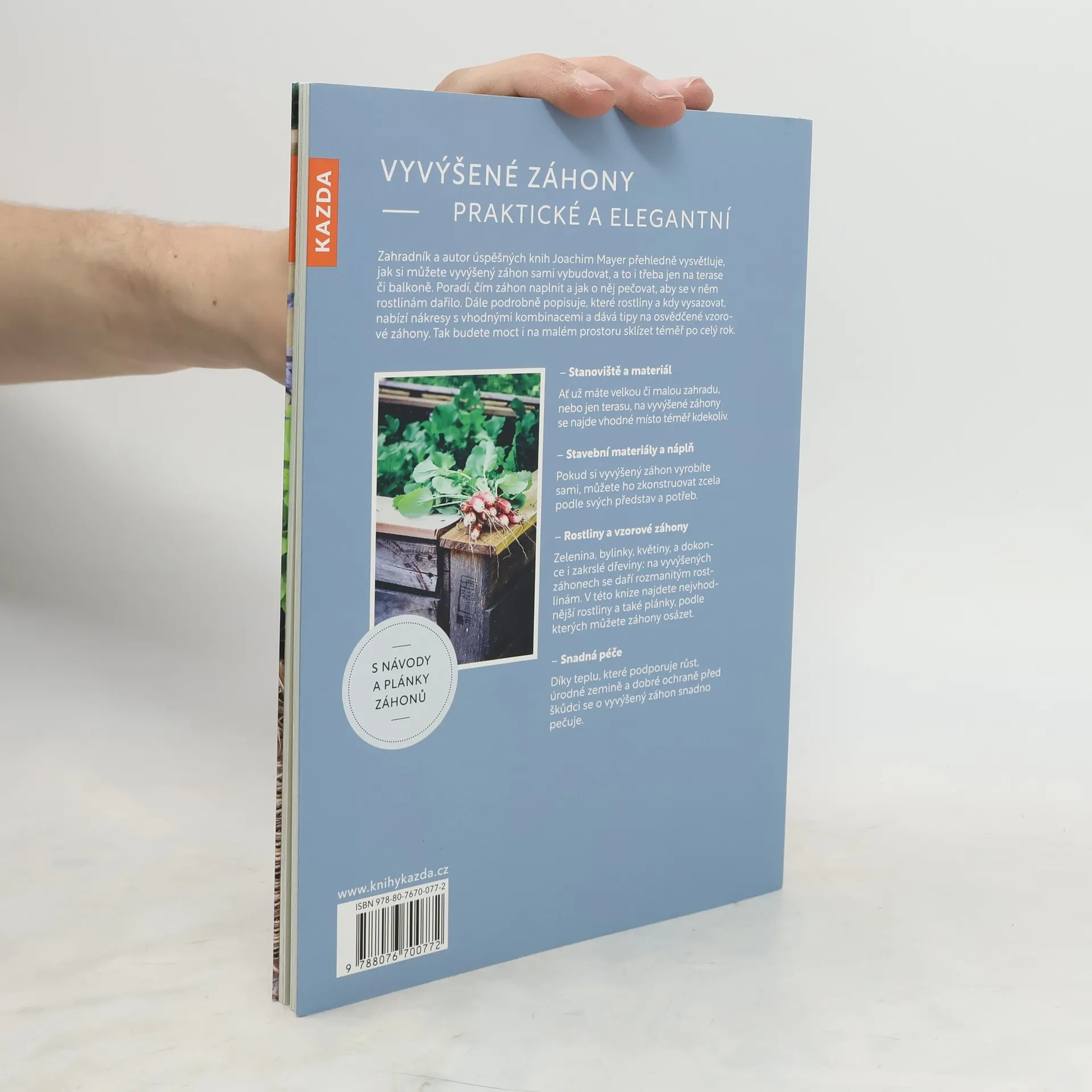 Zahradník a autor úspěšných knih Joachim Mayer přehledně vysvětluje, jak si můžete vyvýšený záhon sami vybudovat, a to i třeba jen na terase či balkoně. Poradí, čím záhon naplnit a jak o něj pečovat, aby se v něm rostlinám dařilo. Dále podrobně popisuje, které rostliny a kdy vysazovat, nabízí nákresy s vhodnými kombinacemi a dává tipy na osvědčené vzorové záhony. Tak budete moct i na malém prostoru sklízet téměř po celý rok. Stanoviště a materiál Ať už máte velkou či malou zahradu, nebo jen terasu, na vyvýšené záhony se najde vhodné místo téměř kdekoliv. Stavební materiály a náplň Pokud si vyvýšený záhon vyrobíte sami, můžete ho zkonstruovat zcela podle svých představ a potřeb. Rostliny a vzorové záhony Zelenina, bylinky, květiny, a dokonce i zakrslé dřeviny: na vyvýšených záhonech se daří rozmanitým rostlinám. V této knize najdete nejvhodnější rostliny a také plánky, podle kterých můžete záhony osázet. Snadná péče Díky teplu, které podporuje růst, úrodné zemině a dobré ochraně před škůdci se o vyvýšený záhon snadno pečuje.