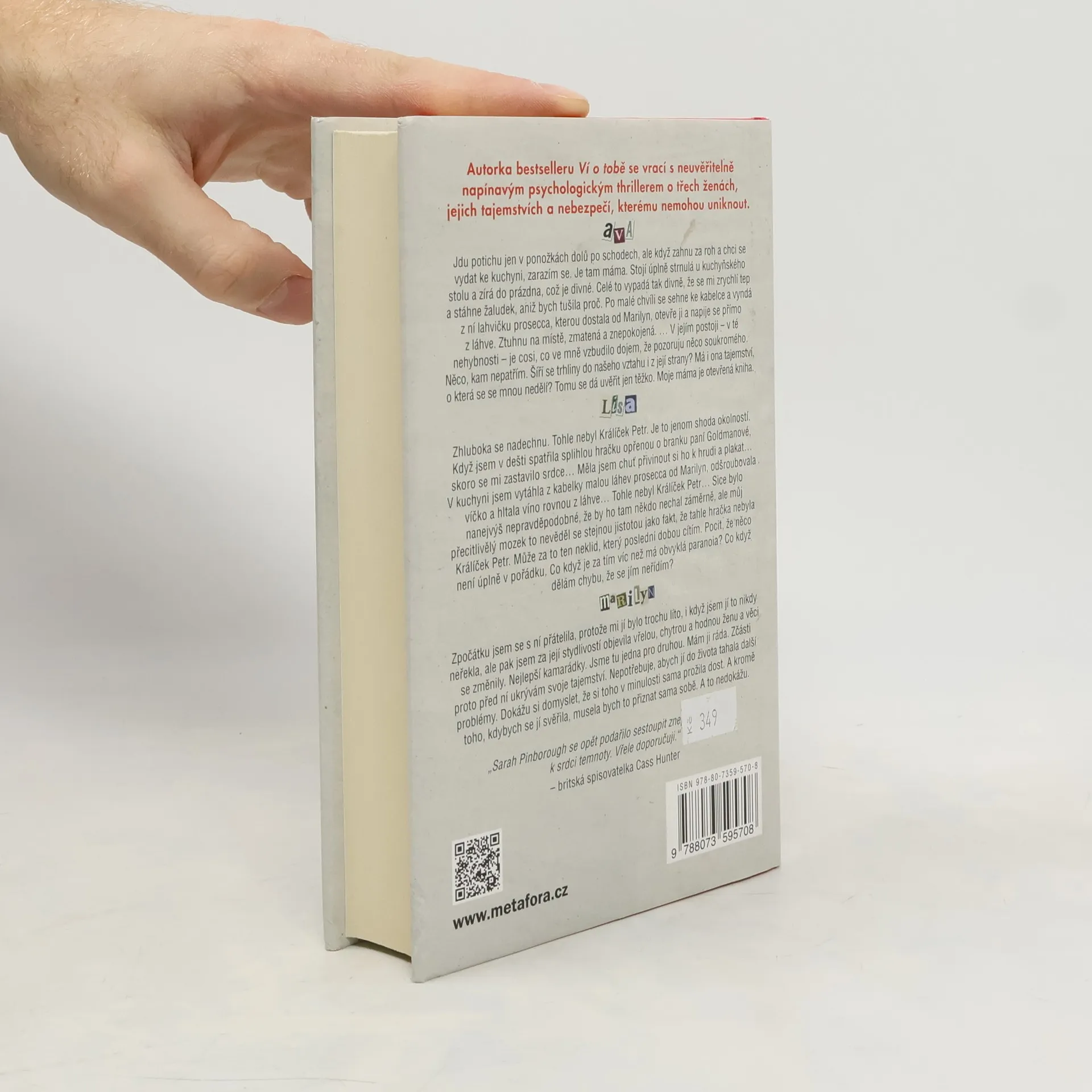 Sliby trvají jen tak dlouho, dokud věříte tomu, kdo je dal… Autorka bestselleru Ví o tobě přichází s napínavým psychologickým thrillerem o třech ženách, jejich tajemstvích a nebezpečí, které je pronásleduje. Lisa, svobodná matka kolem čtyřicítky, se plně věnuje výchově své šestnáctileté dcery Avy. O mužích je opatrná a nikdy nemluví o své minulosti ani o nepřítomném otci Avy. Její nejlepší přítelkyně Marilyn by jí přála, aby se více otevřela a zkusila randit, zejména s novým klientem, který o ni má zájem. Ava, unavená z matčiny přehnané péče, touží po běžném životě teenagera, přátelích a vztahu. Lisa se však začíná cítit nesvá, když se objevují záhadné připomínky její minulosti, které ohrožují její pečlivě vybudovaný život. Aby ochránila sebe a dceru, musí čelit svému strachu, a to s pomocí Marilyn, jediné osoby, které může důvěřovat. Jejich vzájemná důvěra je klíčová pro záchranu Avy. Jenže Lisa kdysi porušila slib, který ji nyní dohání. Její zrada nebyla nikdy zapomenuta a teď musí čelit následkům svých činů.