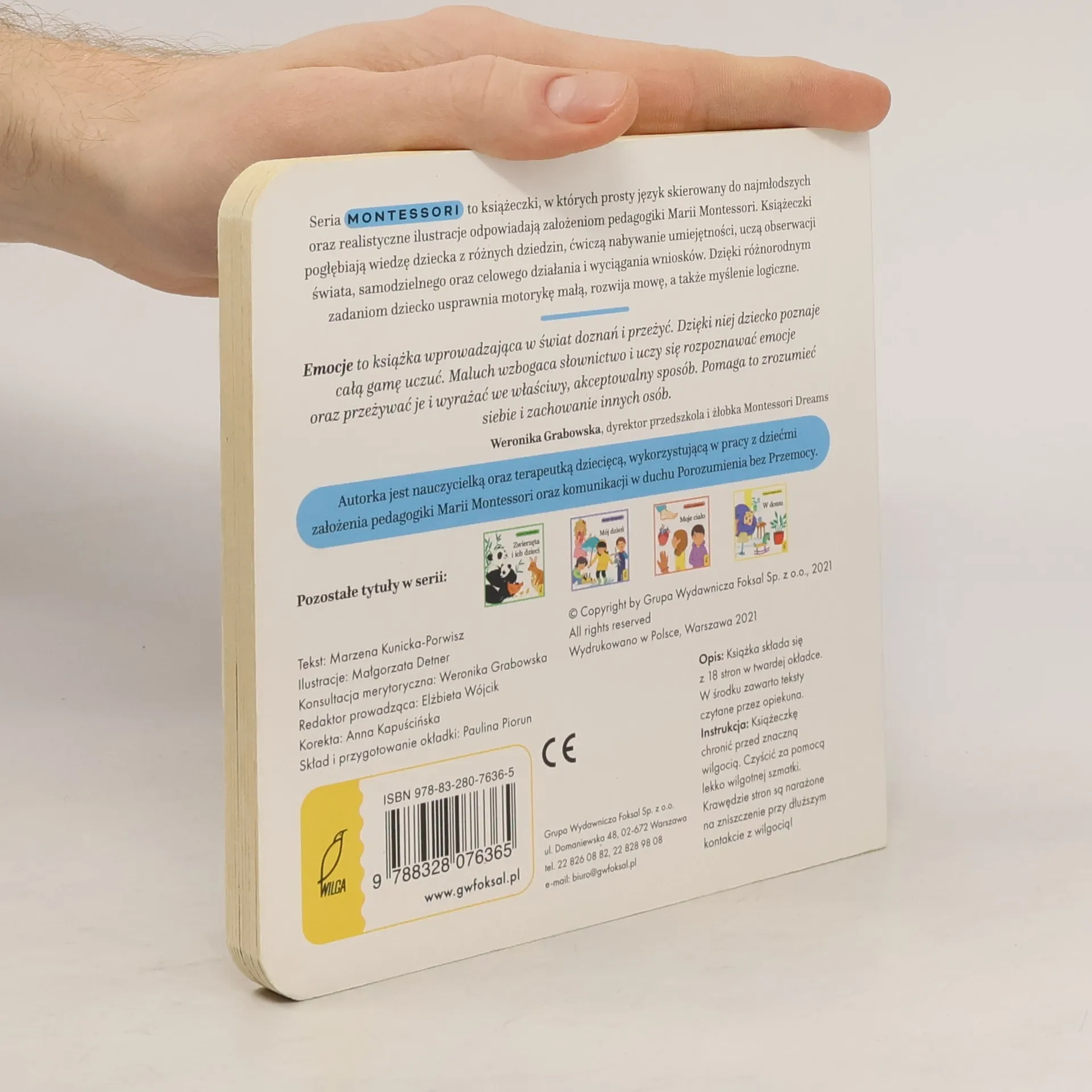 Książeczki dla najmłodszych przygotowane przez specjalistę zgodnie z metodą Montessori. W książce Emocje dzieci znalazły się zagadnienia dotyczące tajemnic ludzkich emocji, dzięki którym dzieci poznają je bliżej i nauczą się je nazywać. Dzięki książeczkom Montessori dzieci zdobywają podstawową wiedzę dotyczącą otaczającego je świata.