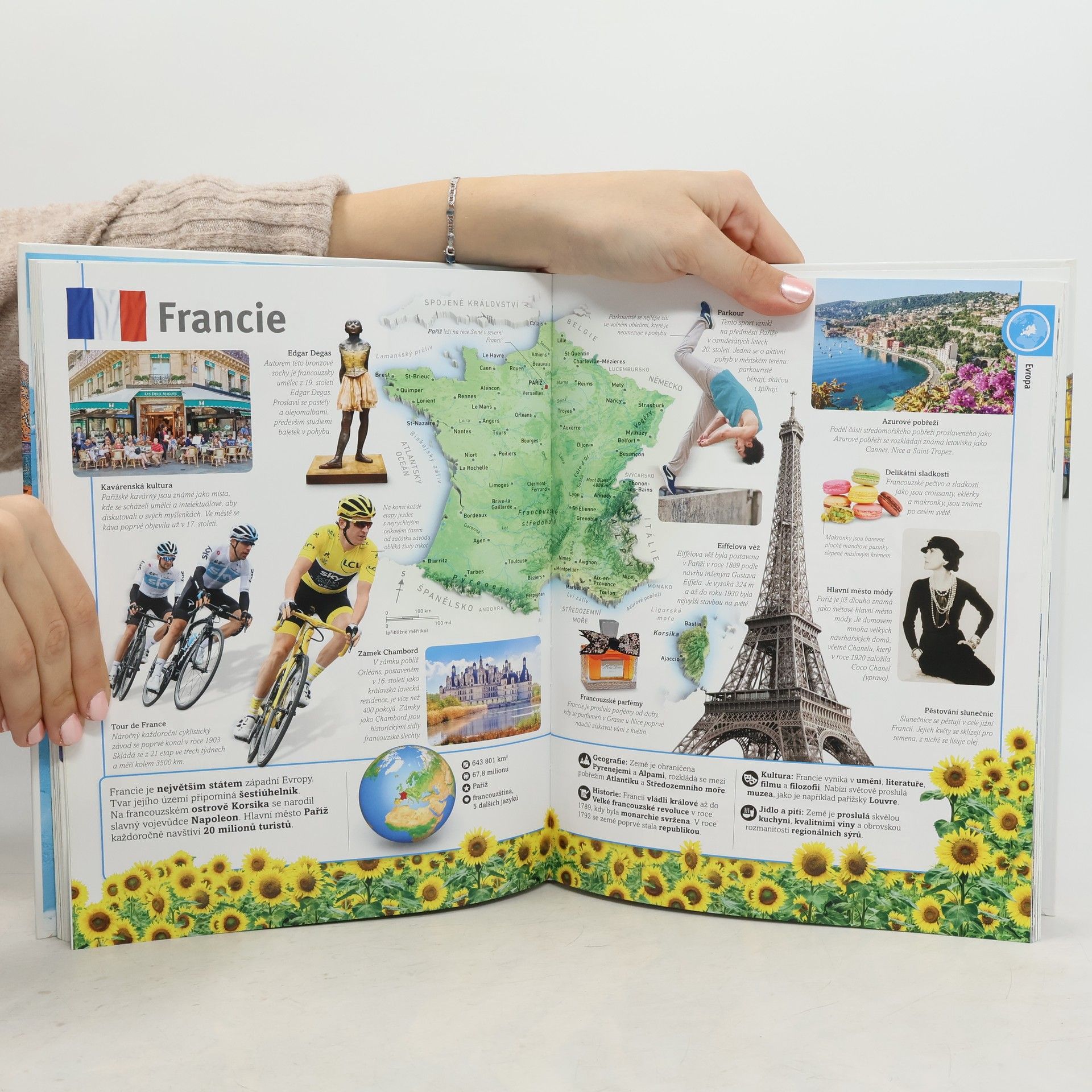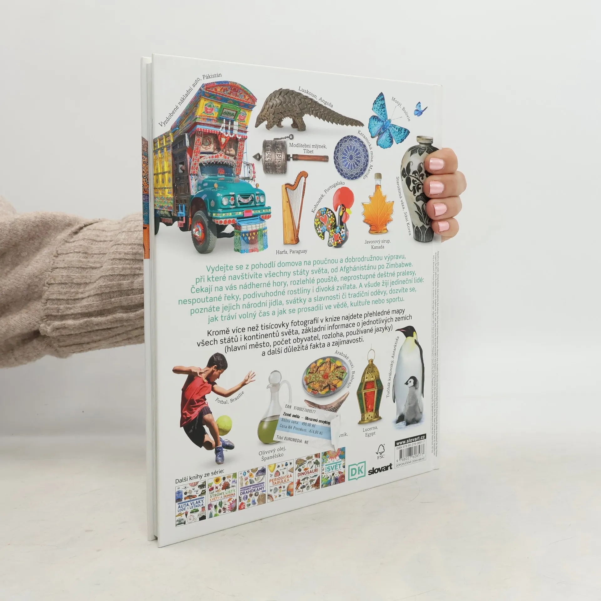 Vydejte se s obrazovou encyklopedií, která obsahuje více než 1000 působivých fotografií, na dobrodružnou a poučnou cestu kolem světa. Z pohodlí domova se stanete cestovateli, kteří navštíví všechny země na sedmi kontinentech. Zjistíte, co činí každou z nich jedinečnou. Uvidíte působivé skalnaté hory, husté lesy, rozlehlé travnaté pláně, nehostinné pouště, deštné pralesy, divoké řeky, mohutné vodopády, činné sopky, tajemné jeskyně, pláže s bělostným pískem, pohádkově krásné ostrovy i pustá, bohem zapomenutá místa. Dozvíte se, jací živočichové a rostliny jsou v zemi typické pro jednotlivé biotopy, jaká tam existují nejzajímavější a nejnavštěvovanější chráněná území nebo národní parky, jak lidé v různých zemích žijí a jak si zajišťují obživu, jaká jsou jejich typická jídla, jak tráví volný čas a slaví svátky, jak se oblékají, co navštívené země proslavilo, jaké dosáhly úspěchy ve vědě, kultuře či sportu… Nechybí ani informace o vlajkách, hlavním městě, jazycích, kterými se v té které zemi mluví, a mnoho dalších důležitých faktů a zajímavostí.