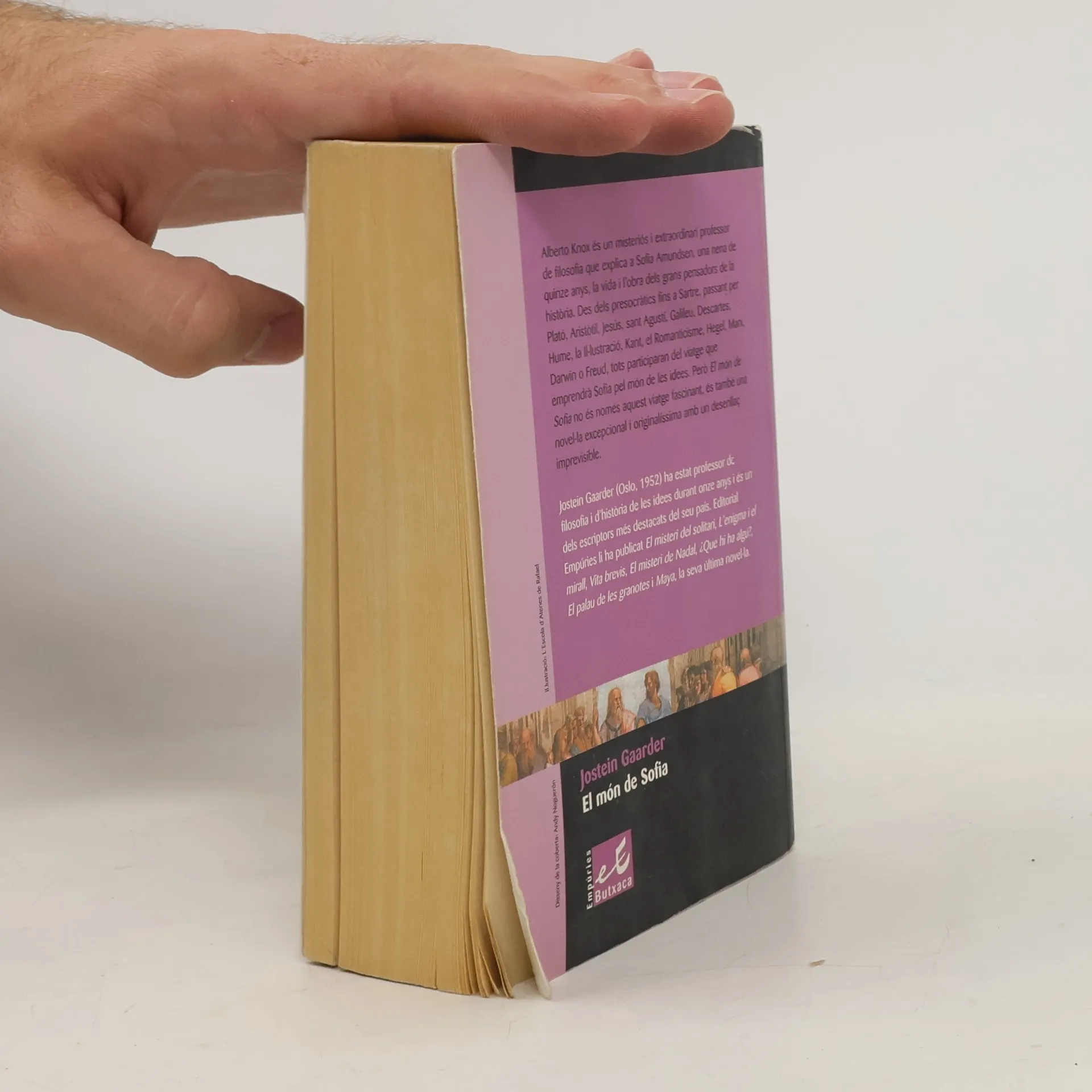 Alberto Knox és un misteriós i extraordinari professor de filosofia que explica a Sofia Amundsen, una nena de quinze anys, la vida i l ́obra dels grans pensadors de la història. Des dels presocràtics fins a Sartre, passant per Plató, Aristòtil, Jesús, Sant Agustí, Galileu, Descartes, Hume, la Il·lustració, Kant, el Romanticisme, Hegel, marx, Darwin o Freud, tots participaran del viatge que empendrà Sofia pel món de les idees. Però El món de Sofia no és només aquest viatge fascinant, és també una novel·la excepcional i originalíssima amb un desenllaç imprevissible.Jostein Gaarder (Oslo, 1952) ha estat professor de filosofia i d ́història de les idees durant onze anys i és un dels escriptors més destacats del seu país. Ed. Empúries li ha publicat El misteri del solitari, l ́enigma i el mirall, Vita brevis, El misteri de Nadal, ¿Què hi ha algú?, El palau de les granotes, Maya i La noia de les taronges.