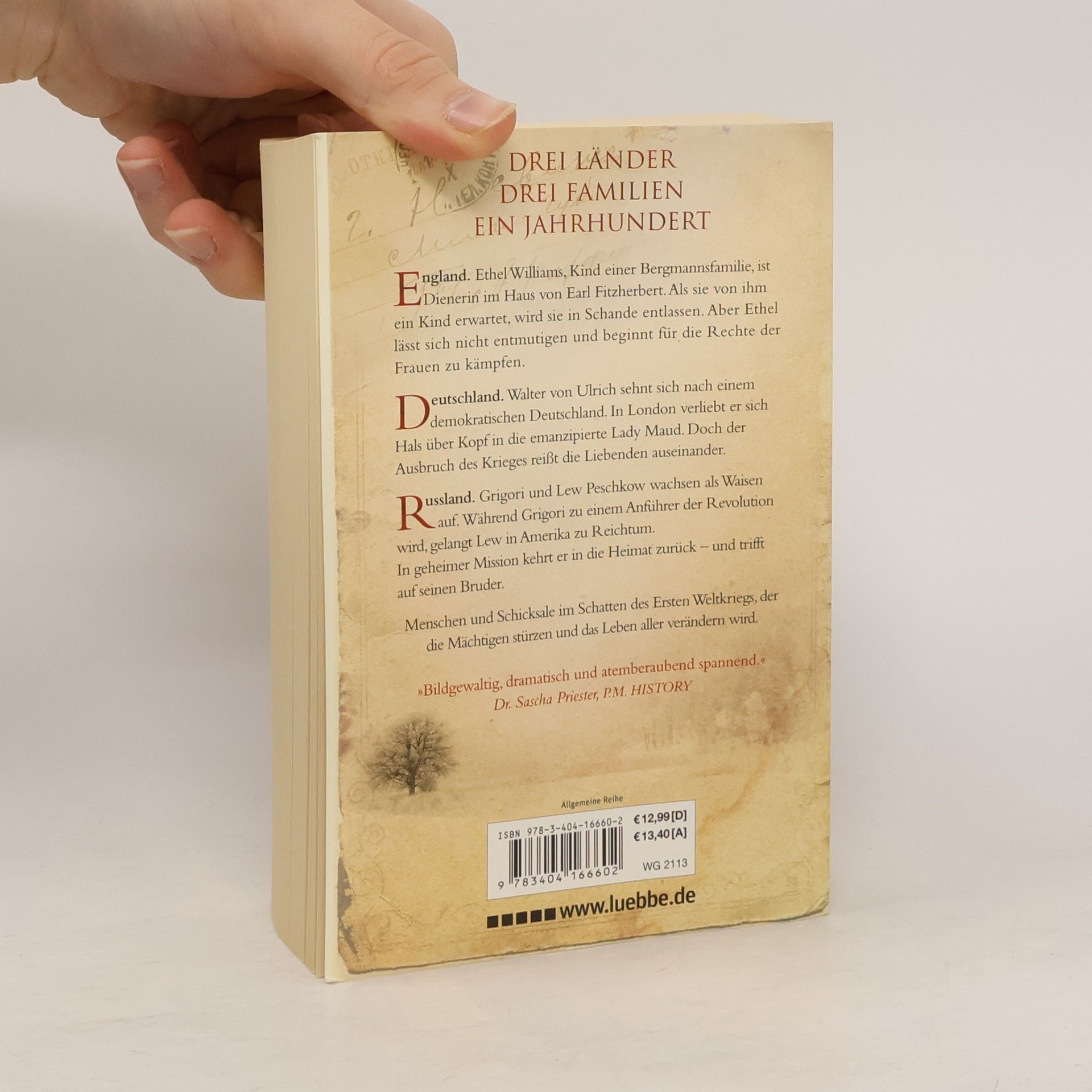 DREI LÄNDER. DREI FAMILIEN. EIN JAHRHUNDERT. Die große Familiensaga von Ken Follett, Autor der Bestseller DIE SÄULEN DER ERDE und DIE TORE DER WELT. Im Jahr 1914 herrscht in Europa Frieden, doch die Weltmächte rüsten zum Krieg. Der drohende Konflikt beeinflusst das Leben mehrerer Familien aus verschiedenen Ländern, deren Wege sich über ein ganzes Jahrhundert kreuzen. Ethel Williams, Tochter einer Bergmannsfamilie aus Wales, wird als Dienerin im Haus von Earl Fitzherbert schwanger und entlassen. Unbeirrt kämpft sie für die Rechte der Frauen, während die Männer in den Krieg ziehen. Walter von Ulrich, aus einer Adelsfamilie, wünscht sich ein demokratisches Deutschland und heiratet heimlich die emanzipierte Lady Maud, kurz bevor der Krieg ausbricht. Doch der Konflikt trennt die Liebenden. Grigori und Lew Peschkow wachsen als Waisen in St. Petersburg auf. Während der rechtschaffene Grigori zum Revolutionär wird, erlangt der leichtfertige Lew in Amerika Reichtum. Als Lew zur Armee eingezogen wird und als Soldat zurückkehrt, trifft er auf seinen Bruder. Als abgeschlossener historischer Roman ist dies der spannende Auftakt von Folletts Jahrhundert-Trilogie, die mit WINTER DER WELT fortgesetzt wird und mit KINDER DER FREIHEIT endet. Platz 1 der SPIEGEL-Bestsellerliste. „Bildgewaltig, dramatisch und atemberaubend spannend.“ Dr. Sascha Priester, P. M. History. Mit einer Leseprobe aus WINTER DER WELT.