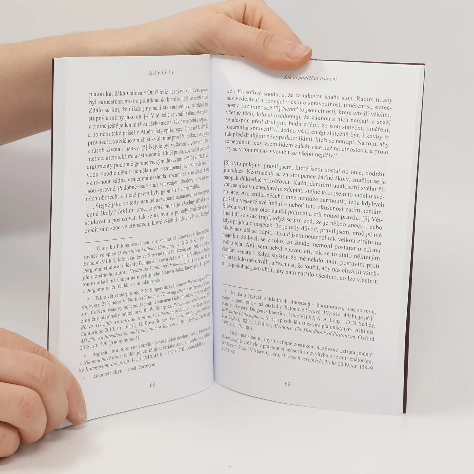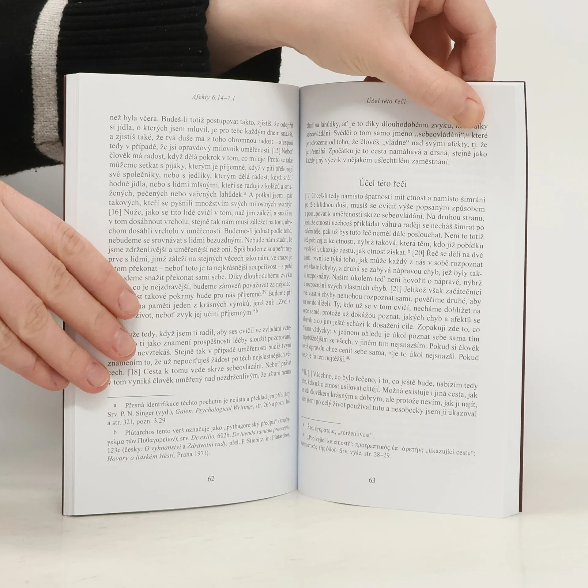 Významný starověký lékař a filosof se v tomto spisu zamýšlí nad tím, jak se člověk může vyléčit z nezvládnutých afektů, které mu kazí život, a zbavit se chyb, které mu zatemňují úsudek.Na příkladech z vlastního života i z života svých přátel ukazuje, s jakými potížemi se setkává člověk podléhající návalům vzteku, trápení nebo obavám ze ztráty, a nabízí konkrétní postupy, které mu pomohou najít ztracenou sebeúctu. V druhé části se pak zabývá chybami úsudku, ať už jde o ochotu věřit nepodloženým tvrzením, nebo naopak pochybnost o tom, co je evidentně pravdivé, a doporučuje zvláště filosofům studium aplikované geometrie, jejíž výsledky lze (na rozdíl od většiny jejich nauk) ověřit v praxi.