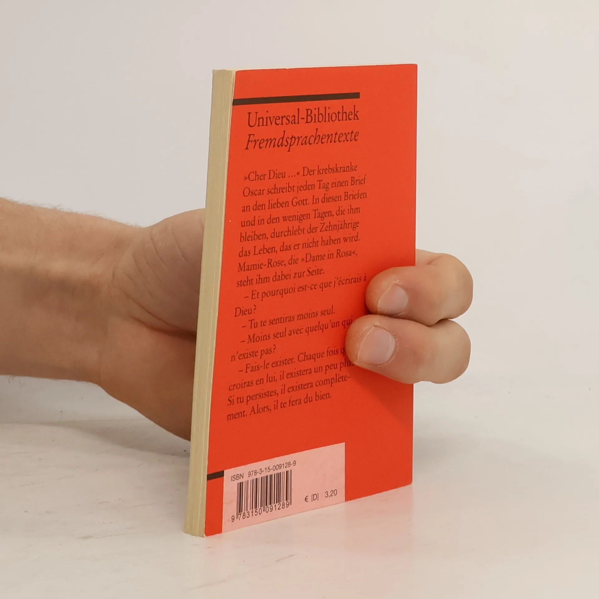 Französische Literatur in Reclams Roter Reihe: das ist der französische Originaltext – mit Worterklärungen am Fuß jeder Seite, Nachwort und Literaturhinweisen. Schmitts – nach Monsieur Ibrahim – zweiter großer Bucherfolg erzählt die anrührende Geschichte des todkranken zehnjährigen Oscar. Mamie-Rose, die alte Dame in Rosa, schlägt ihm vor, an Gott zu schreiben – und von nun an ist für Oscar jeder Tag, der noch bleibt, ein ganzes Jahrzehnt: Er erlebt Kindheit, Pubertät, erste Liebe, das Erwachsensein, das Alter, berichtet Gott in seinen Briefen davon und stirbt am Ende müde und erschöpft. Französische Lektüre: Niveau B1 (GER) Sprachen: Deutsch, Französisch