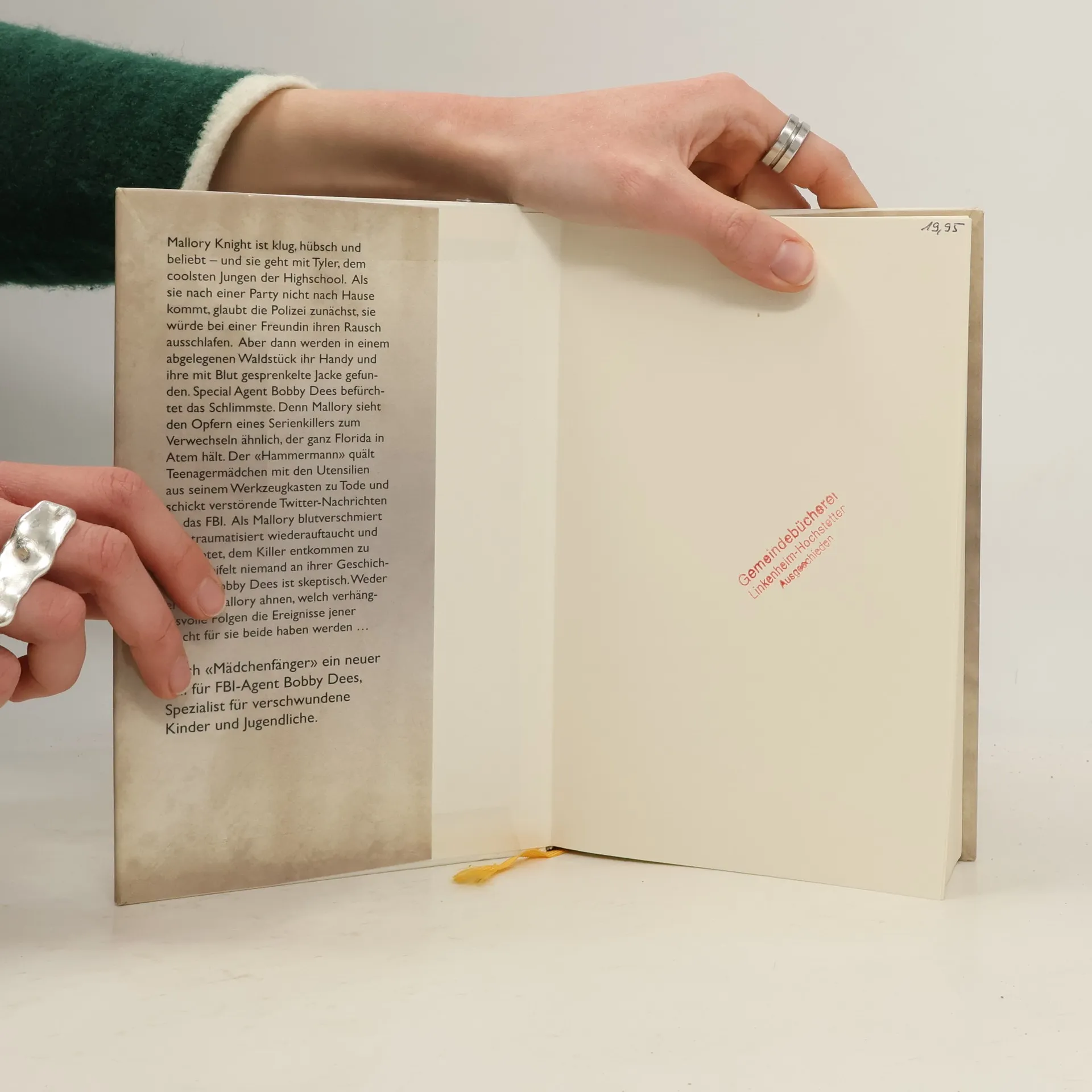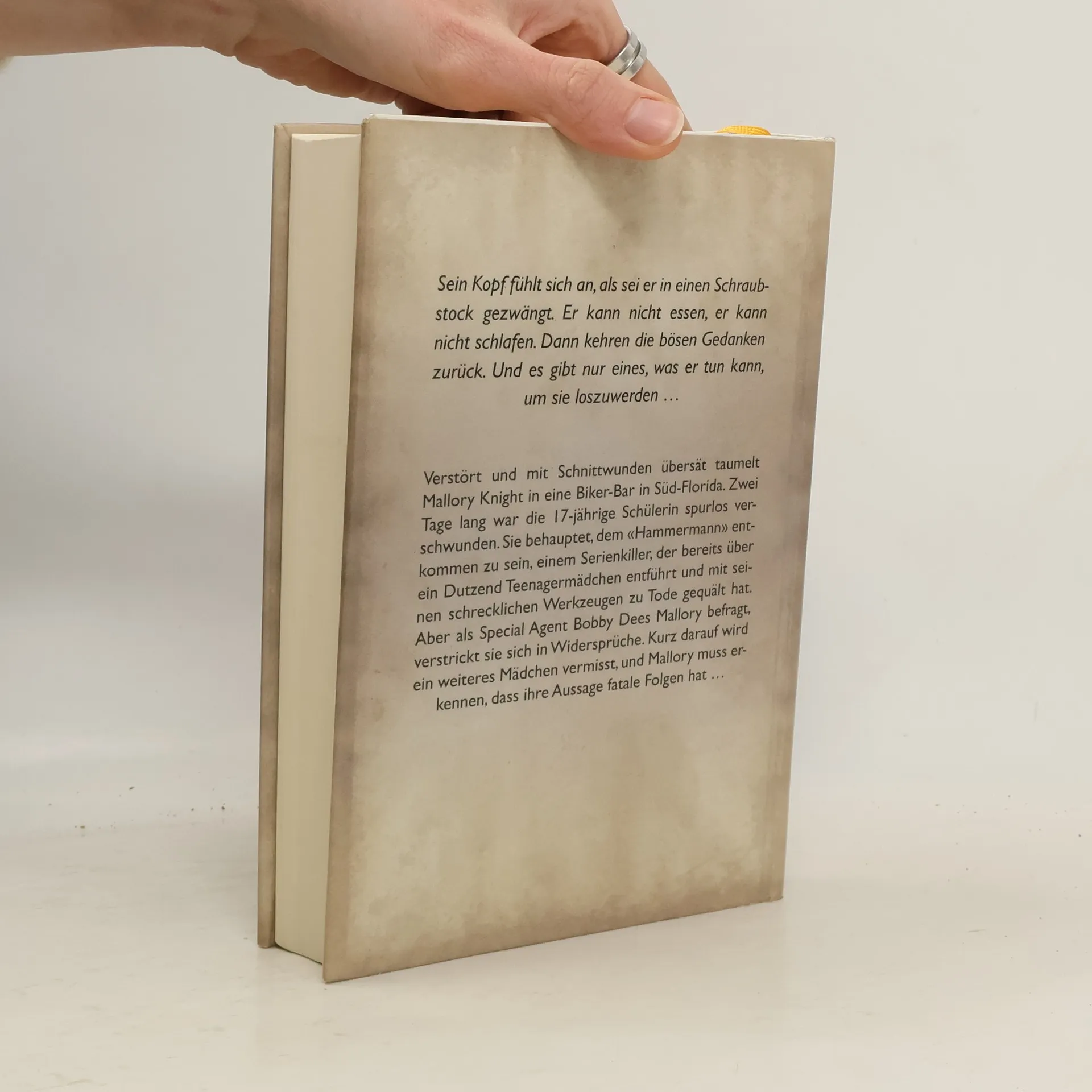Der neue Thriller von Bestseller-Autorin Jilliane Hoffman: Nach „Mädchenfänger“ der zweite Fall für FBI-Agent Bobby Dees, Spezialist für verschwundene Kinder und Jugendliche.Sein Kopf fühlt sich an, als sei er in einen Schraubstock gezwängt. Er kann nicht essen, er kann nicht schlafen. Dann kehren die bösen Gedanken zurück. Und es gibt nur eines, was er tun kann, um sie loszuwerden ... Verstört und mit Schnittwunden übersät taumelt Mallory Knight in eine Biker-Bar in Süd-Florida. Zwei Tage lang war die 17-jährige Schülerin spurlos verschwunden. Sie behauptet, dem „Hammermann“ entkommen zu sein, einem Serienkiller, der bereits über ein Dutzend Teenagermädchen entführt und mit seinen schrecklichen Werkzeugen zu Tode gequält hat. Aber als Special Agent Bobby Dees Mallory befragt, verstrickt sie sich in Widersprüche. Kurz darauf wird ein weiteres Mädchen vermisst, und Mallory muss erkennen, dass ihre Aussage fatale Folgen hat...