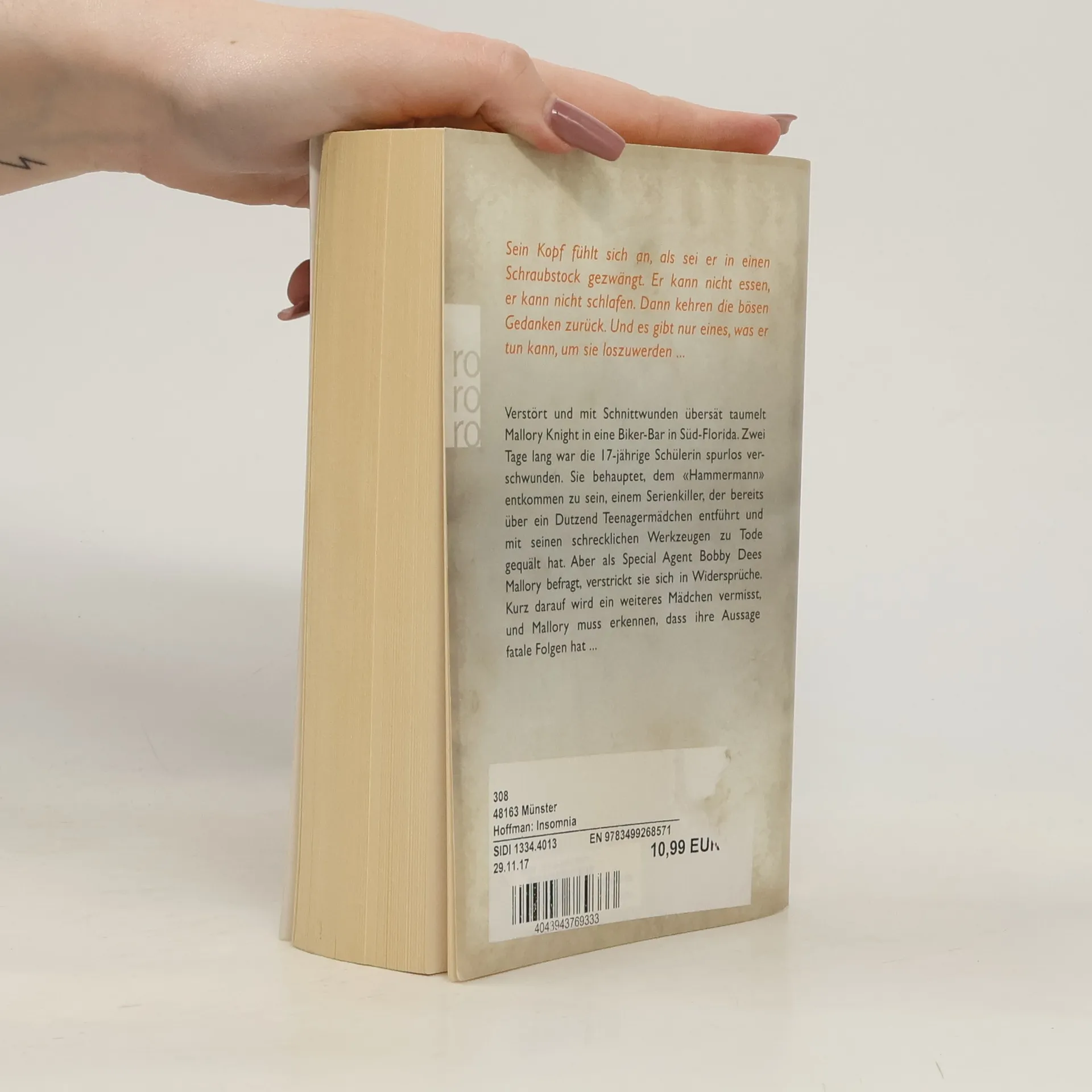 Sein Kopf fühlt sich an, als sei er in einen Schraubstock gezwängt. Er kann nicht essen, er kann nicht schlafen. Dann kehren die bösen Gedanken zurück. Und es gibt nur eines, was er tun kann, um sie loszuwerden ... Verstört und mit Schnittwunden übersät taumelt Mallory Knight in eine Biker-Bar in Süd-Florida. Zwei Tage lang war die 17-jährige Schülerin spurlos verschwunden. Sie behauptet, dem „Hammermann“ entkommen zu sein, einem Serienkiller, der bereits über ein Dutzend Teenagermädchen entführt und mit seinen schrecklichen Werkzeugen zu Tode gequält hat. Aber als Special Agent Bobby Dees Mallory befragt, verstrickt sie sich in Widersprüche. Kurz darauf wird ein weiteres Mädchen vermisst, und Mallory muss erkennen, dass ihre Aussage fatale Folgen hat ...