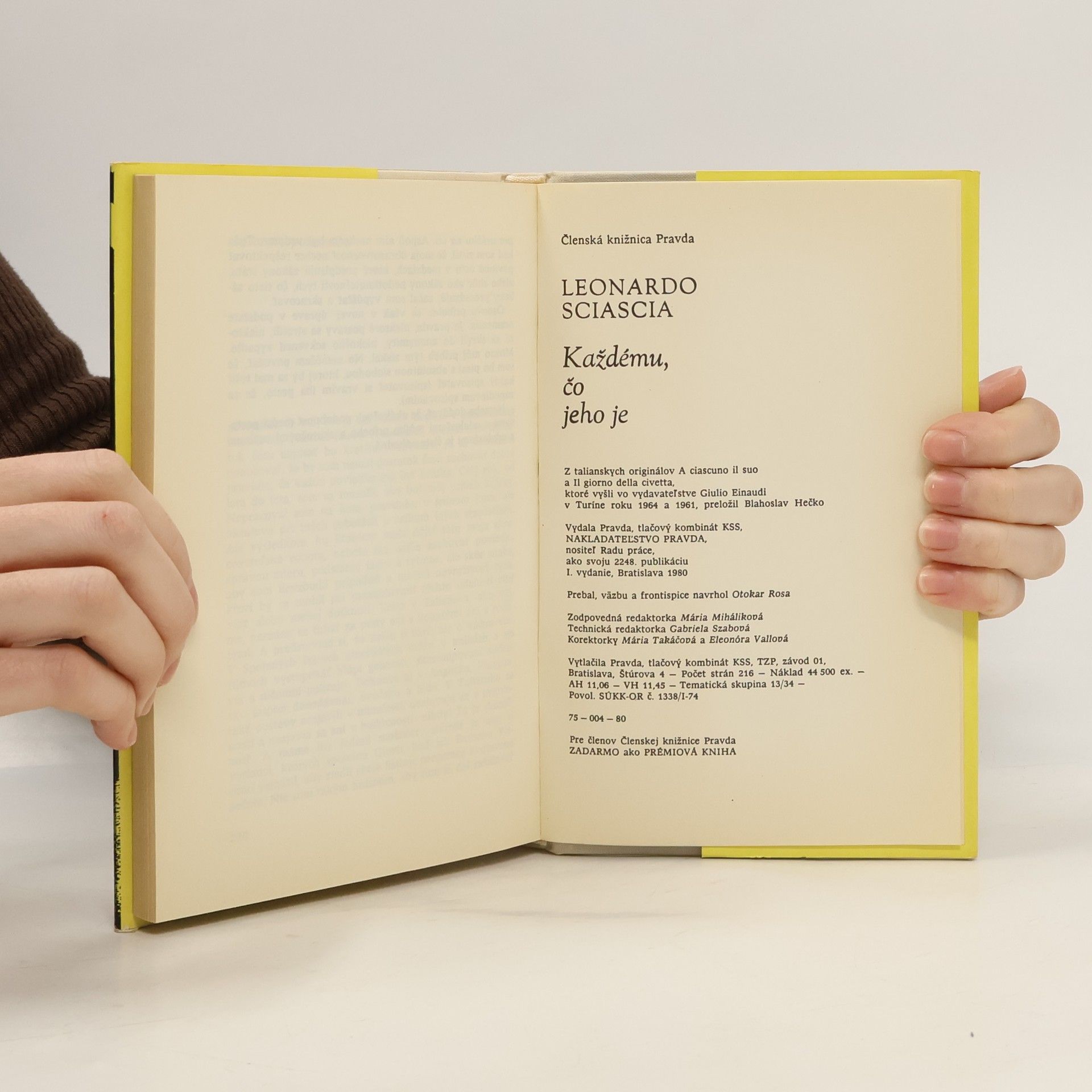 Významný taliansky prozaik, sicílsky rodák Leonardo Sciascia (1921) svojím doterajším dielom vzbudil veľký čitateľský ohlas nielen v Taliansku, ale aj v cudzine. Jeho romány a poviedky, zväčša čerpajúce námety zo Sicílie, sa prekladajú do mnohých jazykov. Ani slovenskému čitateľovi nie jeneznámy: spomeňme detektívny román Todo modo (1974), ktorý vyšiel spolu s výberom svojráznych poviedok pod názvom More vínovej farby. Divácky príťažlivé sú aj filmové verzie Sciasciových románov Deň sovy a Ctihodné mŕtvoly. Detektívne ladené prózy, ktoré vám predkladáme — Každému, čo jeho je (1964) a Deň sovy (1961), patria k tomu najlepšiemu, čo Sciascia napísal. Aj tu — ako v celom diele — rozvíja na malej ploche dramatické príbehy, v ktorých nemilosrdne odhaľuje metódy maskovania tých najväčších zločinov, skorumpovanú políciu a celú právnu džungľu. Hrdinovia príbehov, osamelí obhajcovia spravodlivosti profesor Laurana a odvážny kapitán karabinierov Bellodi majú pátranie po motívoch reťaze vrážd sťažené práve preto, že tajné nitky a spletité zákruty vedú do najvyšších kruhov... Leonardo Sciascia majstrovsky rozohráva detektívnu zápletku, pričom nešetrí komikou a iróniou. Predstavuje nám pestrú paletu svojráznych sicílskych typov, od ustráchaných bedárov po pohlavárov mafie, ktorá už celé desaťročia bašuje na tomto ostrove.