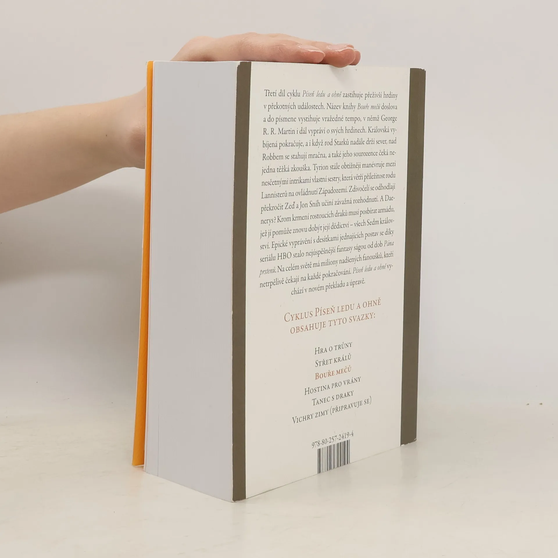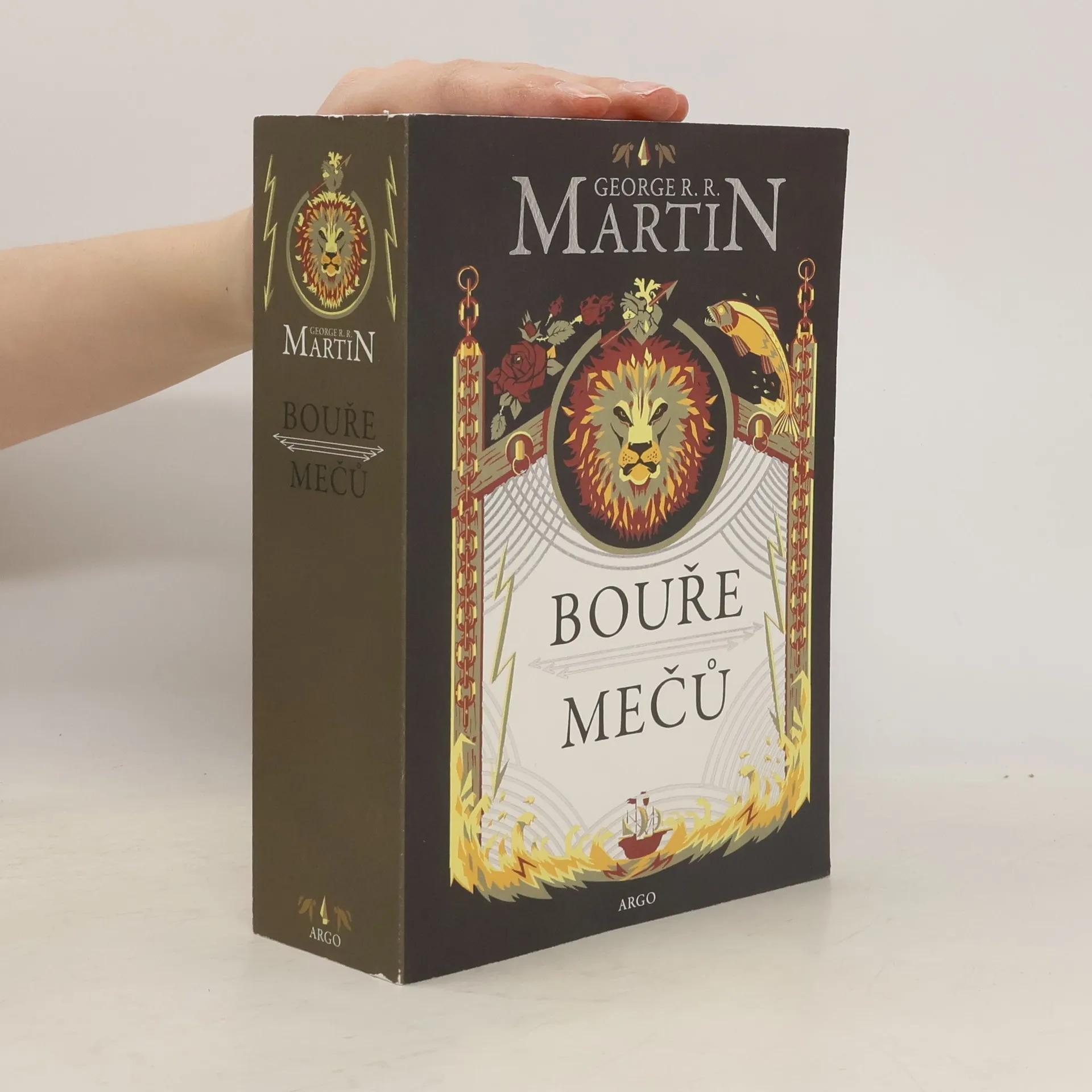 Třetí díl cyklu Píseň ledu a ohně zastihuje přeživší hrdiny v překotných událostech. Název knihy Bouře mečů doslova a do písmene vystihuje vražedné tempo, v němž George R. R. Martin pokračuje ve svém vyprávění. Královská vybíjená pokračuje, a i když rod Starků nadále drží sever, nad Robbem se stahují mračna, a také jeho sourozence čeká nejedna těžká zkouška. Tyrion stále obtížněji manévruje mezi intrikami vlastní sestry, která větří příležitost rodu Lannisterů na ovládnutí Západozemí. Zdivočelí se odhodlají překročit Zeď a Jon Sníh učiní závažná rozhodnutí. A Daenerys? Krom krmení rostoucích draků musí posbírat armádu, jež jí pomůže znovu dobýt její dědictví – všech Sedm království. Epické vyprávění s desítkami jednajících postav se díky seriálu HBO stalo nejúspěšnější fantasy ságou od dob Pána prstenů. Na celém světě má miliony nadšených fanoušků, kteří netrpělivě čekají na každé pokračování. Píseň ledu a ohně vychází v novém překladu a úpravě.