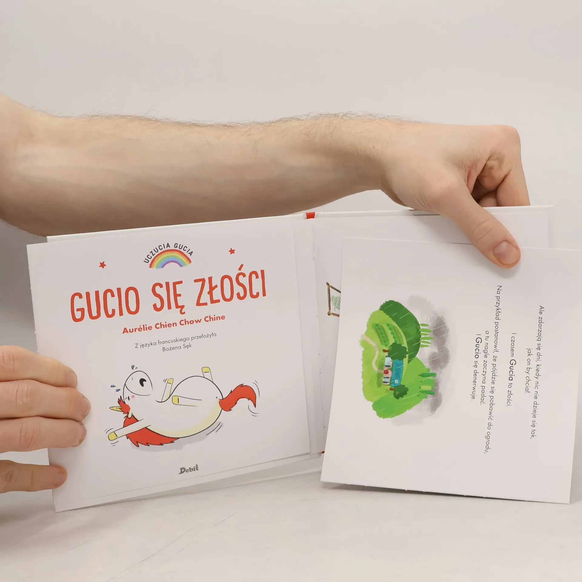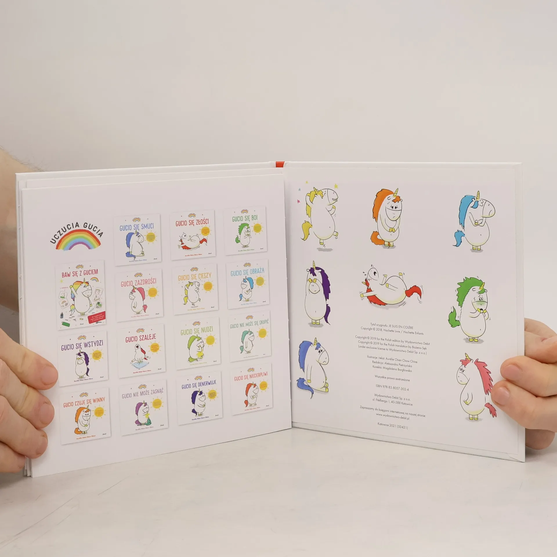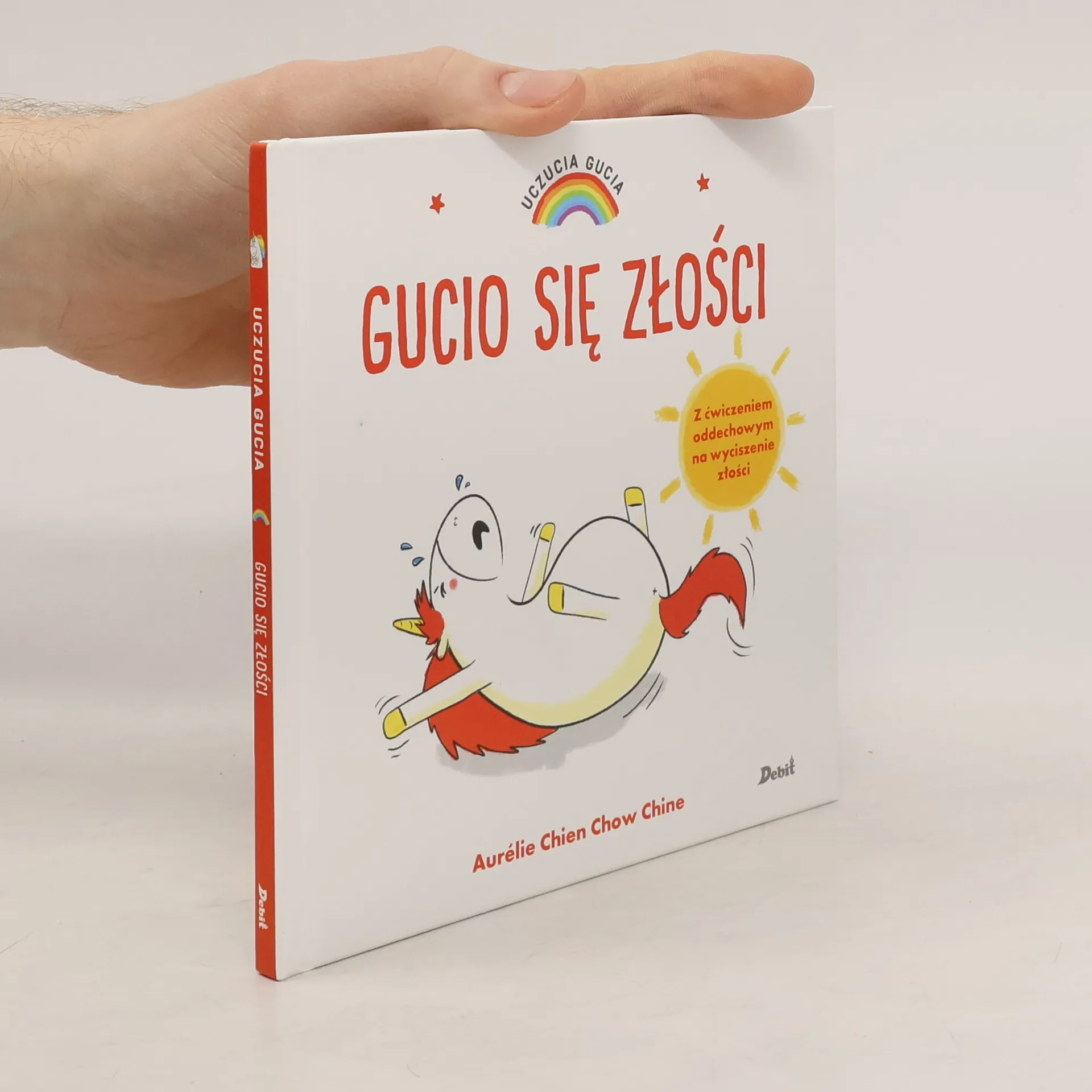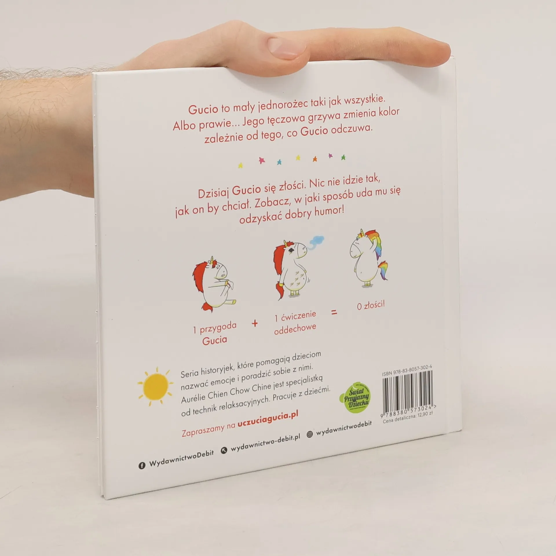 Gucio to maly jednorozec taki jak wszystkie. Albo prawie... Jego teczowa grzywa zmienia kolor zaleznie od tego, co Gucio odczuwa. Dzisiaj Gucio jest zly. Nic nie idzie tak, jak on by chcial. Zobacz, jak uda mu sie odzyskac dobry humor!Nowa seria historyjek, które ucza nazywania emocji i panowania nad nimi. W kazdej ksiazeczce opisano jedno uczucie. Na koncu historyjki znajduja sie bardzo proste cwiczenia, które pomoga dziecku wyciszyc sie i zapanowac nad emocjami.