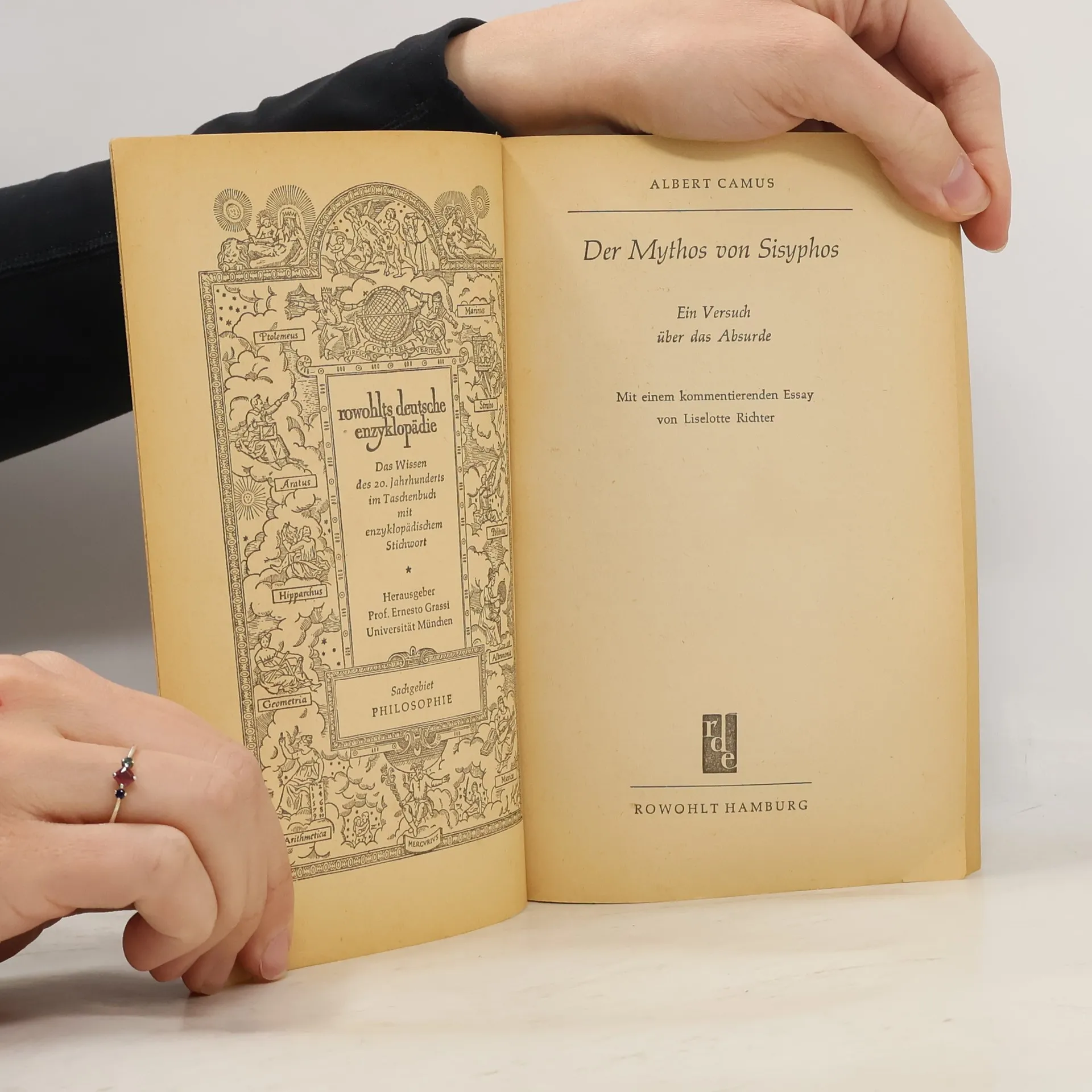 «Der Mythos von Sisyphos» kreist um die zentrale Frage, die Grundfrage auch aller Philosophie, «ob das Leben die Mühe, gelebt zu werden, lohnt oder nicht». Sisyphos steht für den Menschen, der sich seiner wahren Stellung in der Welt und das heißt: seiner absurden Situation bewußt ist. Das «Absurde» bezeichnet die Diskrepanz zwischen dem Menschen und seiner Sehnsucht nach Sinn und Verstehen und dem Schweigen der Welt, ihrer Undurchdringlichkeit und Gleichgültigkeit. Mit dieser Erfahrung stellt Camus die Forderung an den Menschen, dieses Leben und diese Situation ohne Illusionen auszuhalten, aller Transzendenz und allen Trostes zu entraten und eine sich ganz im Diesseits ihren «Sinn» gebende Existenz auf sich zu nehmen, deren «Reich ganz von dieser Welt ist». Allein diese geistige Haltung so Camus verleiht dem Menschen in seiner absurden Situation Würde und Wert: «Wir müssen uns Sisyphos als einen glücklichen Menschen vorstellen.» «Der Mythos von Sisyphos» entstand einige Monate nach dem «Fremden». Camus kommentiert hier philosophisch, was er dort künstlerisch zu fassen versuchte, und vollzieht in diesem frühen Essay den ersten Schritt von der Erfahrung der Absurdität zur mitmenschlichen Revolte, die in seinen folgenden Werken im Mittelpunkt seines Denkens und Gestaltens steht.