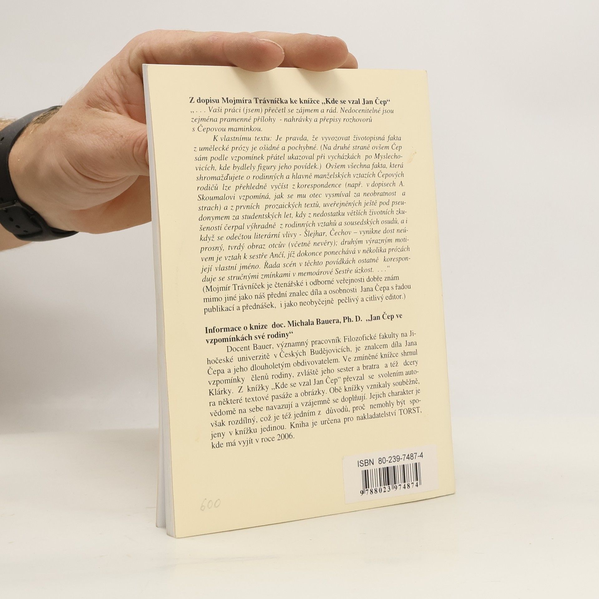 Kniha zaznamenává vzpomínky, pohledy a postřehy z rodinného prostředí rodáka z Myslechovic, spisovatele a esejisty Jana Čepa. Obsahuje také přepisy rozhovorů a fotografie jeho blízkých. Autor, synovec Jana Čepa, přibližuje rodinné zázemí známého katolického spisovatele. Kromě toho jsou tu ve zvukové podobě zachyceny i pozdravy Jana Čepa rodině, namluvené v pařížském exilu v r. 1968. Pečlivě utříděné informace o rodinných poměrech a nejbližších příbuzných katolického spisovatele mohou být užitečným doplňkem ke studiu jeho života. Dotisk r. 2006