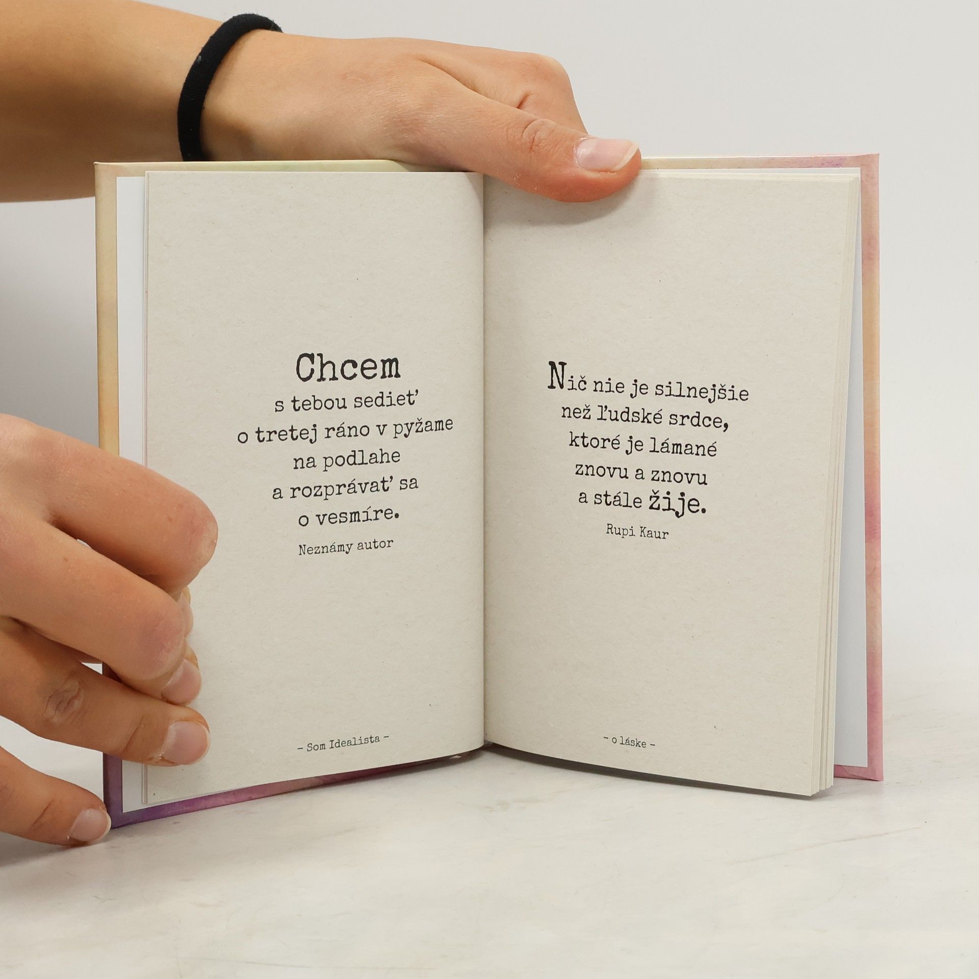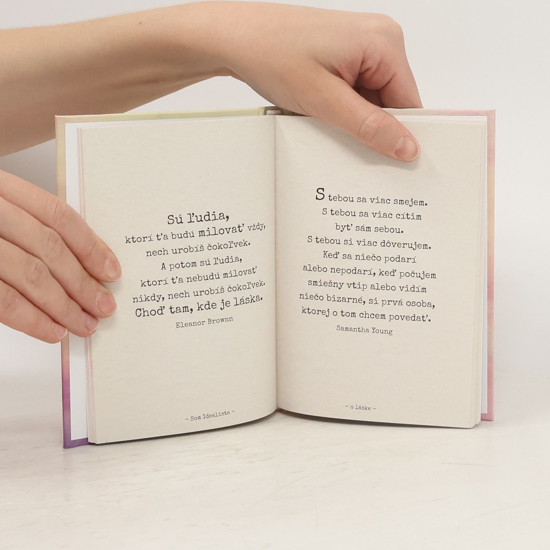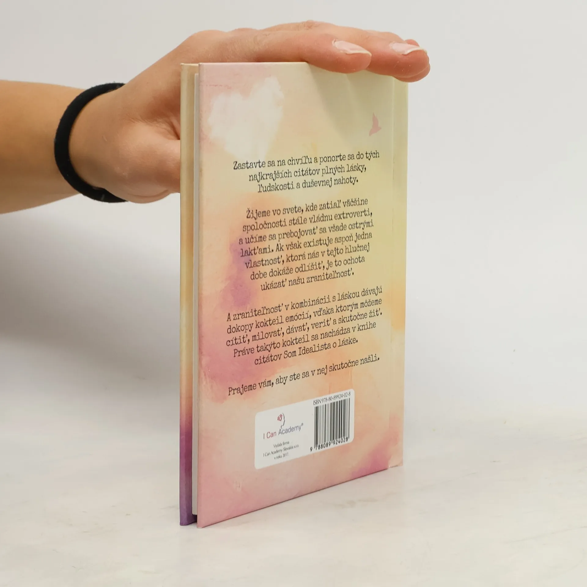 Zastavte sa na chvíľu a ponorte sa do tých najkrajších citátov plných lásky, ľudskosti a duševnej nahoty. Žijeme vo svete, kde zatiaľ väčšine spoločnosti stále vládnu extroverti, a učíme sa prebojovať sa všade ostrými lakťami. Ak však existuje aspoň jedna vlastnosť, ktorá nás v tejto hlučnej dobe dokáže odlíšiť, je to ochota ukázať našu zraniteľnosť. A zraniteľnosť v kombinácii s láskou dávajú dokopy kokteil emócií, vďaka ktorým môžeme cítiť, milovať, dávať, veriť a skutočne žiť. Práve takýto kokteil sa nachádza v knihe citátov Som Idealista o láske. Prajeme vám, aby ste sa v nej skutočne našli. PS: Kamkoľvek vás láska vo vašom živote zavedie, dôverujte jej a nechajte sa viesť. V knihe nájdete výber najlepších myšlienok a citátov o láske zo stránky Som Idealista na Facebooku.
