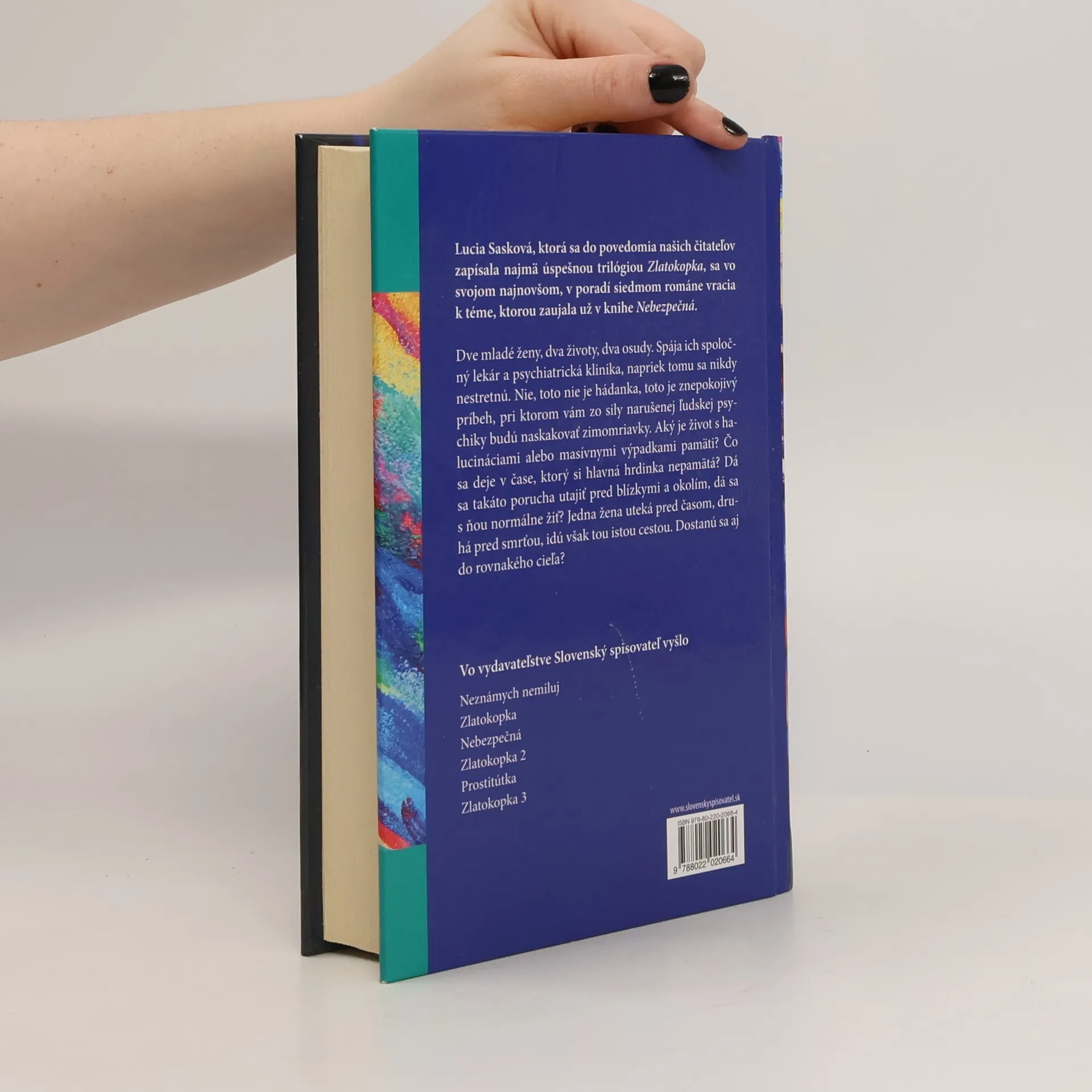 Autorka, ktorá sa do povedomia čitateľov zapísala najmä úspešnou trilógiou Zlatokopka, sa vo svojom najnovšom, v poradí siedmom románe vracia k téme, ktorou zaujala už v knihe Nebezpečná. Dve mladé ženy, dva životy, dva osudy. Spája ich spoločný lekár a psychiatrická klinika, napriek tomu sa nikdy nestretnú. Nie, toto nie je hádanka,toto je znepokojivý príbeh, pri ktorom vám zo sily narušenej ľudskej psychiky budú naskakovať zimomriavky. Aký je živots halucináciami alebo masívnymi výpadkami pamäti? Čo sa deje v čase, ktorý si hlavné hrdinky nepamätajú? Dá sa takáto porucha utajiť pred blízkymi a okolím, dá sa s ňou normálne žiť? Jedna žena uteká pred pravdou, druhá pred smrťou, idú však tou istou cestou. Dostanú sa do rovnakého cieľa?