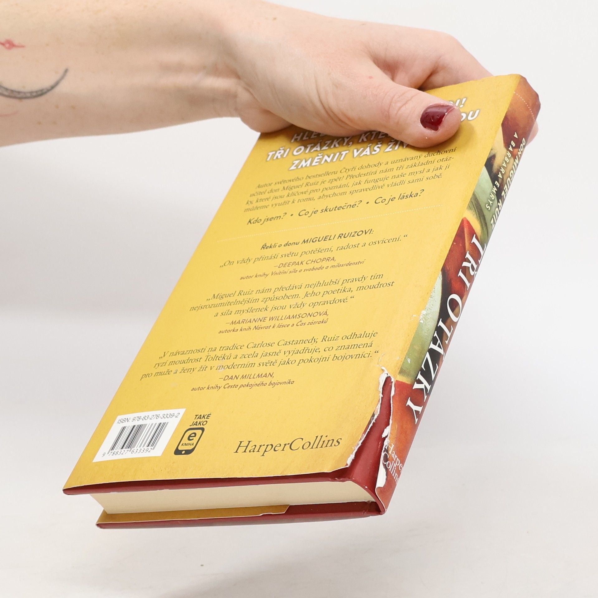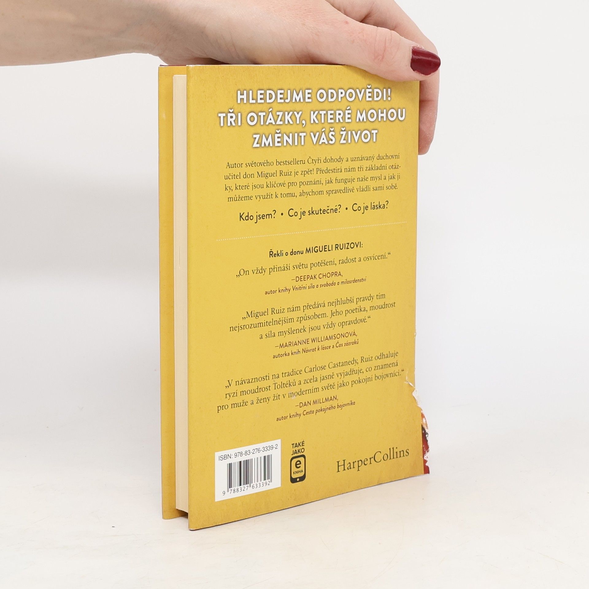 Hledejme odpovědi. Tři otázky, které mohou změnit váš život. • Kdo jsem? • Co je skutečné? • Co je láska? Autor světového bestselleru Čtyři dohody a uznávaný duchovní učitel don Miguel Ruiz nám předkládá tři základní otázky, které jsou klíčové pro poznání, jak funguje naše mysl a jak ji můžeme využít k tomu, abychom spravedlivě vládli sami sobě. Prostřednictvím těchto jednoduchých, ale nanejvýš důležitých otázek Miguel Ruiz postupně odkrývá nejrůznější klamy a sebeklamy, jimiž jako jednotlivci i jako lidstvo podléháme a jež jsou permanentním ( a podle všeho zbytečným) zdrojem naší duševní a tělesné nepohody či dokonce až utrpění.