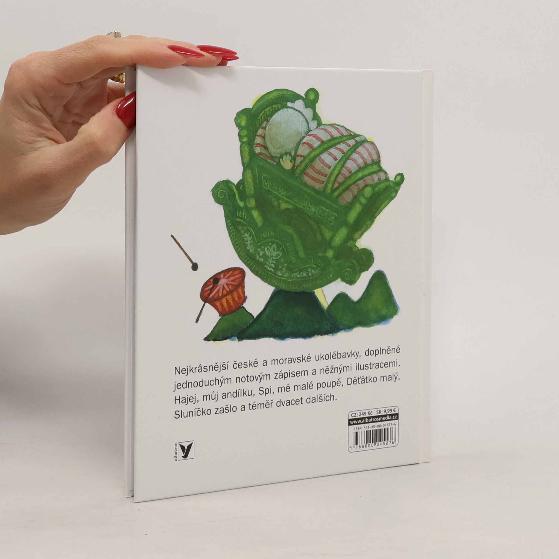 Nejkrásnější české a moravské ukolébavky doplněné jednoduchým notovým zápisem a něžnými ilustracemi. Hajej, můj andílku, Spi, mé malé poupě, Děťátko malý, Sluníčko zašlo a téměř dvacet dalších. Ideální dárek k narození miminka!