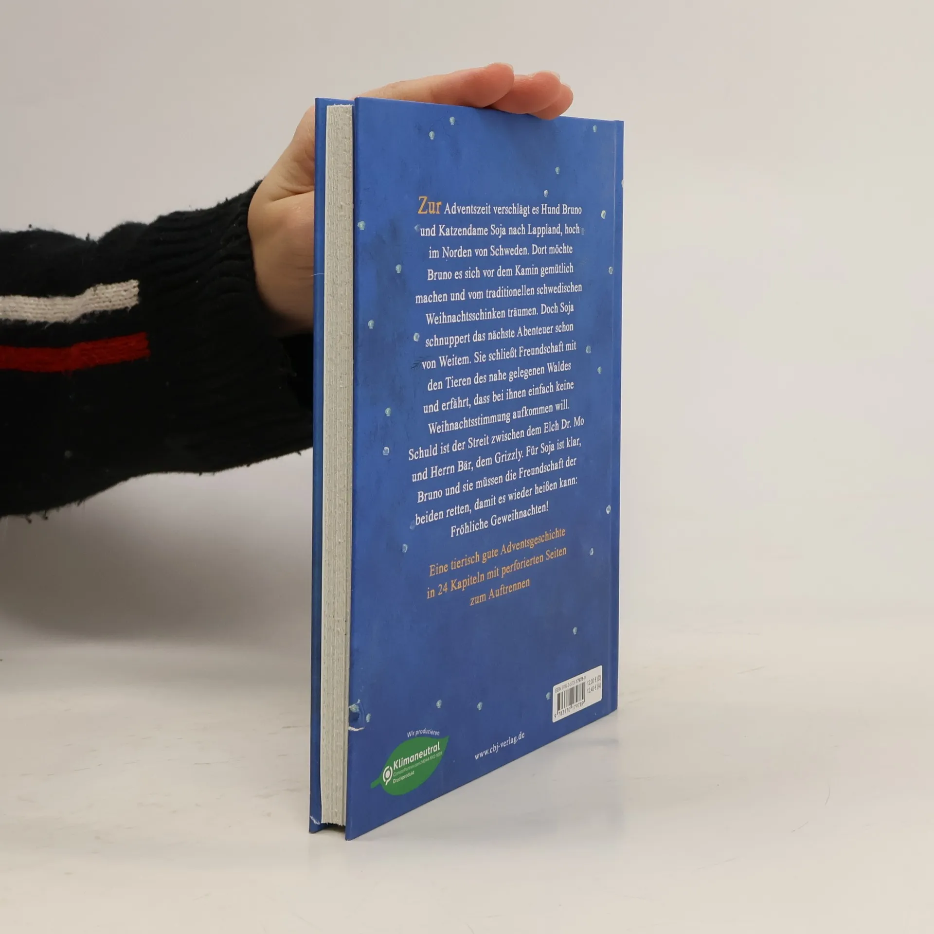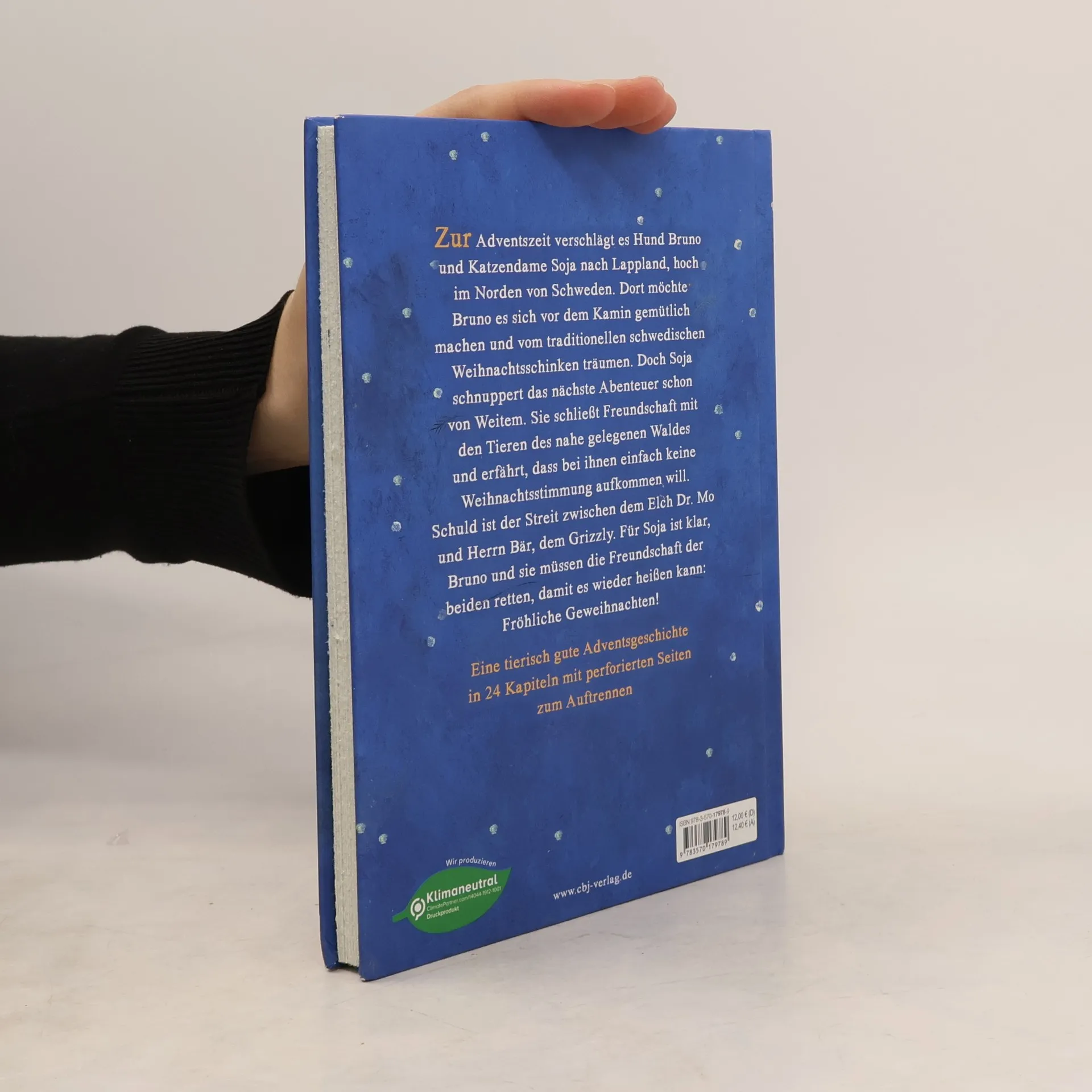Fröhliche Geweihnachten und God Jul! Zur Adventszeit verschlägt es Hund Bruno und Katzendame Soja in diesem Jahr nach Lappland, hoch im Norden von Schweden. Brunos Herrchen muss dort arbeiten und hat einfach alle mitgenommen. Bruno möchte es sich vor dem Kamin gemütlich machen und vom traditionellen schwedischen Weihnachtsschinken träumen, doch Soja schnuppert das nächste Abenteuer schon von Weitem. Schnell schließt sie Freundschaft mit den Tieren des nahe gelegenen Waldes und erfährt, dass bei ihnen einfach keine Weihnachtsstimmung aufkommen will. Schuld ist der Streit zwischen dem Elch Dr. Mo und Herr Bär, dem Grizzly. Für Soja ist klar: Bruno und sie müssen die Freundschaft der beiden retten, damit es wieder heißen kann: Fröhliche Geweihnachten! Ein tierisch gutes Adventskalenderbuch in 24 Kapiteln mit perforierten Seiten zum Auftrennen - das perfekte Wichtelgeschenk für Kinder ab 8 Jahren. Außerdem erschienen: Zwei Schnäuzchen und vier Weihnachtswünsche - Das Bilderbuch zur Schnauze-Reihe Ausstattung: Mit s/w Illustrationen