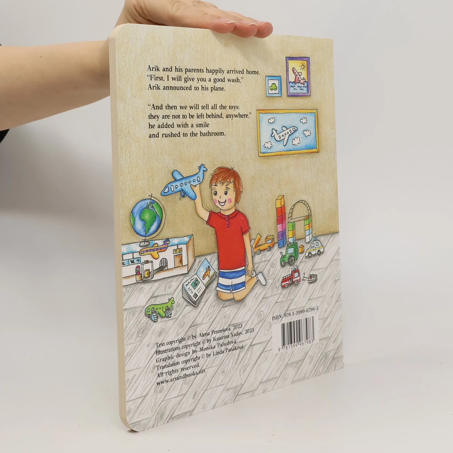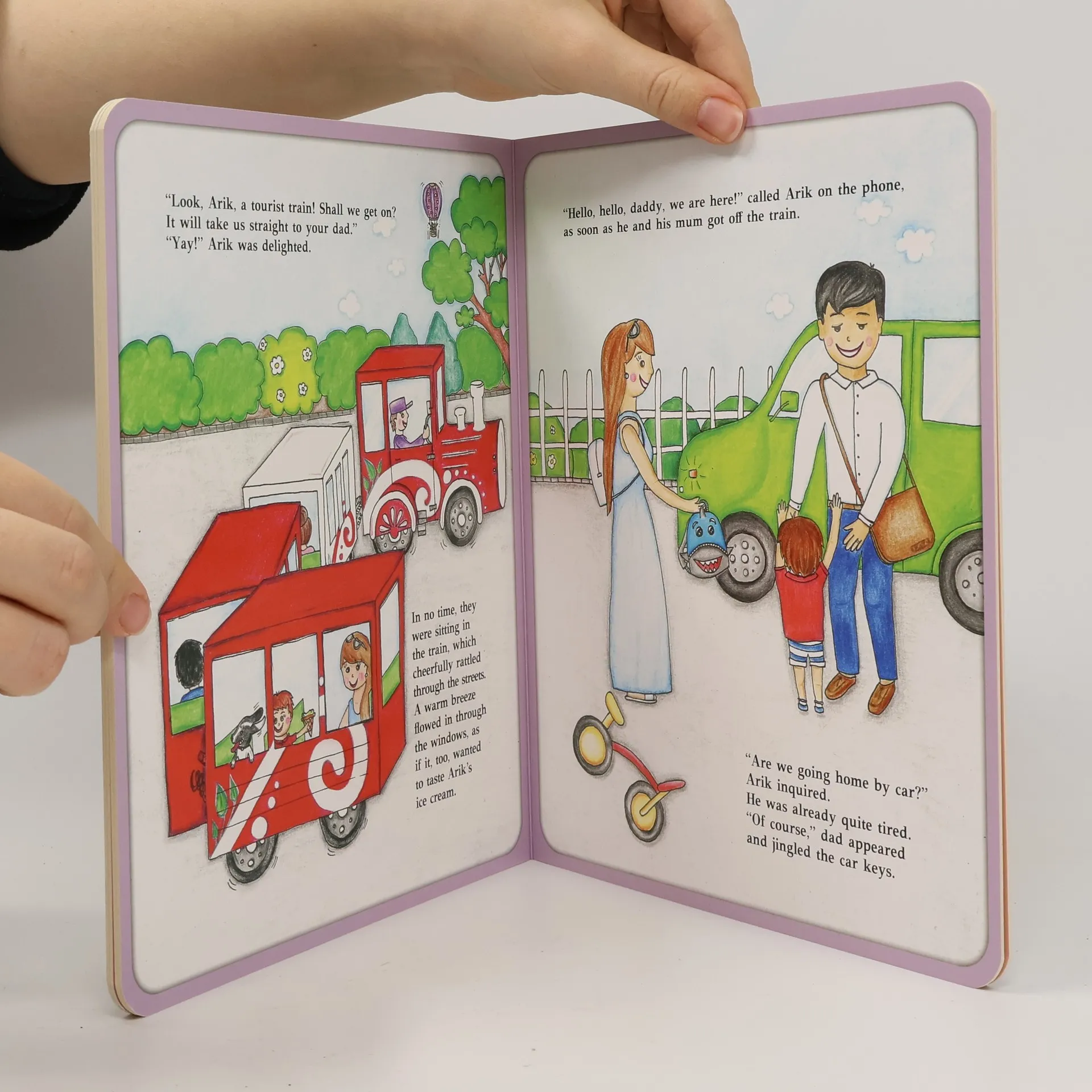 Arik is looking forward to today’s trip. So, he packs his favourite aeroplane. Together with his mommy they first visit the park, where Arik plays with children, from there they get an ice cream and also hop on a tourist train which takes them straight to Arik’s daddy. Thanks to Daddy, Arik remembers his aeroplane. It was left in the park on the sandpit. Arik is worried if the aeroplane will still be there. Luckily, with the help of his parents he finds the aeroplane and they all return home satisfied and happy.