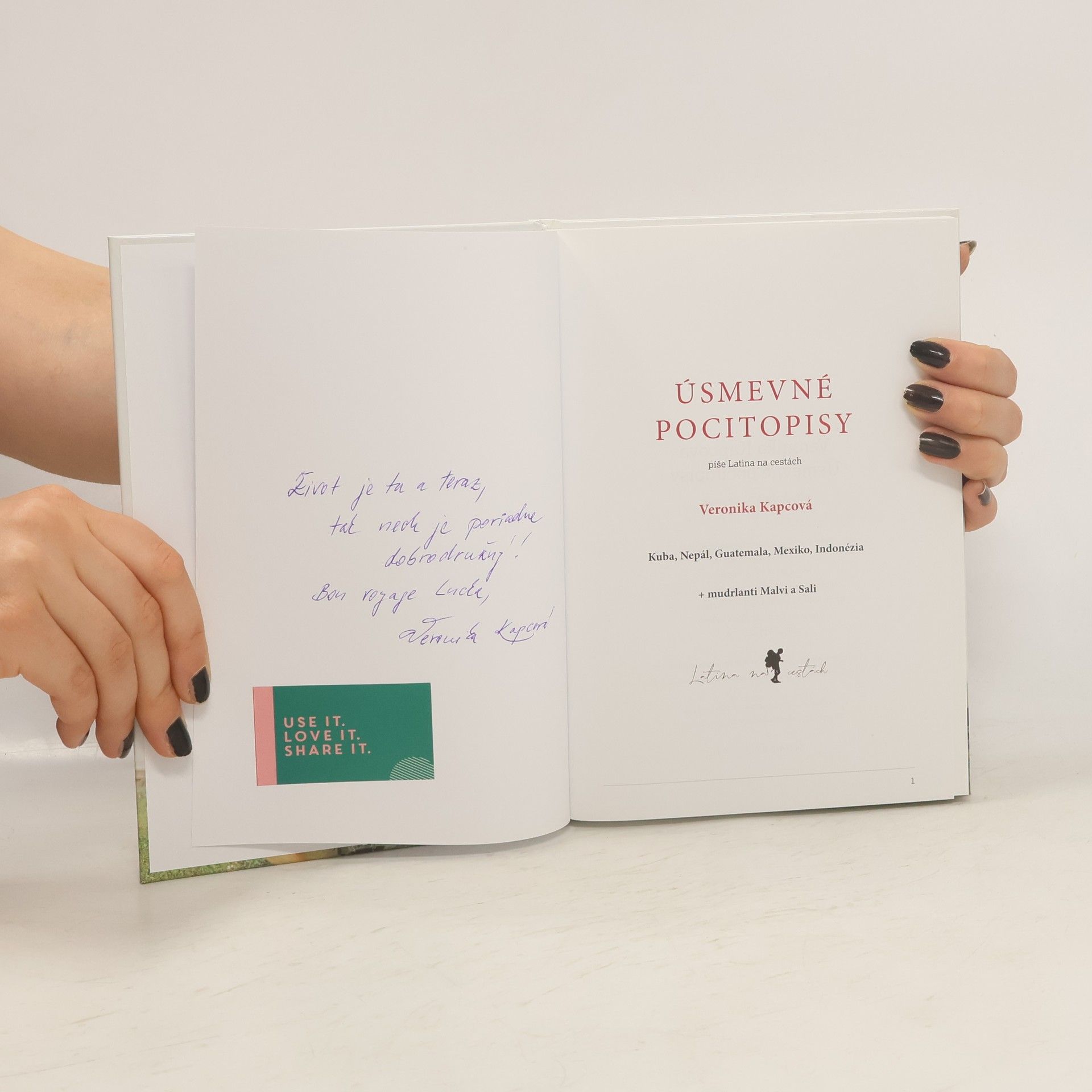 Predstavte si, že sa usmievate, smejete a zároveň sa dozvedáte o piatich exotických krajinách - Kuba, Nepál, Guatemala, Mexiko, Indonézia. Autorka, milovníčka dobrodružstiev a latino kultúry, rozdáva dobrú náladu prostredníctvom svojho cestovateľského projektu. Žila v Ekvádore, navštívila 80 krajín a má talent prebúdzať dobrodružnú dušu v ľuďoch. Tých, ktorí cestujú z pohodlia domova, prenesie do ďalekých krajín svojimi fotografiami a úsmevným písaním. Prvé riadky jej pocitopisov vznikli už v roku 2006 na prvej sólo ceste po juhovýchodnej Ázii, keď ešte netušila, že sa stáva „blogerom“ bez moderných technológií. Každý deň posielala e-maily svojej VIP skupine – rodine a priateľom, ktorí chceli čítať viac, aj keď nemala ich súhlas. V tejto knihe nazriete do piatich krajín, ktoré navštívila so svojimi parťákmi. Nečakajte historické fakty či presné časy odchodov autobusov; autorka ponúka úsmevné pocit(y)opisy a tipy, ako cestovať za babku. Dôležité upozornenie: ak ste zaočkovaní proti smiechu a dobrej nálade, čítanie môže mať minimálny účinok.