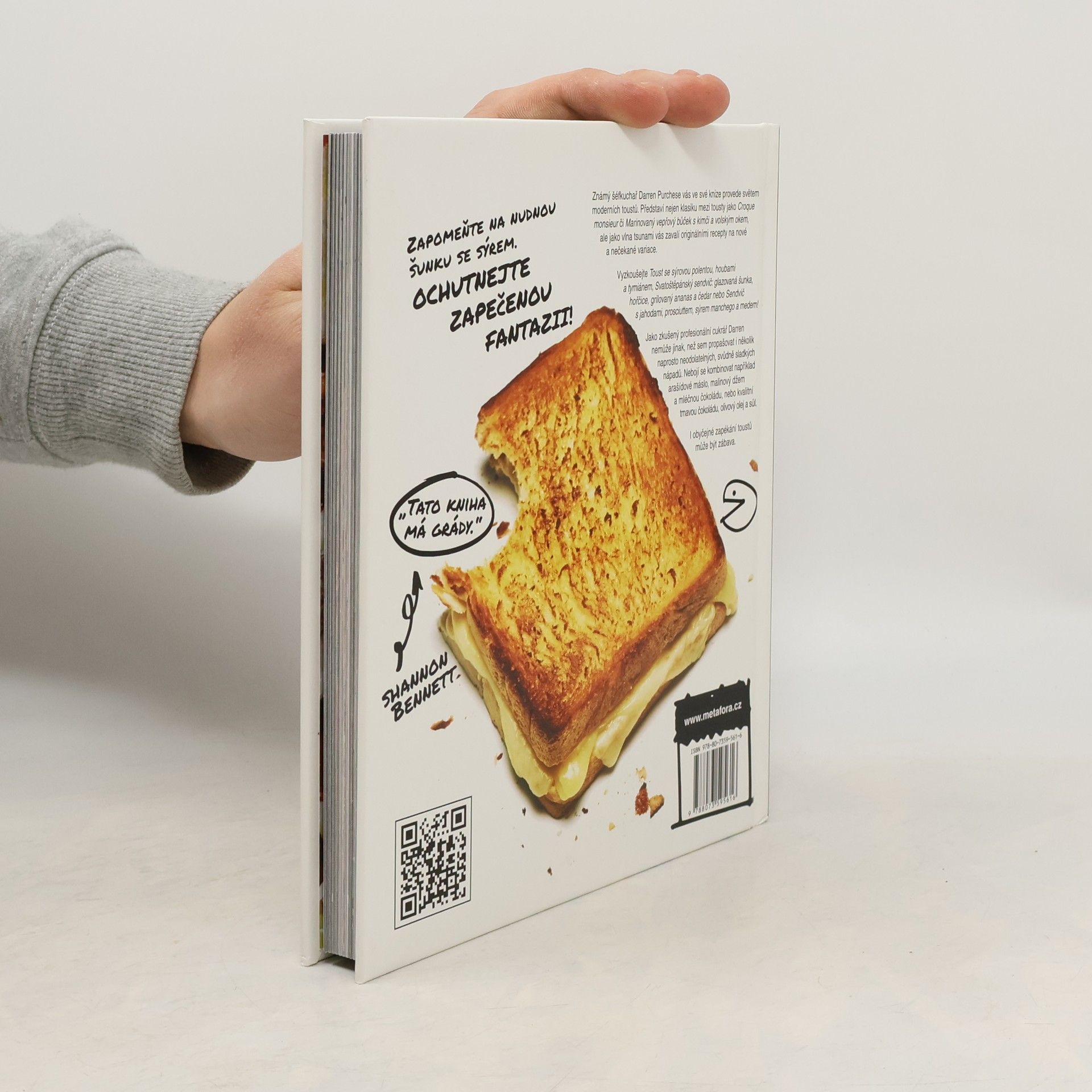Známý šéfkuchař Darren Purchese vás ve své knize provede světem moderních toustů. Představí nejen klasiku mezi tousty jako Croque monsieur či Marinovaný vepřový bůček s kimči a volským okem, ale jako vlna tsunami vás zavalí originálními recepty na nové a nečekané variace. Vyzkoušejte Toust se syrovou polentou, houbami a tymiánem, Svatoštěpánský sendvič: glazovaná šunka, hořčice, grilovaný ananas a čedar nebo Sendvič s jahodami, prosciuttem, sýrem manchego a medem! Jako zkušený profesionální cukrář Darren nemůže jinak, než sem propašovat i několik naprosto neodolatelných, svůdně sladkých nápadů. Nebojí se kombinovat například arašídové máslo, malinový džem a mléčnou čokoládu, nebo kvalitní tmavou čokoládu, olivový olej a sůl.