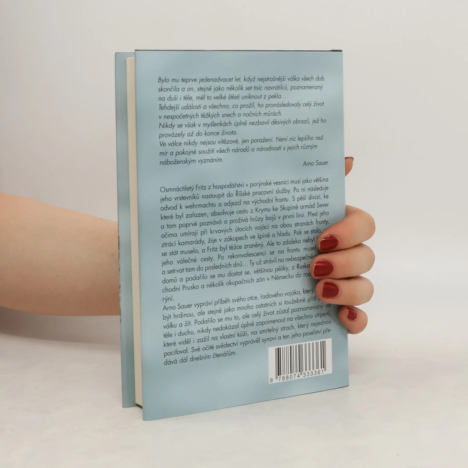 Osmnáctiletý Fritz z hospodářství v porýnské vesnici musí jako většina jeho vrstevníků nastoupit do Říšské pracovní služby. Po ní následuje odvod k wehrmachtu a odjezd na východní frontu. S pěší divizí, ke které byl zařazen, absolvuje cestu z Krymu ke Skupině armád Sever a tam poprvé poznává a prožívá hrůzy bojů v první linii. Před jeho očima umírají při krvavých útocích vojáci na obou stranách fronty, ztrácí kamarády, žije v zákopech ve špíně a hladu. Pak se stalo, co se stát muselo, a Fritz byl těžce zraněný. Ale to zdaleka nebyl konec jeho válečné cesty. Po rekonvalescenci se na frontu musel vrátit a setrvat tam do posledních dnů… Ty už strávil na nebezpečném útěku domů a podařilo se mu dostat se, většinou pěšky, z Ruska přes Východní Prusko a několik okupačních zón v Německu do rodného Porýní. Arno Sauer vypráví příběh svého otce, řadového vojáka, který nechtěl být hrdinou, ale stejně jako mnoho ostatních si toužebně přál přežít válku a žít. Podařilo se mu to, ale celý život zůstal poznamenaný na těle i duchu, nikdy nedokázal úplně zapomenout na všechno utrpení, které viděl i zažil na vlastní kůži, na smrtelný strach, který nejednou pociťoval. Své očité svědectví vyprávěl synovi a ten jeho poselství předává dál dnešním čtenářům.