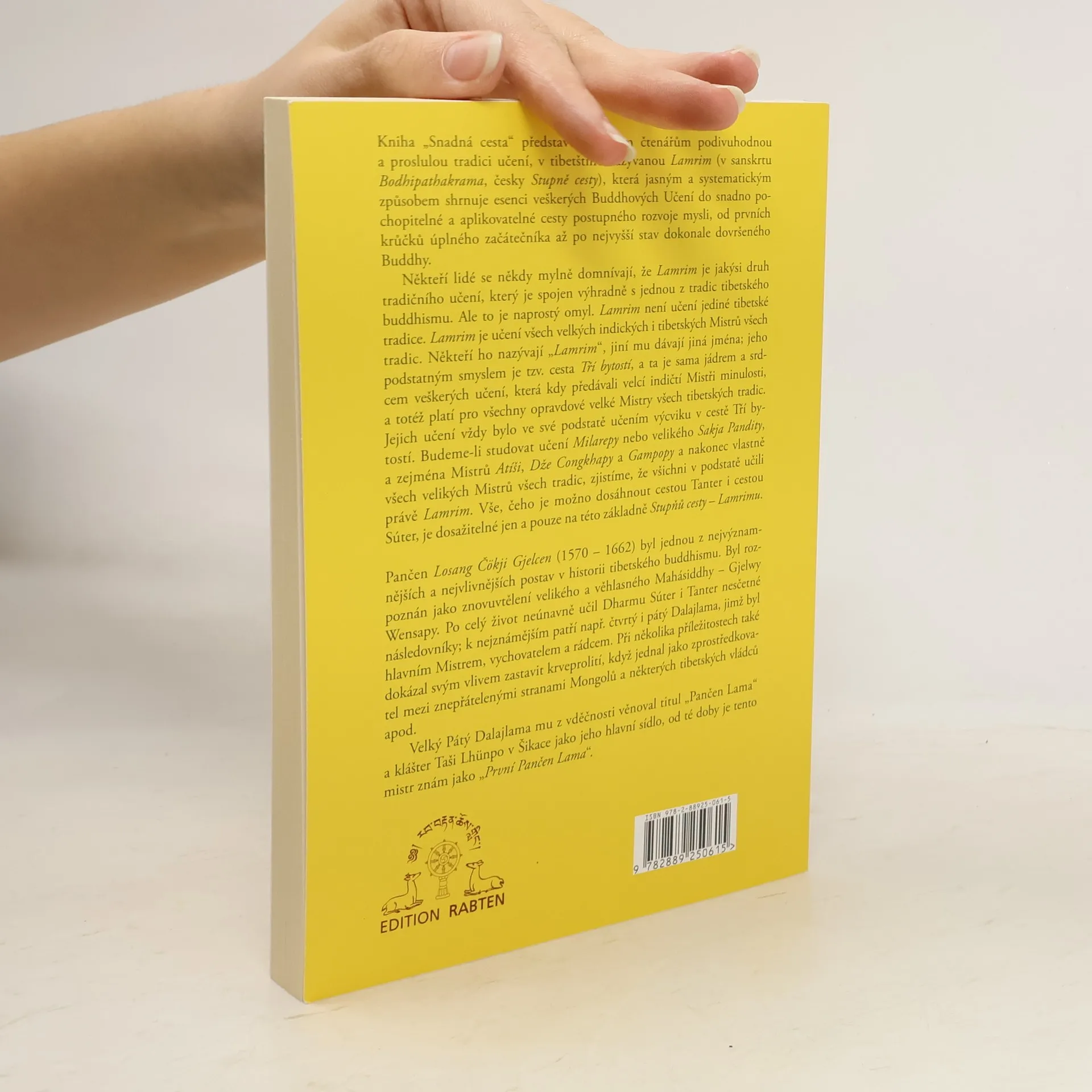 Kniha „Snadná cesta“ přibližuje českým čtenářům tradici učení nazývanou Lamrim, která systematicky shrnuje esenci Buddhových učení do snadno pochopitelné cesty rozvoje mysli. Tato cesta vede od začátečníka k dokonale dovršenému Buddhovu stavu. Lamrim není spojen pouze s jednou tibetskou tradicí, ale je učením všech významných indických a tibetských Mistrů. Jeho podstatou je cesta Tří bytostí, která tvoří jádro učení předávaného velkými Mistry minulosti. Studováním učení jako Milarepy nebo Sakja Pandity zjistíme, že všichni učili Lamrim. Cíle dosažené skrze Tantry a Sútry jsou možné pouze na základě Stupňů cesty – Lamrimu. Pančen Losang Čökji Gjelcen, významná postava tibetského buddhismu, byl znovuvtělením Mahásiddhy Gjelwy Wensapy a celý život učil Dharmu nesčetné množství následovníků, včetně čtvrtého a pátého Dalajlamy. Jeho vliv pomohl zastavit krveprolití mezi Mongoly a tibetskými vládci. Velký Pátý Dalajlama mu udělil titul „Pančen Lama“ a klášter Taši Lhünpo v Šikace jako jeho hlavní sídlo, čímž se stal známým jako „První Pančen Lama“.