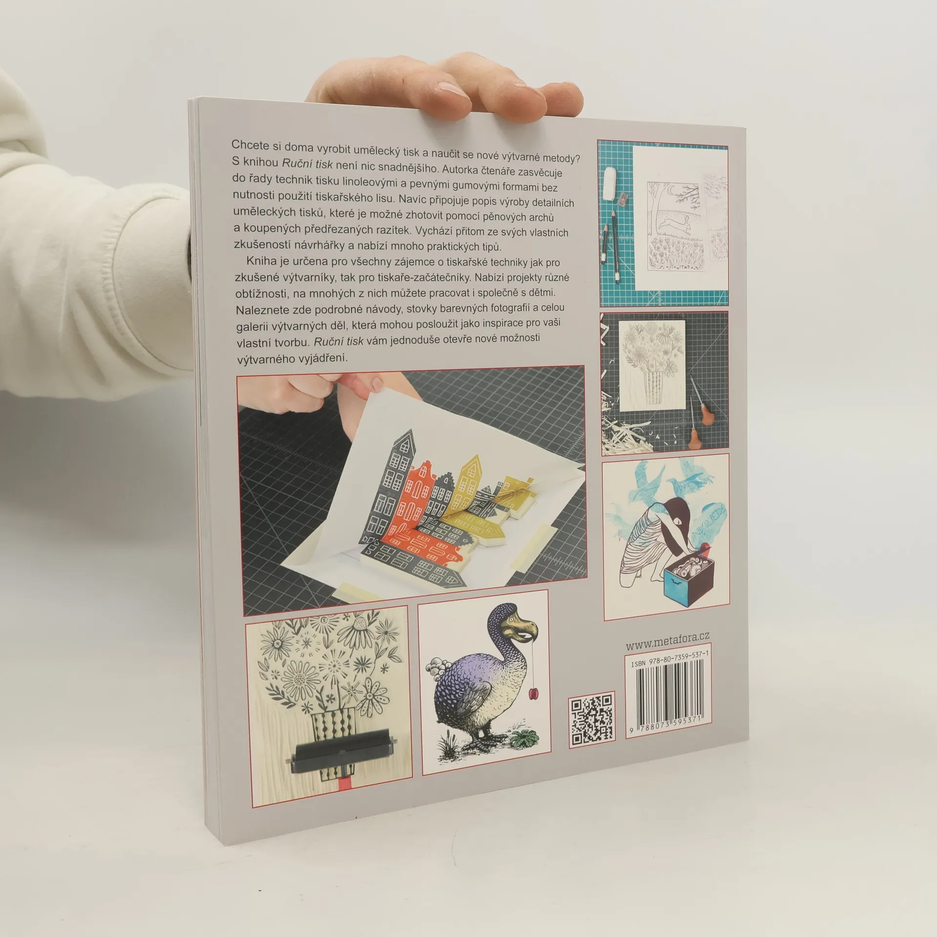 Umělecký tisk linoleovou a gumovou formou, z pěnových archů a pomocí razítkových sad. Chcete si doma vyrobit umělecký tisk a poznat nové výtvarné metody? S knihou Ruční tisk není nic snadnějšího. Autorka čtenáře zasvěcuje do řady technik tisku linoleovými a pevnými gumovými formami bez nutnosti použití tiskařského lisu. Navíc připojuje popis výroby detailních uměleckých tisků, které je možné zhotovit pomocí pěnových archů a koupených předřezaných razítek. Vychází přitom ze svých vlastních návrhářských zkušeností a nabízí mnoho praktických tipů. Kniha je určena jak pro tiskaře-začátečníky, tak pro zkušené výtvarníky a všechny zájemce o tiskařské techniky. Nabízí projekty různé obtížnosti, na mnohých z nich můžete pracovat i společně s dětmi. Naleznete zde podrobné návody, stovky barevných fotografií a celou galerii výtvarných děl, která mohou posloužit jako inspirace pro vaši vlastní tvorbu. Ruční tisk vám jednoduše otevře nové možnosti výtvarného vyjádření.