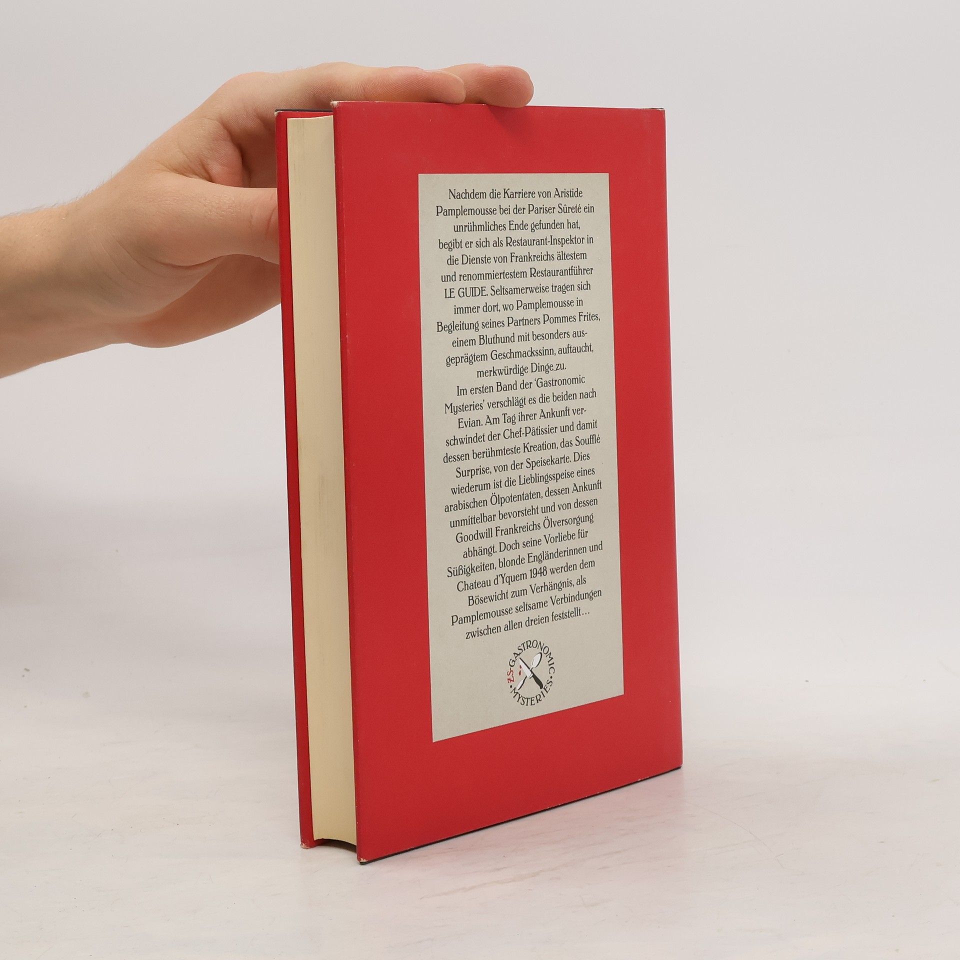 Ein Kriminalroman für Feinschmecker mit vielen Rezepten von Paul Bocuse, Michel Guérard, Vincent Klink, Pierre & Jean Troisgros und Roger Vergé. Nachdem die Karriere von Aristide Pamplemousse bei der Parise Sûreté ein unrühmliches Ende gefunden hat, begibt er sich als Restaurant-Inspektor in die Dienste von Frankreichs ältestem und renommiertesten Restaurantführer Le Guide. Seltsamerweise tragen sich immer dort, wo Pamplemousse in Begleitung seines Partners Pommes Frites, einem Bluthund mit besonders ausgeprägtem Geschmackssinn, auftaucht, merkwürdige Dinge zu. Im ersten Band der ‘Gastronomic Mysteries’ verschlägt es die beiden nach Evian. Am Tag ihrer Ankunft verschwindet der Chef-Patissier und damit dessen berühmteste Kreation, das Soufflé Surprise, von der Speisekarte. Dies wiederum ist die Lieblingsspeise eines arabischen Ölpotentaten, dessen Ankunft unmittelbar bevorsteht und von dessen Goodwill Frankreichs Ölversorgung abhängt. Doch seine Vorliebe für Süßigkeiten, blonde Engländerinnen und Chateau d’Yquem 1948 werden dem Bösewicht zum Verhängnis, als Pamplemousse seltsame Verbindungen zwischen allen dreien feststellt…