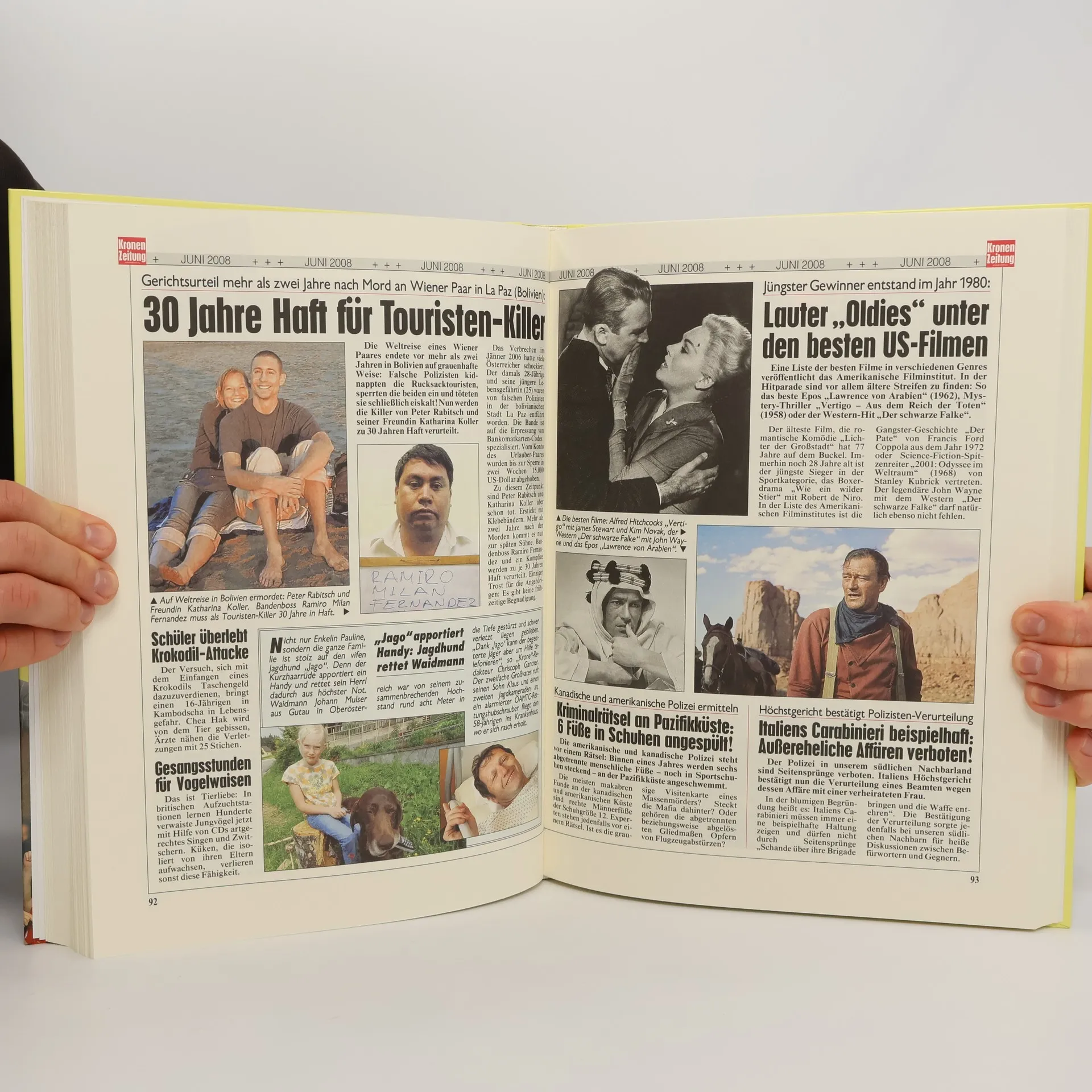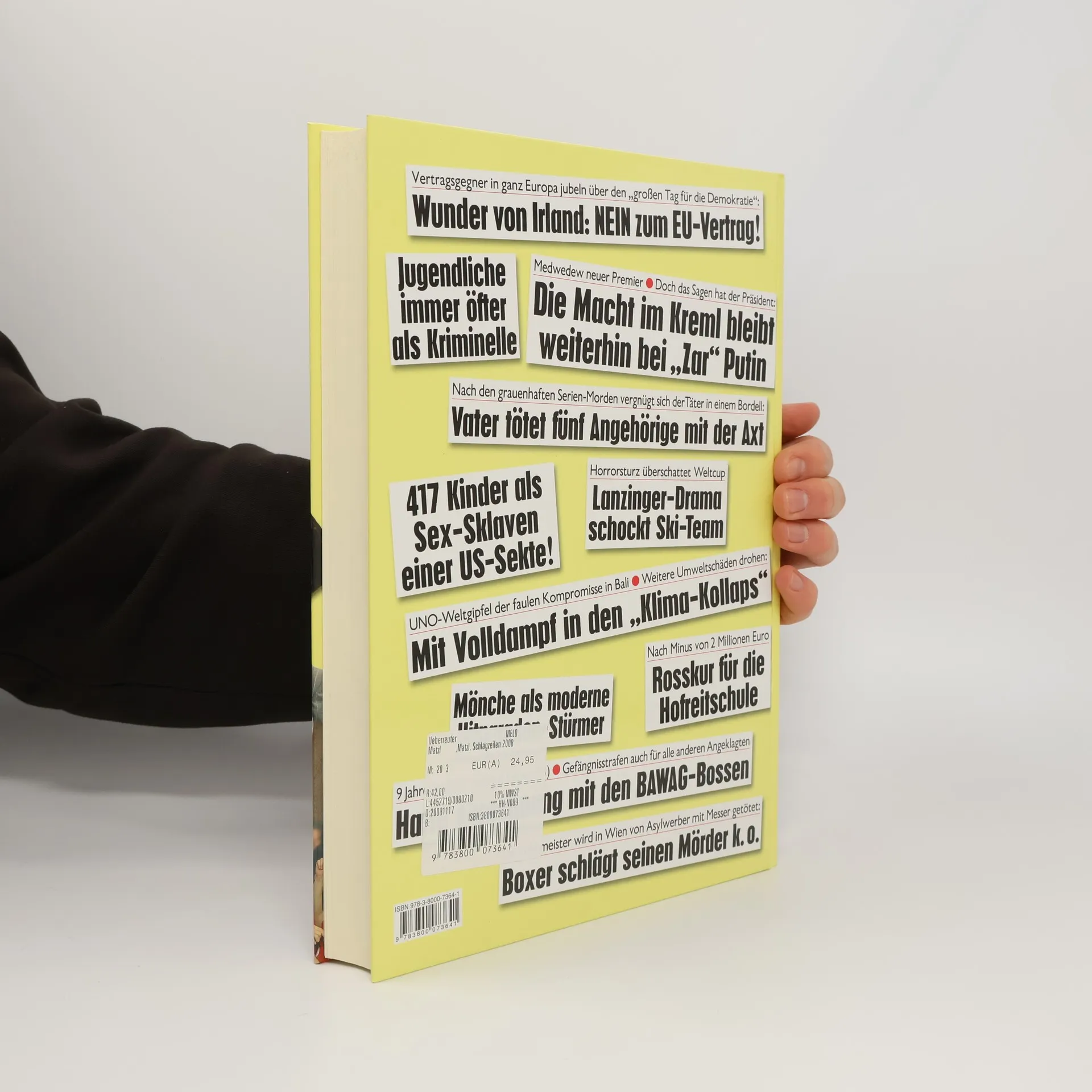 Entführungsdramen wie die Ermordung des "Irak-Söldners" Bert Nussbaumer oder das Bangen um die Salzburger Wüsten-Geiseln schockierten die Menschen. Und auch die steigende Inflation und der Klimawandel verängstigten gleich zu Beginn des Jahres 2008 viele Menschen. Aber es gab auch heuer wieder viele Lichtblicke! Vom weltmeisterlichen Triumph unseres Schwimmstars Markus Rogan bis zur völkerverbindenden Sportbegeisterung während der EURO. Und jede Menge pikanter "Adabei"-Geschichten … Alles in allem 160 Seiten Zeitgeschichte mit den besten Fotos des Jahres.