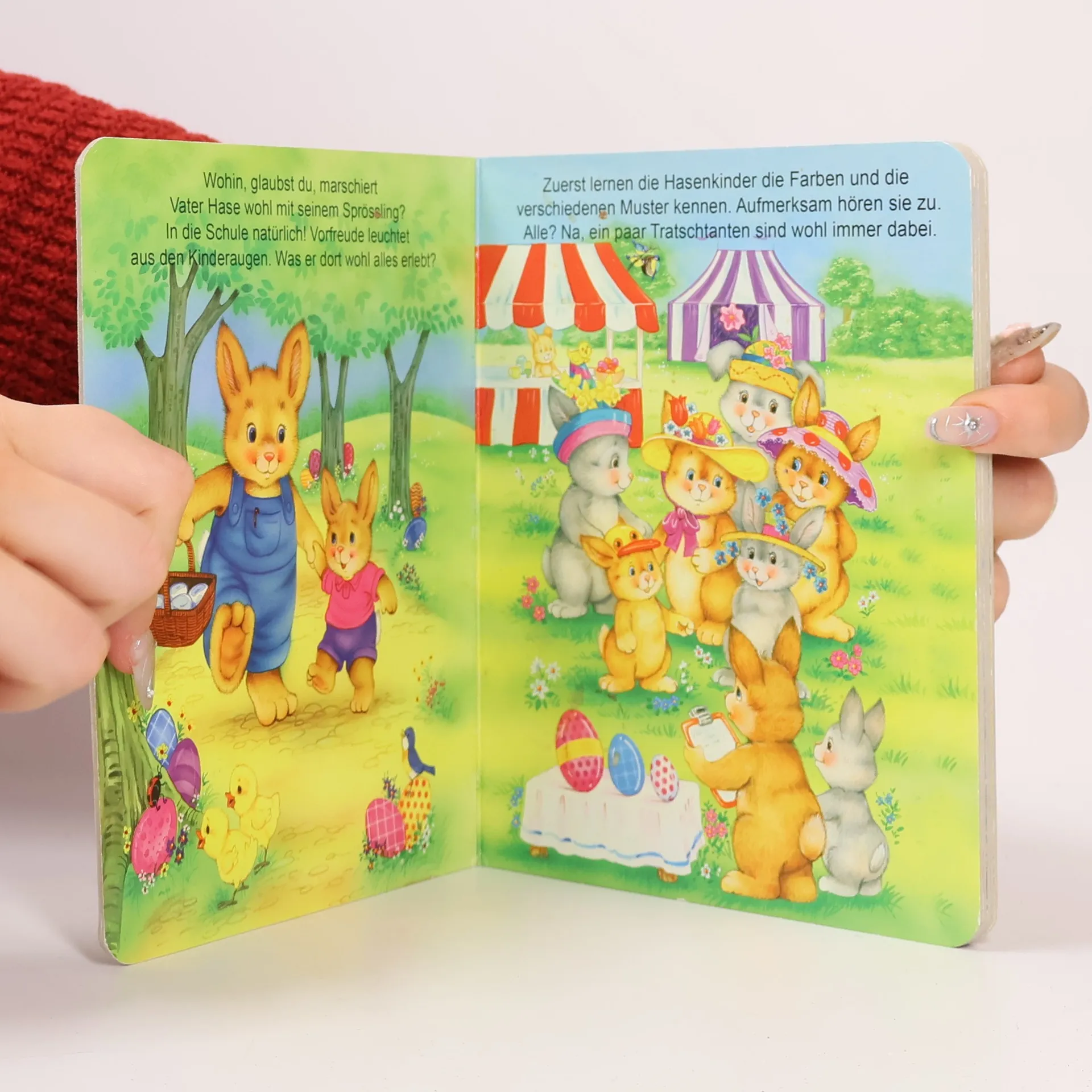 Wohin, glaubst du, marschiert Vater Hase wohl mit seinem Sprössling?In die Schule naturlich!***Die Hasenkinder lernen die Farben, und Ostereier bemalen.