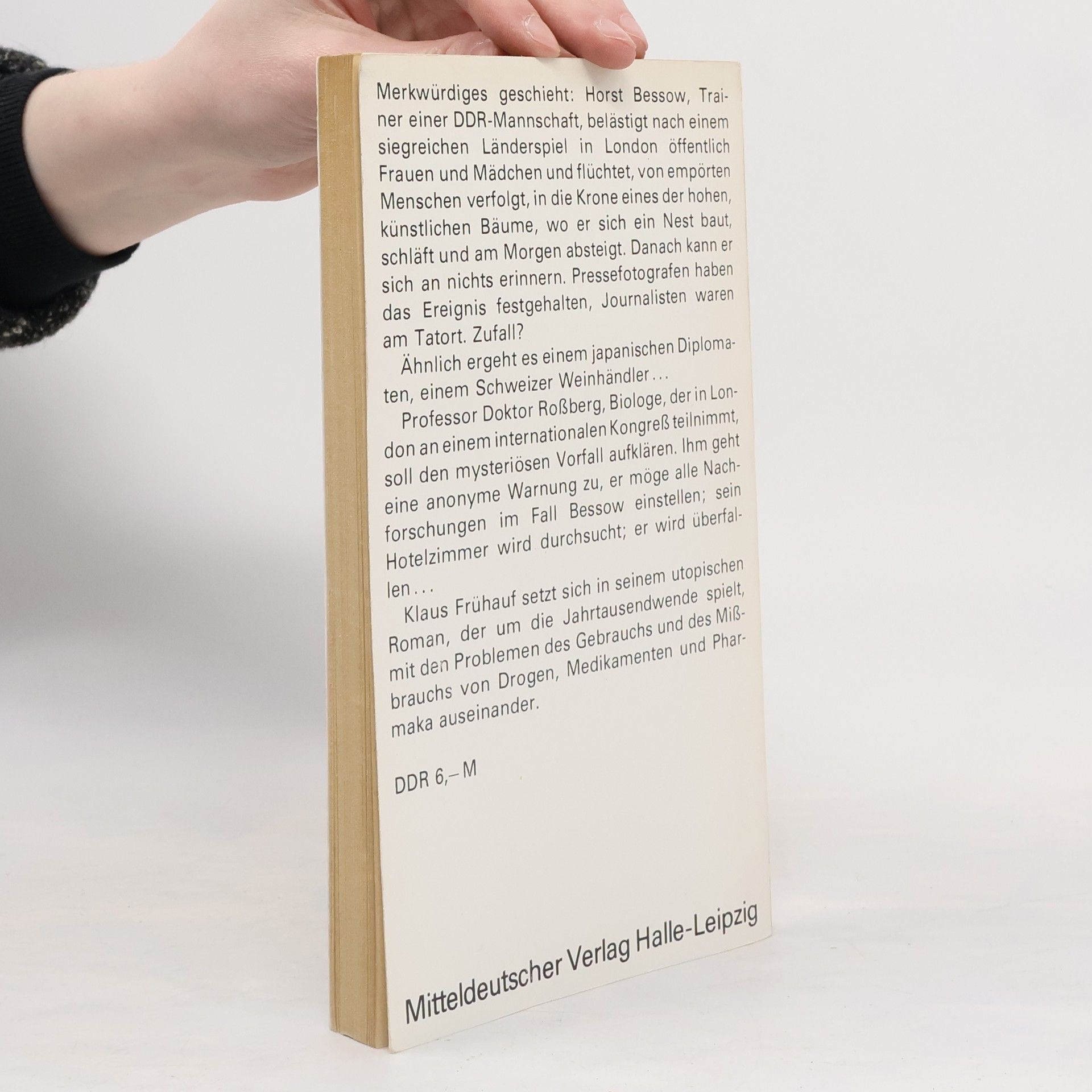 Merkwürdiges Horst Bessow, Trainer einer DDR-Mannschaft, belästigt nach einem siegreichen Länderspiel in London öffentlich Frauen und Mädchen und flüchtet, von empörten Menschen verfolgt, in die Krone eines der hohen, künstlichen Bäume, wo er sich ein Nest baut, schläft und am Morgen absteigt. Danach kann er sich an nichts erinnern. Pressefotografen haben das Ereignis festgehalten, Journalisten waren am Tatort. Zufall?Ähnlich ergeht es einem japanischen Diplomaten, einem Schweizer Weinhändler ...Professor Doktor Roßberg, Biologe, der in London an einem internationalen Kongreß teilnimmt, soll den mysteriösen Vorfall aufklären. Ihm geht eine anonyme Warnung zu, er möge alle Nachforschungen im Fall Bessow einstellen; er wird überfallen ...Klaus Frühauf setzt sich in seinem utopischen Roman, der um die Jahrtausendwende spielt, mit den Problemen des Gebrauchs und des Mißbrauchs von Drogen, Medikamenten und Pharmaka auseinander. (Klappentext)