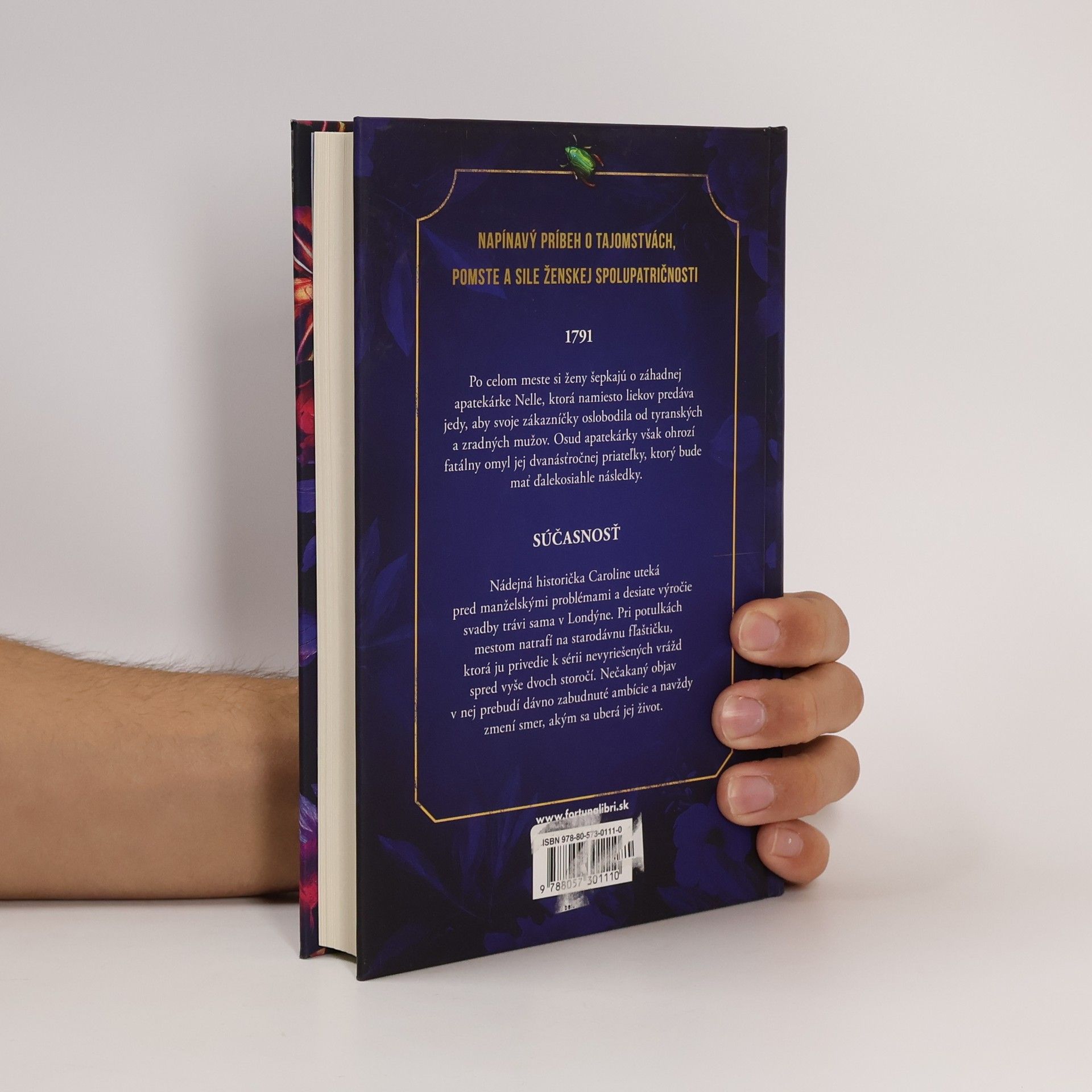 Napínavý príbeh o tajomstvách, pomste a sile ženskej spolupatričnosti 1791 Tajný obchod s liekmi a jedmi, ukrytý v hlbinách Londýna z 18. storočia, vychádza v ústrety neobvyklému druhu klientely. Ženy po celom meste vyhľadávajú tajomnú Nellu, ktorá predáva jedy, aby ich potom mohli použiť proti tyranským a zradným mužom vyskytujúcim sa v ich živote. Osud apatiekárky však ohrozí fatálny omyl jej dvanásťročnej priateľky, ktorého následky sa tiahnu ďaleko do budúcnosti. Súčasnosť Nádejná historička Caroline uteká pred manželskými problémami a desiate výročie svadby trávi sama v Londýne. Pri potulkách mestom natrafí na starodávnu fľaštičku, ktorá ju privedie k sérii nevyriešených vrážd spred vyše dvoch storočí. Nečakaný objav v nej prebudí dávno zabudnuté ambície a navždy zmení smer, akým sa uberá jej život.