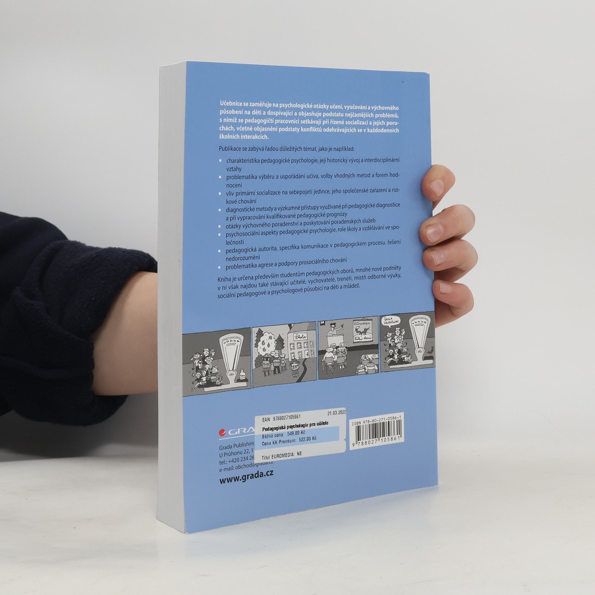 Učebnice se zaměřuje na psychologické otázky učení, vyučování a výchovného působení na děti a dospívající. Objasňuje podstatu nejčastějších problémů, s nimiž se pedagogičtí pracovníci setkávají při řízené socializaci a jejích poruchách, včetně konfliktů odehrávajících se v každodenních školních interakcích. Publikace se zabývá řadou důležitých témat, jako je například: • charakteristika pedagogické psychologie, její historický vývoj a interdisciplinární vztahy • problematika výběru a uspořádání učiva, volby vhodných metod a forem hodnocení • vliv primární socializace na sebepojetí jedince, jeho společenské zařazení a rizikové chování • diagnostické metody a výzkumné přístupy využívané při pedagogické diagnostice a při vypracování kvalifikované pedagogické prognózy • otázky výchovného poradenství a poskytování poradenských služeb • psychosociální aspekty pedagogické psychologie, role školy a vzdělávání ve společnosti • pedagogická autorita, specifika komunikace v pedagogickém procesu, řešení nedorozumění • problematika agrese a podpory prosociálního chování • text je doplněn medailonky význačných osobností oboru a obohacuje ho i řada ilustrací Kniha je určena především studentům pedagogických oborů, množství nových podnětů v ní však najdou také stávající učitelé, vychovatelé, trenéři, mistři odborné výuky, sociální pedagogové a psychologové působící na děti a mládež.