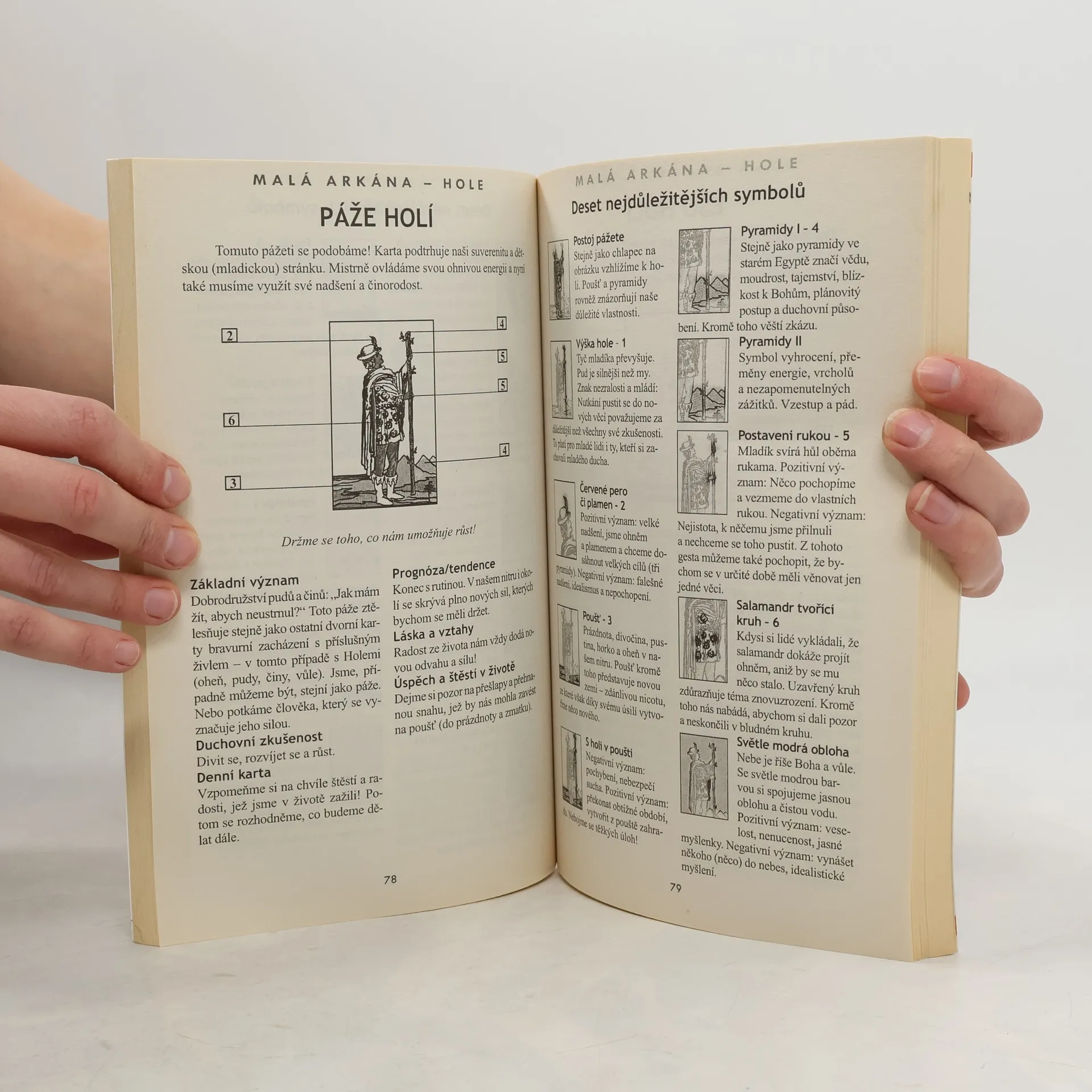 Toto je asi nejpodrobnější kniha o tarotových kartách, jaká se dá najít! Podrobně popisuje, rozebírá a vysvětluje každou jednu ze 78 karet celého Tarotu: všechny symboly, postavy, předměty, výjevy dokonce použité barvy které jsou na ní zobrazeny. Dále následuje výklad dané karty v těchto kategoriích: základní význam, duchovní zkušenost, denní karta, prognóza / tendence, láska a vztahy, úspěch a štěstí v životě. Kromě toho se ty vysvětluje obecný význam různých skupin karet: Velká a Malá arkána, mince, hole, meče, poháry, dvorní karty. Aby se výše uvedené vůbec dalo zužitkovat, najdete zde návod na deset možností výkladu (s různým počtem karet), deset možností, jak si vyložit pouze jednu kartu, a deset obecných pravidel pro výklad. Pokud vás zajímá Tarot, tato kniha vám nesmí chybět!
