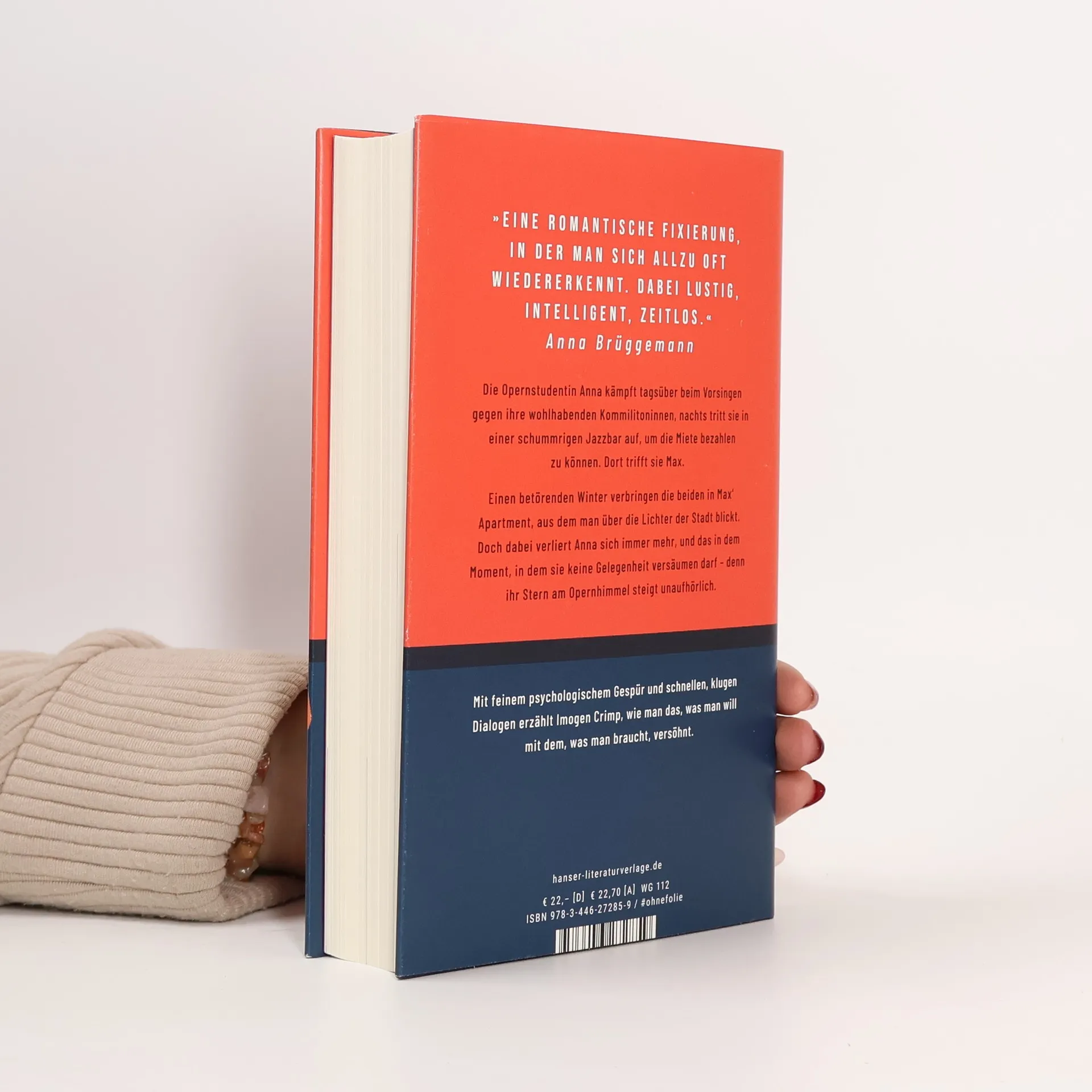 „Imogen Crimps Hauptfigur Anna passt weder in die Welt der angehenden Opernstars noch ins Leben ihres Liebhabers. Und die Autorin schildert diese Zerrissenheit mit feinem psychologischem Gespür. Manchmal erinnert ihr dialogreicher Stil an die Autorin Sally Rooney – den irischen Literatur-Shootingstar der letzten Jahre.“ NDR Kultur Die Gesangsstudentin Anna konkurriert tagsüber beim Vorsingen gegen ihre Kommilitoninnen aus gutem Hause, nachts singt sie Jazz in einer verrauchten Bar, um die Miete bezahlen zu können. Dort trifft sie den wohlhabenden Max. Einen betörenden Winter lang oszilliert ihr Leben zwischen den schwer erkämpften Momenten auf der Bühne und den Nächten in Max’ Apartment, das über die Lichter der Stadt blickt. Doch Annas Karriere fordert einen immer größeren Teil ihres Lebens – ebenso wie Max. Imogen Crimps Romandebüt ist eine fesselnde Liebesgeschichte und ein tiefgehender psychologischer Roman über eine Beziehung mit ungleichen Machtverhältnissen, über Geld, Sex und Abhängigkeit.
