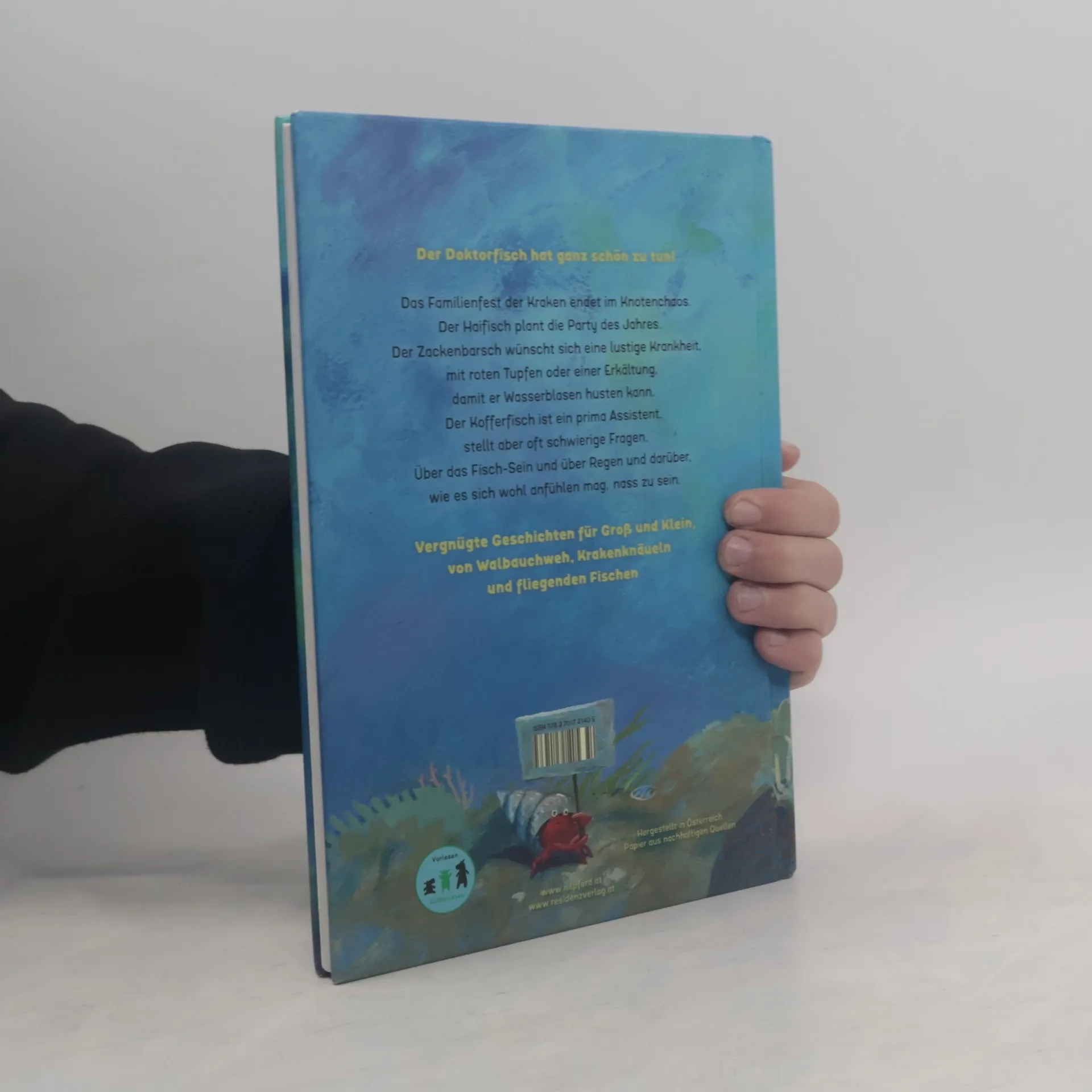 Der Doktorfisch hat ganz schön zu tun. Da sind die Kraken, deren Familienfest in einem Knotenchaos endet. Der Haifisch, der bei seiner Geburtstagsparty die Gäste verspeisen möchte. Oder der Zackenbarsch, der sich eine lustige Krankheit wünscht, irgendwas mit roten Tupfen oder mit einer Erkältung, damit er Wasserblasen husten kann. Der Kofferfisch ist ein perfekter Assistent, stellt aber oft schwierige Fragen. Über das Fisch-Sein und über Regen und darüber, wie es sich wohl anfühlen mag, nass zu sein. Jens Rassmus sprüht vor lustigen Ideen. Seine Geschichten begeistern Groß und Klein, ob krank oder gesund!