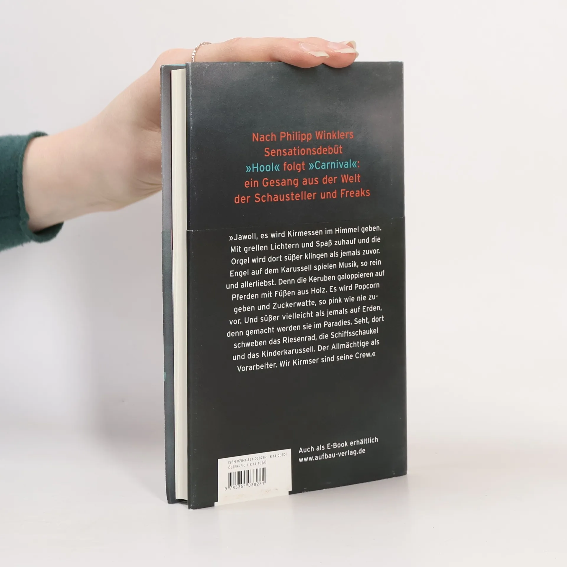 Nach dem Sensationsdebüt HOOL folgt CARNIVAL: ein Gesang aus der Welt der Schausteller und Freaks In seinem gefeierten Debütroman »Hool« hat Philipp Winkler Menschen eine Sprache gegeben, die keine haben: Heiko Kolbe und seinen Blutsbrüdern, den Hooligans. Nun spinnt Winkler diese Idee fort. Sein Erzähler beschwört einen Reigen der Träumer und Traurigen, der Unerschütterlichen und Unverstandenen herauf: das Personal eines über das Land ziehenden Wanderjahrmarkts. Er lässt sie hoffen und verzweifeln, schimpfen und fabulieren, lästern und schwärmen. In einer ganz eigenen, nie gehörten, singenden Sprache eröffnet uns Philipp Winkler einen Einblick in ein Universum, das - ganz wie unsere süßesten Träume von früher - aus Riesenrädern, Zuckerwatte und ein bisschen dreckigem Feenstaub besteht.
