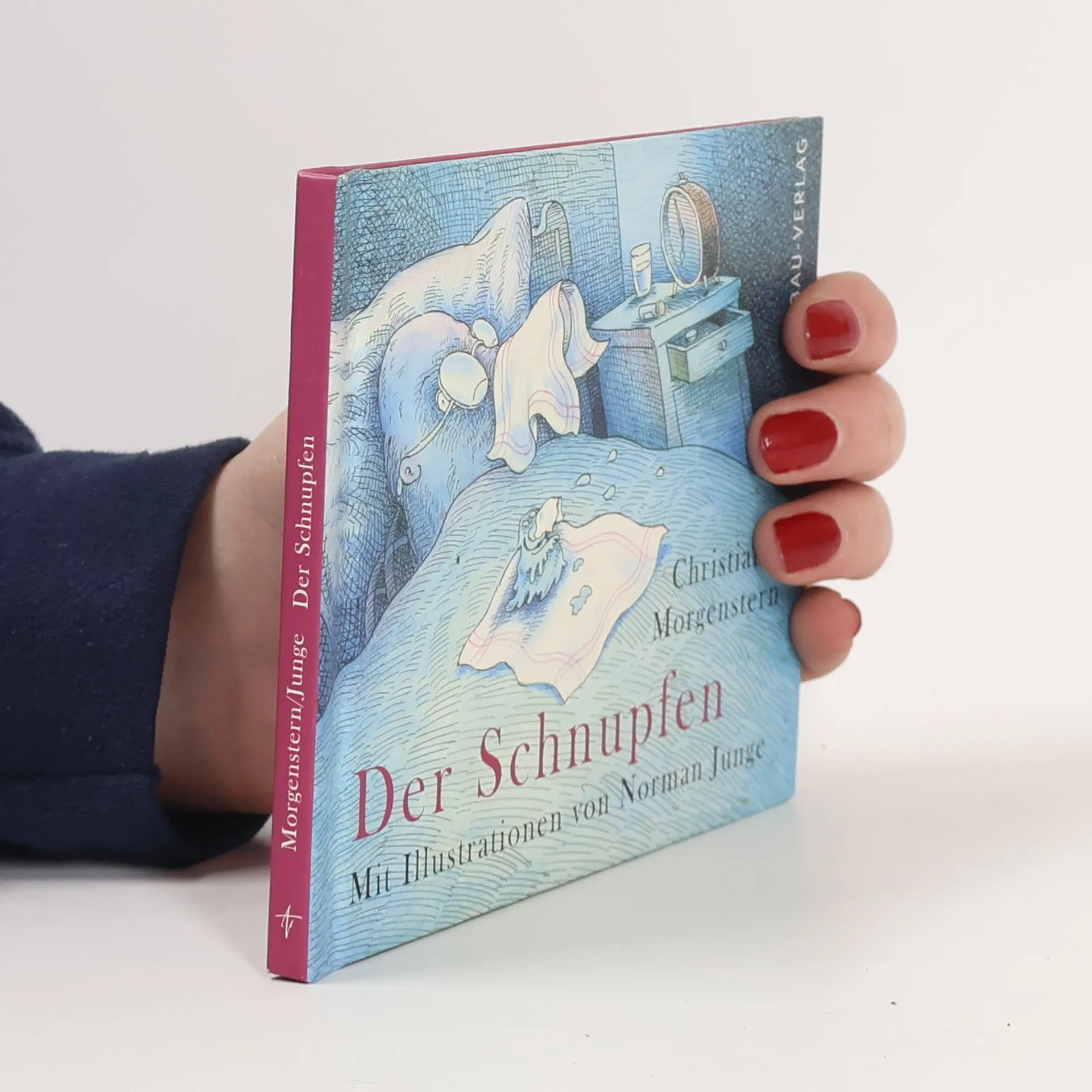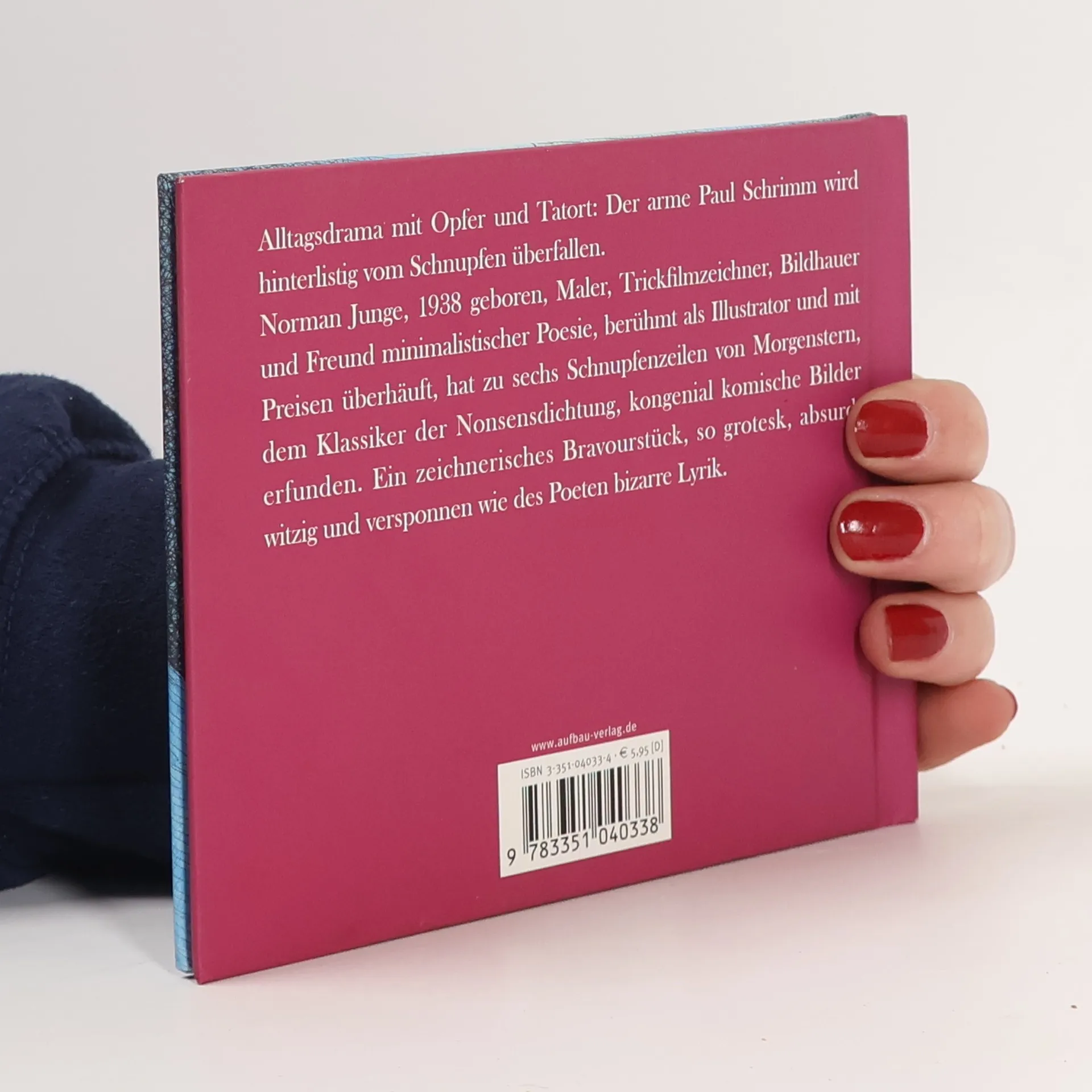 Woher kommt eigentlich der Schnupfen? Christian Morgensterns groteske Verse verwandelt Norman Junge ("Fünfter sein") mit bewegten Bildern in ein witziges Alltagsdrama. Ein banaler Vorgang, den jeder Paul Schrimm ist das Opfer, Straßen, Gassen und Terrassen sind die Tatorte und der Täter lauert überall. Norman Junges Dramaturgie ist raffiniert, seine Ausschnitte und Draufsichten verraten den Filmprofi. Es entstehen Bewegung, Witz, Spannung. "Ich denke nie an Kinder, wenn ich Bilderbücher mache. Ich meine nur, ich bin albern und komisch genug, um von ihnen verstanden zu werden." Eben durch diese unprätentiöse Einstellung wirkt Junges Buchkunst so überzeugend. Sein Thema ist oft das Absurde, seine Figuren haben etwas Verlorenes und Melancholisches. Das macht ihn zu einem idealen Illustrator für Morgenstern, dessen grotesk-komische Einfälle er in verblüffende Bilder umsetzt.