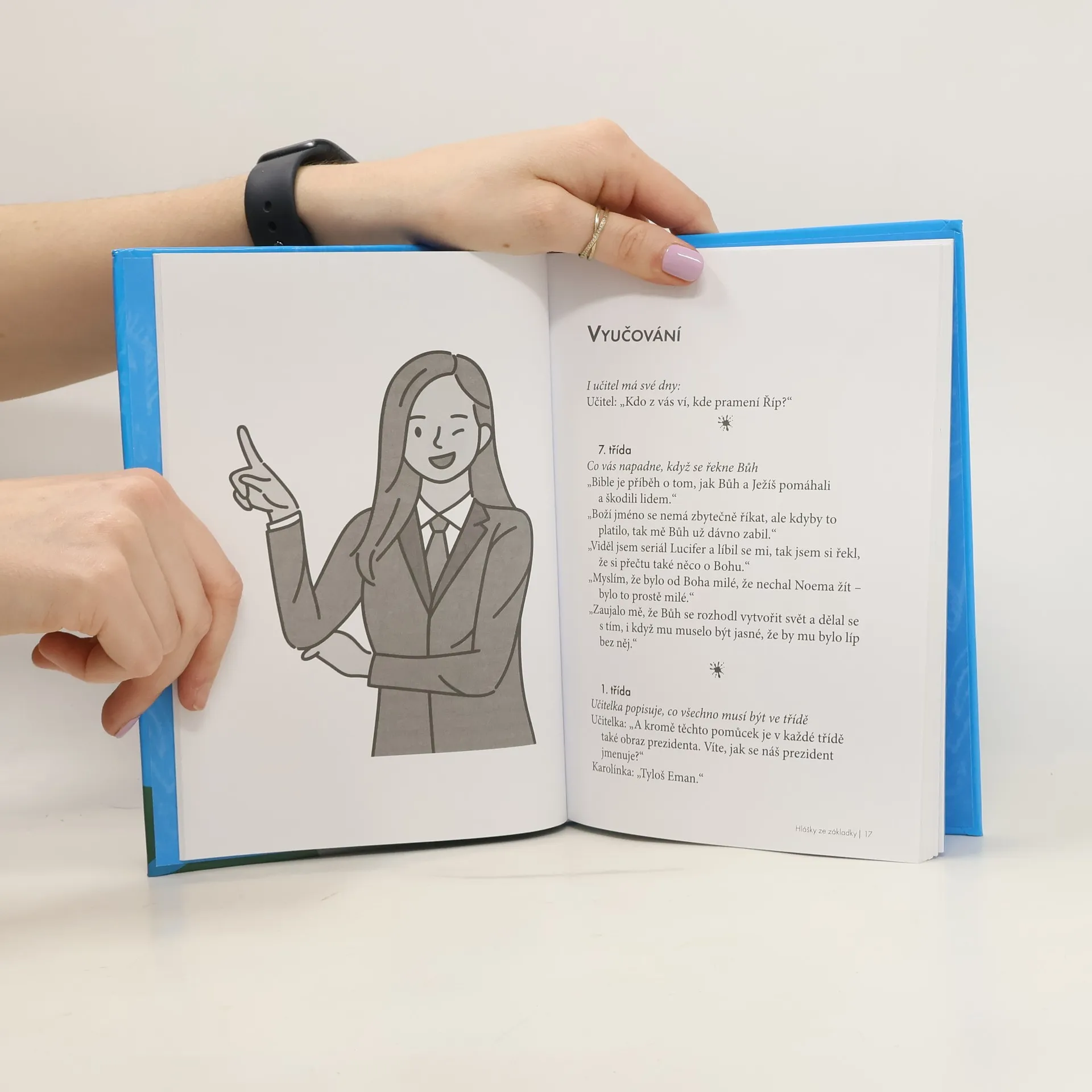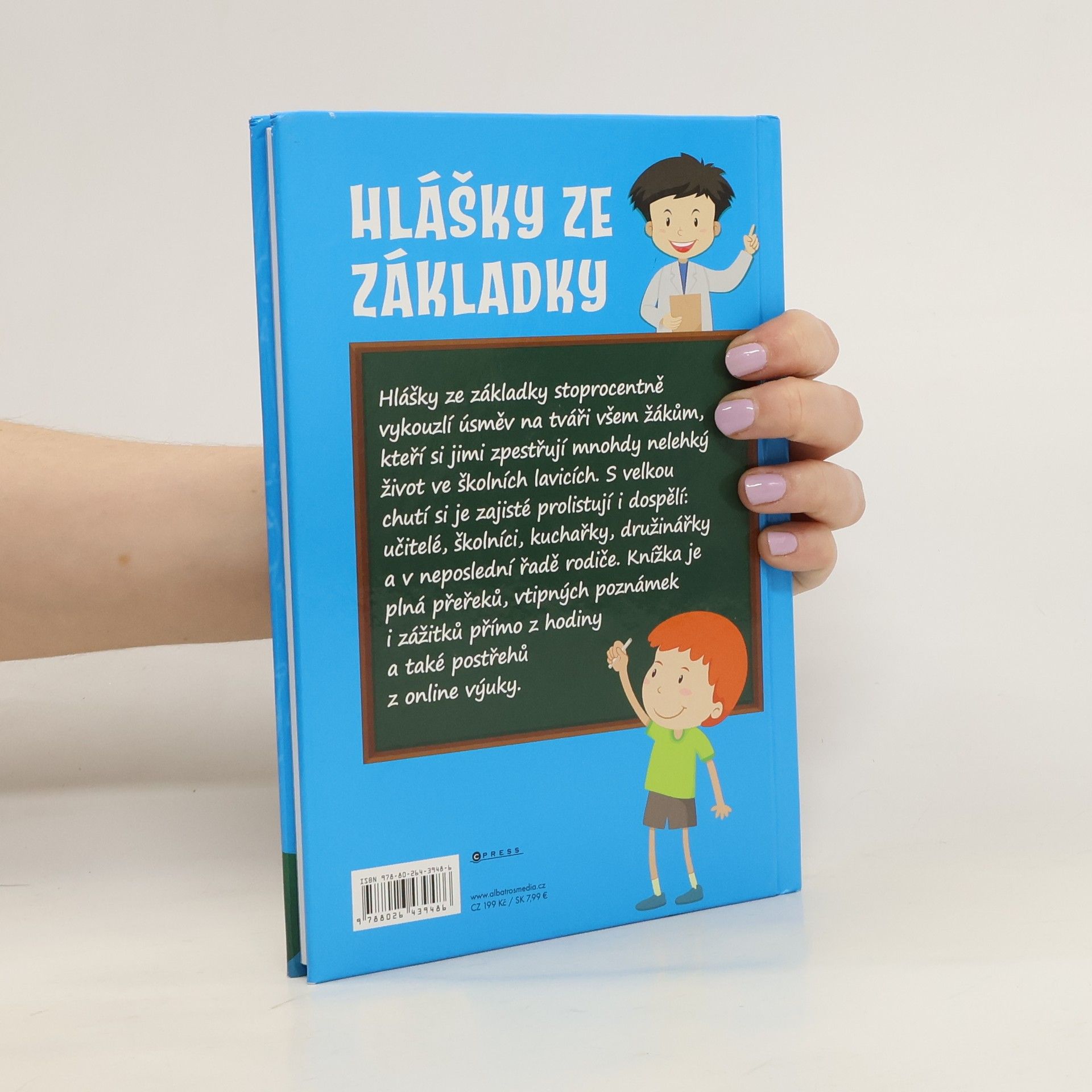 Hlášky ze základky stoprocentně vykouzlí úsměv na tváři všem žákům, kteří si jimi zpestřují mnohdy nelehký život ve školních lavicích. S velkou chutí si je zajisté prolistují i dospělí: učitelé, školníci, kuchařky, družinářky a v neposlední řadě rodiče. Knížka je plná přeřeků, vtipných poznámek i zážitků přímo z hodiny a také postřehů z online výuky.