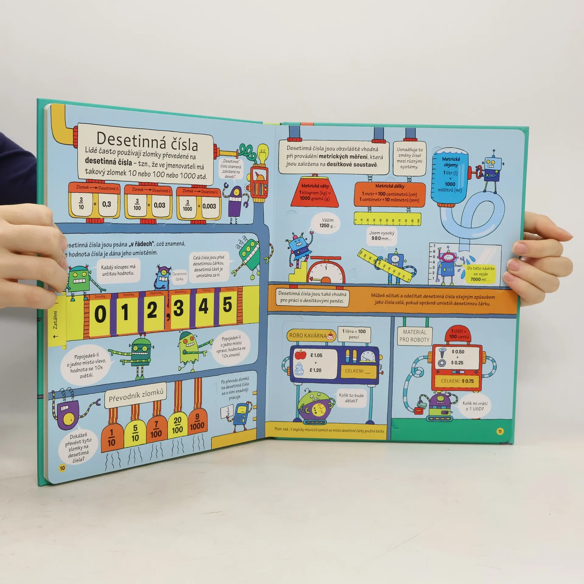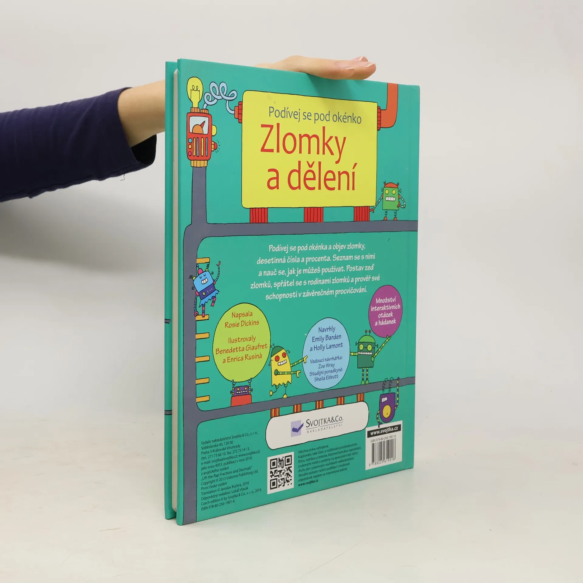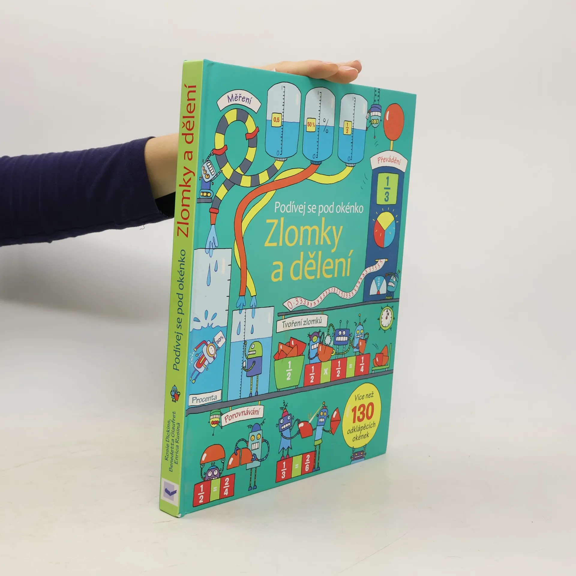 Slyšel jsi dospělé bavit se o procentech, desetinných číslech nebo zlomcích? Víš, co to znamená mít z něčeho jen čtyři pětiny a kolik v obchodě zaplatíš, když dostaneš slevu 50 %? Chtěl by ses dozvědět, co se za těmito tajemnými slovy a čísly skrývá? Ať už tě látka týkající se zlomků v matematice potkala, nebo na tebe teprve čeká, s touto nápaditou knížkou můžeš proniknout do světa zlomků ihned a sám - nemusíš čekat, než ti to někdo vysvětlí! Poznej, proč se lidem hodí vyjadřovat části čísel nejrůznějšími způsoby; nauč se zlomky porovnávat; pochop, jak lze ze zlomku vytvořit desetinné číslo a z desetinného čísla procento. Na bohatě ilustrovaných stránkách, pod množstvím zábavných odklápěcích okének na tebe čeká matematické dobrodružství plné hravých příkladů. Na konci najdeš užitečnou převodní tabulku a úlohy, které prověří, zda jsi zlomkům skutečně porozuměl.