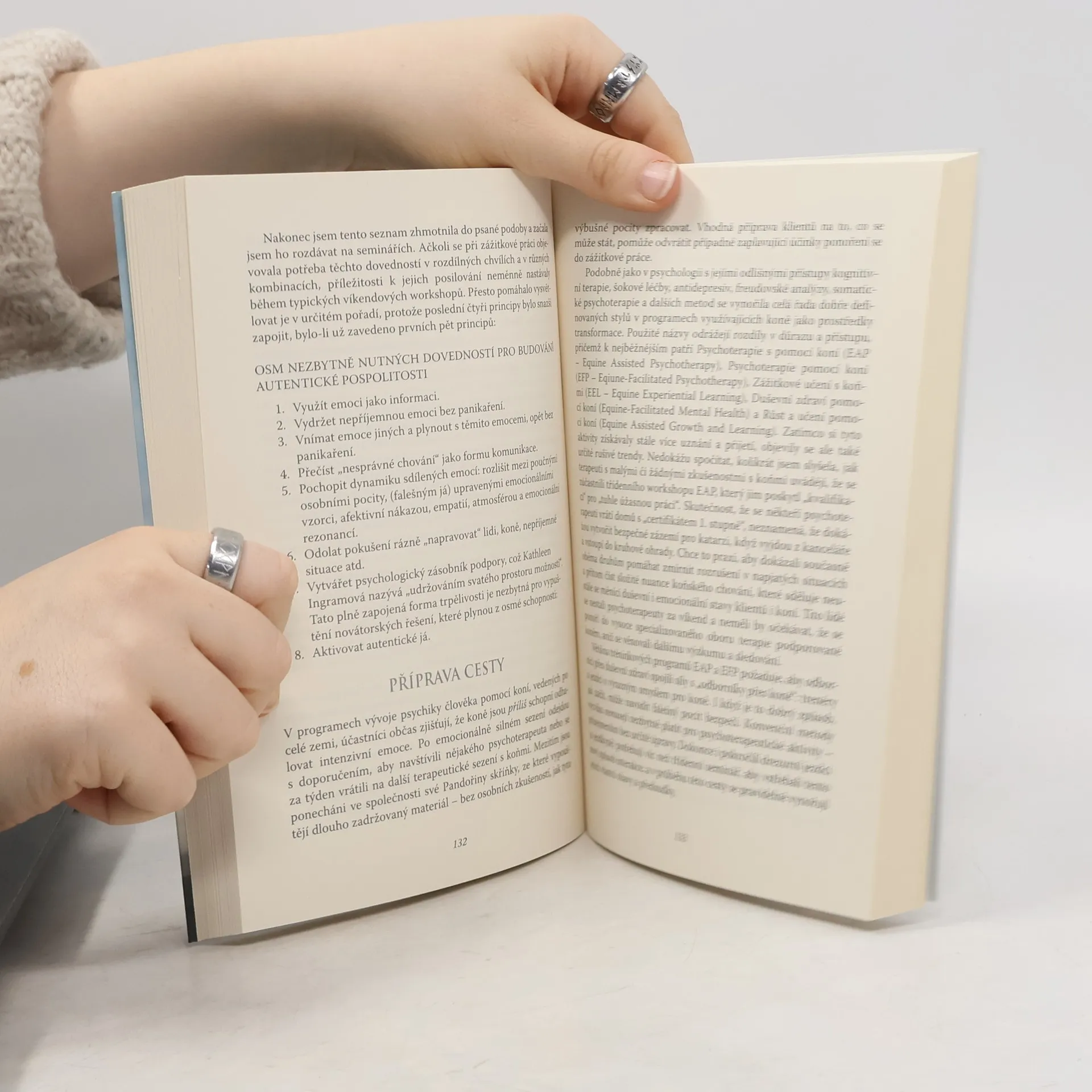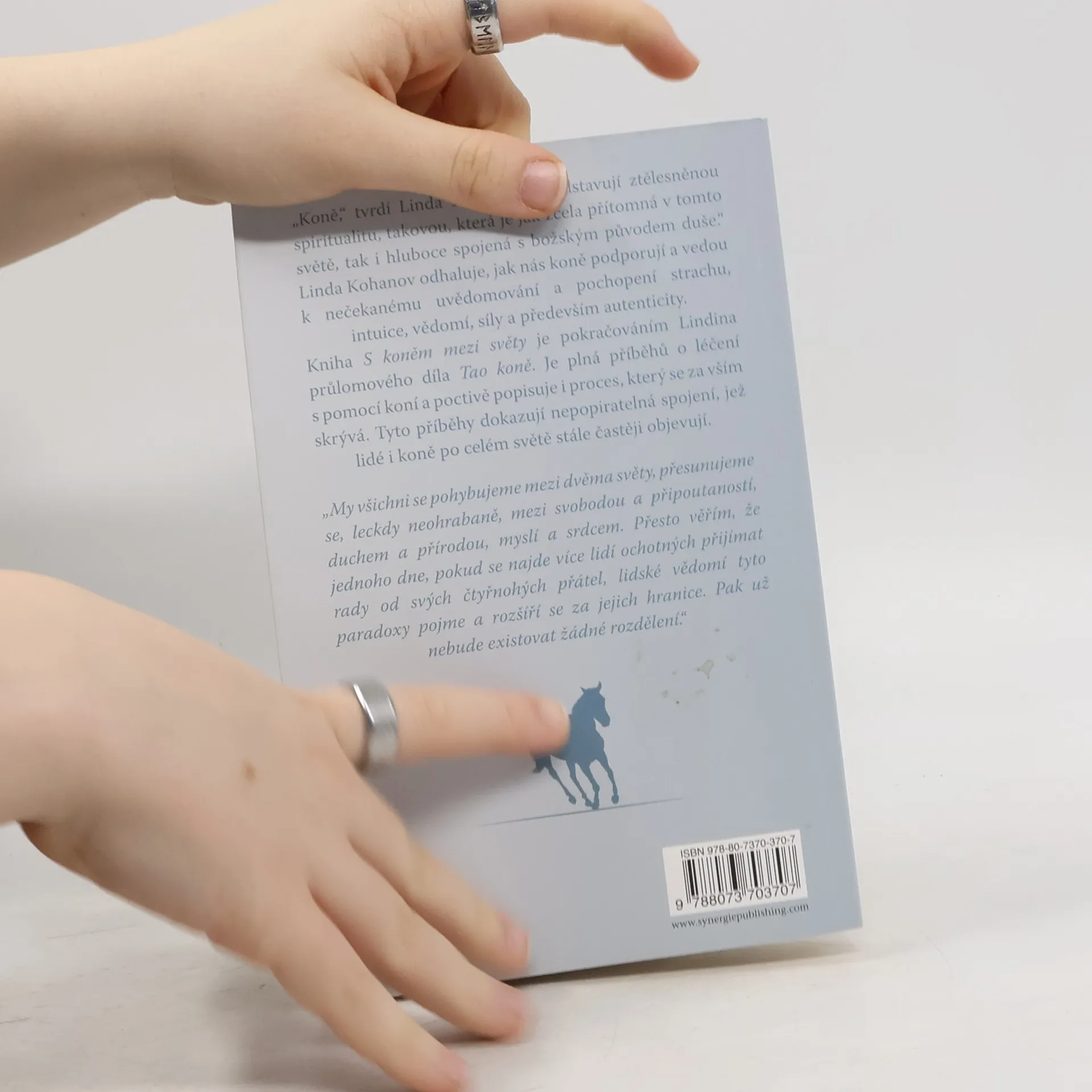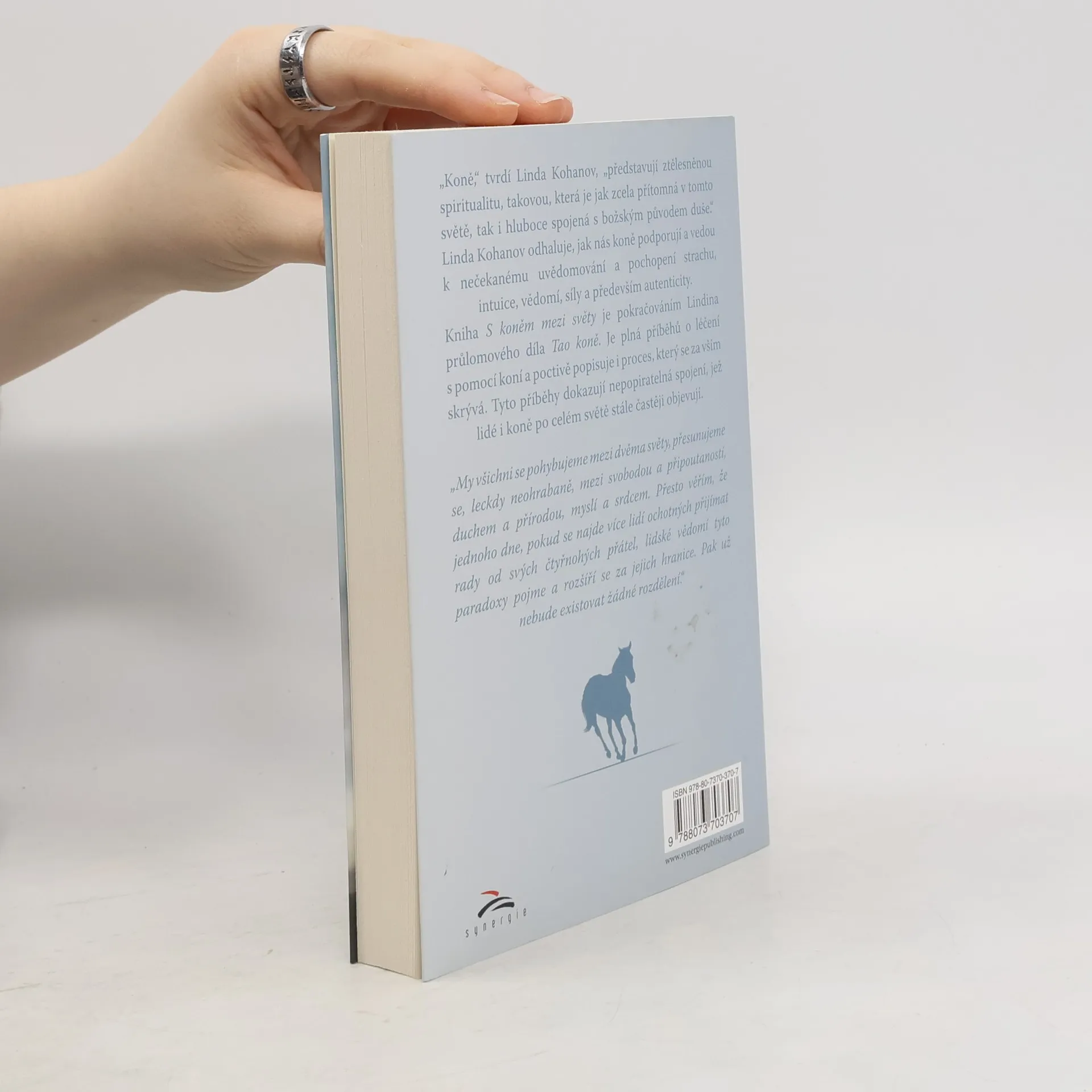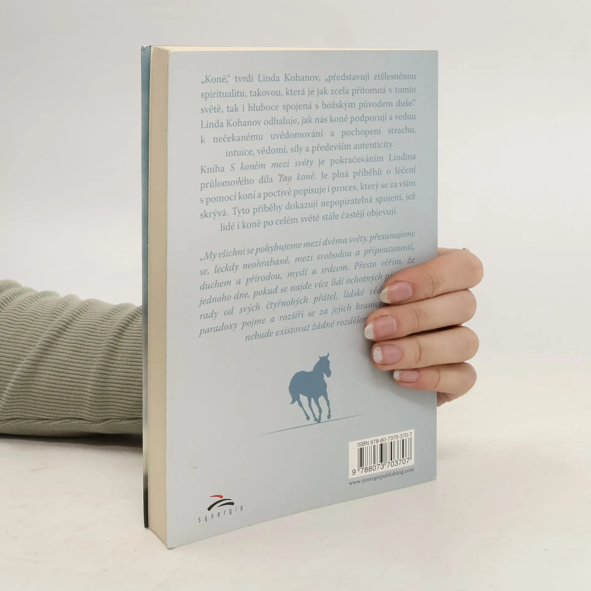 Cesta k rozvíjení intuice, vědomí a síly s pomocí koní „Koně,“ tvrdí Linda Kohanov, „představují ztělesněnou spiritualitu, takovou, která je jak zcela přítomná v tomto světě, tak i hluboce spojená s božským původem duše.“ Linda Kohanov odhaluje, jak nás koně podporují a vedou k nečekanému uvědomování a pochopení strachu, intuice, vědomí, síly a především autenticity. Kniha S koněm mezi světy je pokračováním Lindina průlomového díla Tao koně. Je plná příběhů o léčení s pomocí koní a poctivě popisuje i proces, který se za vším skrývá. Tyto příběhy dokazují nepopiratelná spojení, jež lidé i koně po celém světě stále častěji objevují. „My všichni se pohybujeme mezi dvěma světy, přesunujeme se, leckdy neohrabaně, mezi svobodou a připoutaností, duchem a přírodou, myslí a srdcem. Přesto věřím, že jednoho dne, pokud se najde více lidí ochotných přijímat rady od svých čtyřnohých přátel, lidské vědomí tyto paradoxy pojme a rozšíří se za jejich hranice. Pak už nebude existovat žádné rozdělení.“