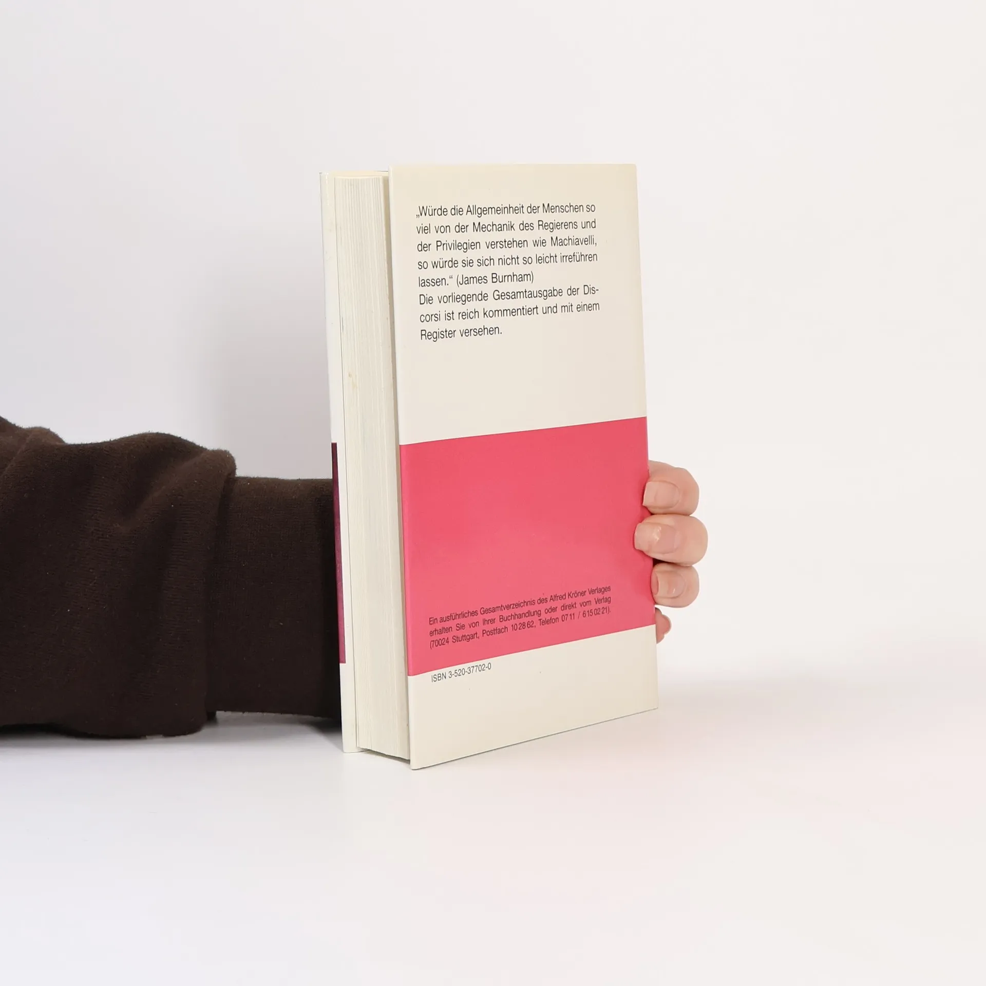 Neben dem Fürstenspiegel ›Il Principe‹ sind die ›Discorsi sopra la prima deca di Tito Livio‹ das zweite Hauptwerk des Staatstheoretikers der italienischen Renaissance, Niccolò Machiavelli (1469-1527). In ihnen liegen die Akzente nun auf dem Verhältnis zwischen Staat und Volk. Fast alle Probleme der inneren und äußeren Politik, der Staatsführung, der Verfassung und Verwaltung, der Volkswirtschaft, der Kolonialpolitik und Kriegsführung werden vom Autor behandelt. Dabei erweist sich, dass hinter dem vielfach als Machtpolitiker verfemten Verfasser ein aufrechter und leidenschaftlicher Republikaner zum Vorschein kommt, dass Machiavelli selbst kein Machiavellist ist. Die vorliegende deutsche Gesamtausgabe der ›Discorsi‹ wurde von Rudolf Zorn übersetzt und ausführlich kommentiert.