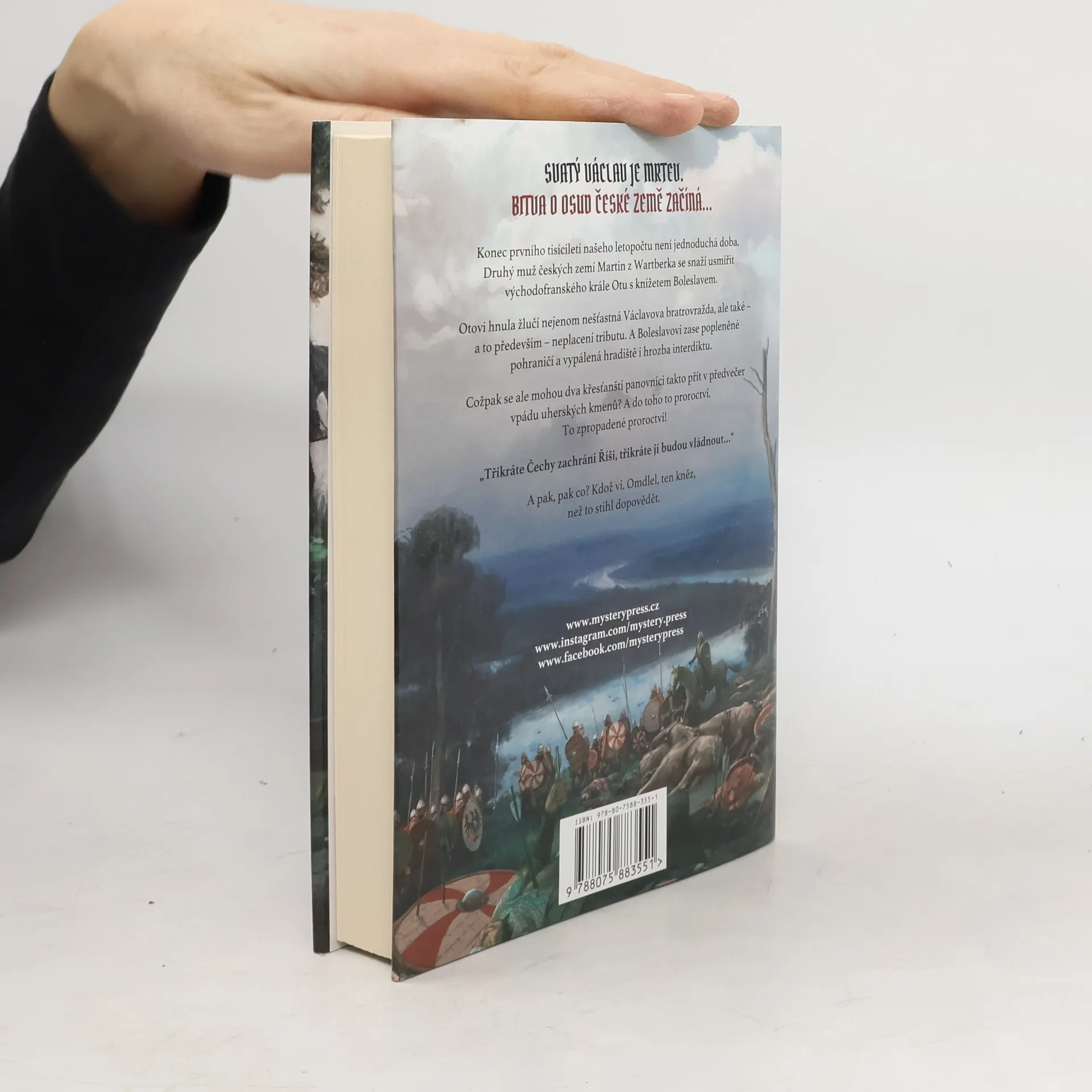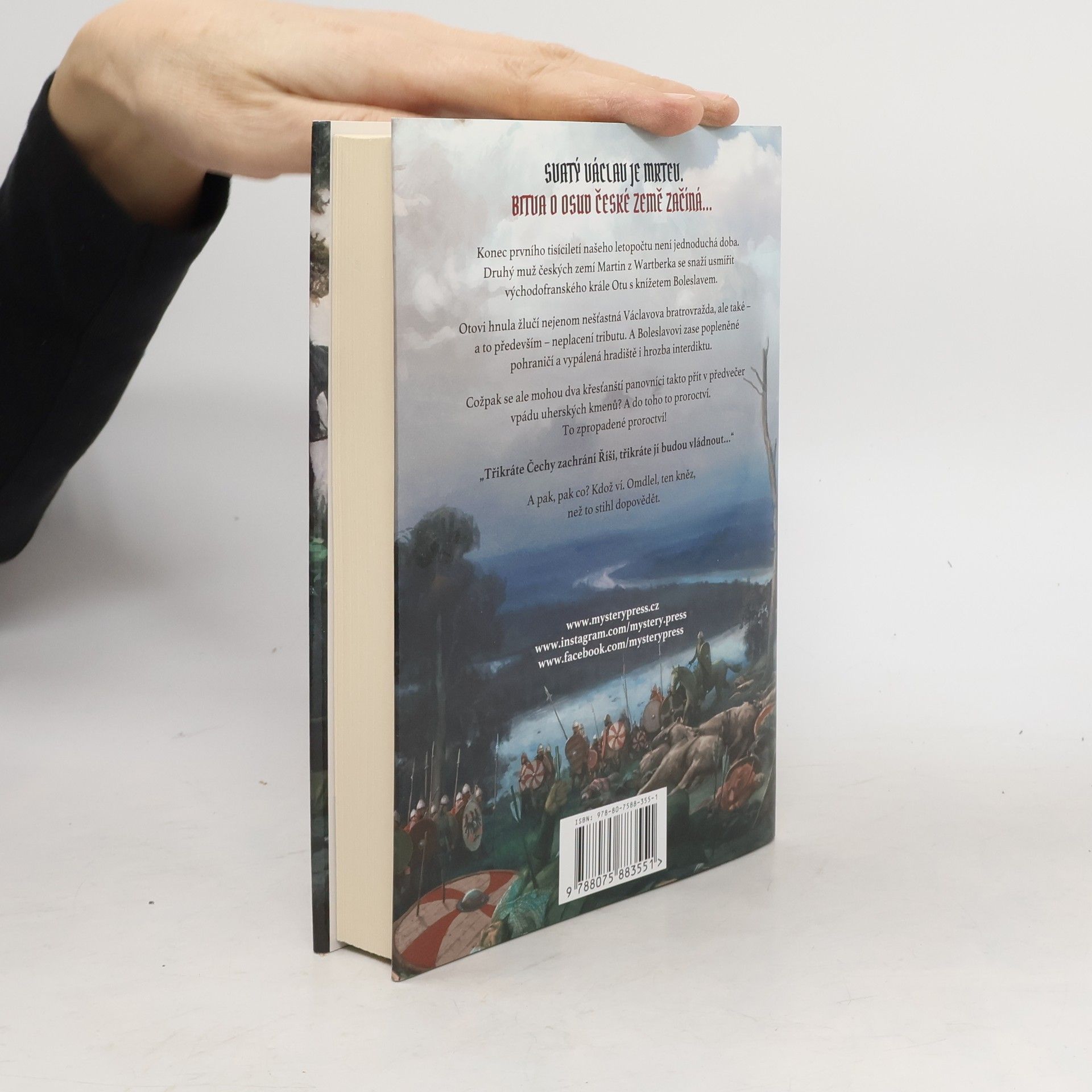 SVATÝ VÁCLAV JE MRTEV. BITVA O OSUD ČESKÉ ZEMĚ ZAČÍNÁ… Konec prvního tisíciletí našeho letopočtu není jednoduchá doba. Druhý muž českých zemí Martin z Wartberka se snaží usmířit východofranského krále Otu s knížetem Boleslavem. Otovi hnula žlučí nejenom nešťastná Václavova bratrovražda, ale také – a to především – neplacení tributu. A Boleslavovi zase popleněné pohraničí a vypálená hradiště i hrozba interdiktu. Cožpak se ale mohou dva křesťanští panovníci takto přít v předvečer vpádu uherských kmenů? A do toho to proroctví. To zpropadené proroctví! „Třikráte Čechy zachrání Říši, třikráte jí budou vládnout…“ A pak, pak co? Kdož ví. Omdlel, ten kněz, než to stihl dopovědět.