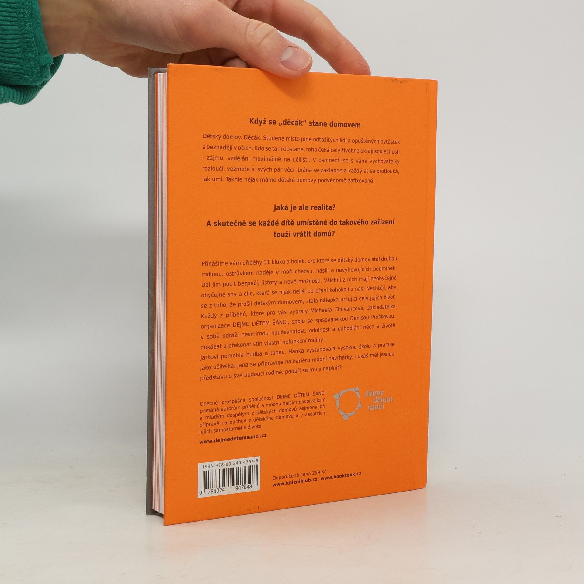 Kdo vlastně jsou „děti vyrůstající v dětských domovech“? Odkud do dětských domovů přicházejí a proč? Co mají za sebou? Jaká mají přání a sny? Jak to v běžném dětském domově vypadá? Mezi veřejností přežívá názor, že dětský domov je to nejhorší, co může dítě potkat. Pro mnoho skvělých a šikovných mladých lidí dětský domov znamenal záchranu, a to v mnoha případech doslova. Organizace Dejme dětem šanci si dala za cíl zažité mýty vyvracet. Autentické příběhy dětí a mladých lidí, kteří strávili část života v dětském domově, vám poskytnou odpovědi na tyto otázky a ještě mnohem víc…