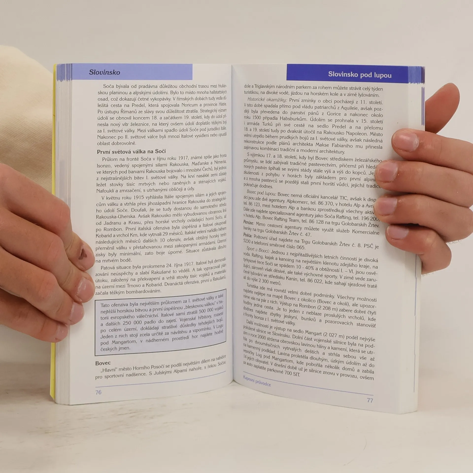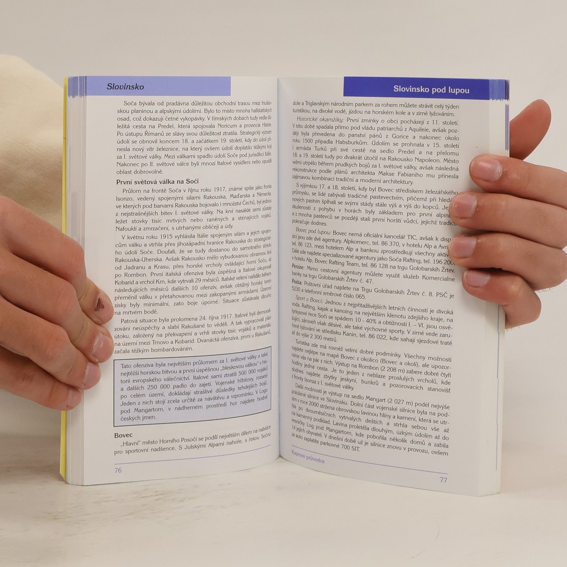 Průvodce po Slovinsku, nejzápadnější z bývalých jugoslávských republik, popisuje zajímavá místa všech regionů země, Julské Alpy na severozápadě, "Slovinskou riviéru" v nejsevernější části Istrijského poloostrova, dále i u nás turisticky málo známé kraje Dolenjska či Prekmurje. Kromě systematického popisu pozoruhodností nechybí ani všeobecně zaměřené informace o historii, přírodě a umění. Kromě doplňujícího fotografického aparátu je zajímavou součástí publikace i přehled internetových adres týkajících se Slovinska.