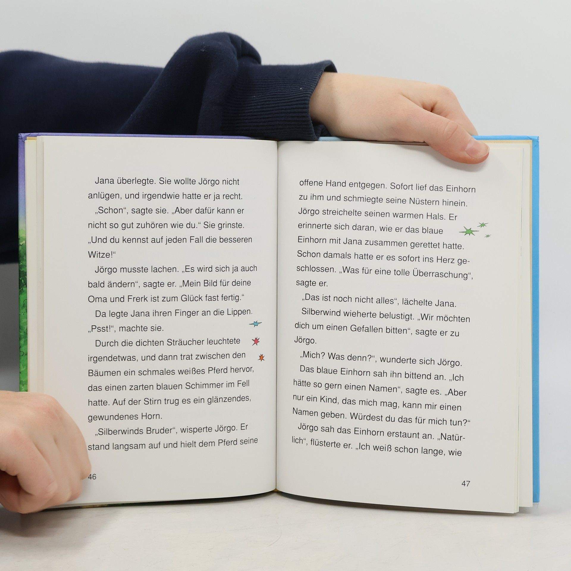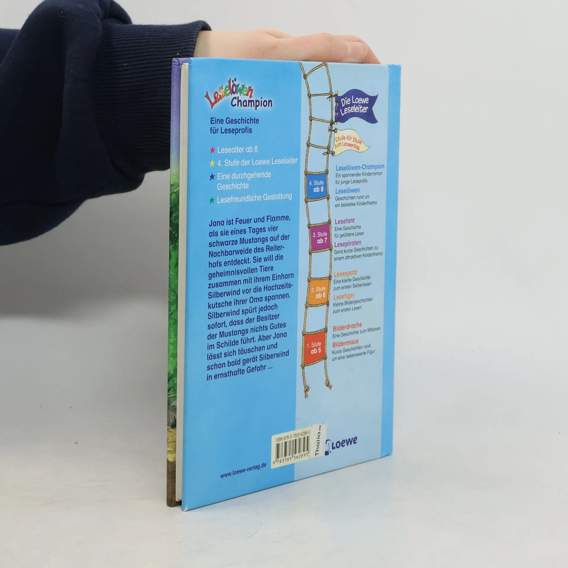 Dies ist ein 3. Titel über Jana und ihr Pferd Silberwind (vgl.a. BA 5/08), von dem nur Eingeweihte wissen, dass es ein Einhorn ist. Als der Neffe Herrn Frerks Jana hilft, Silberwind als Kutschpferd für die Hochzeitskutsche von Janas Oma und Herrn Frerk zu trainieren, ist ihre Beziehung zu ihrem besten Freund Jörgo vorübergehend getrübt. Aber gerade Jörgo entdeckt, dass der Besitzer der 4 Mustangs, die Jana zusammen mit Silberwind vor die Hochzeitskutsche spannt, in Wirklichkeit der Schwarze Deichgraf ist, der das Horn Silberwinds an sich bringen möchte. Doch ihre Lehrerin, die eine Fee ist, Silberwinds Einhornbruder und der Drache Darantilus kommen Jana und Jörgo zu Hilfe, um Silberwind aus der Gewalt des Deichgrafen zu befreien und diesen in seine Schranken zu verweisen. So kann Jana das frischvermählte Ehepaar doch noch mit einem Fünfergespann kutschieren. Dieses mit Großdruck und Farbillustrationen für fortgeschrittene Leseanfänger/-innen gestaltete Buch vereint die attraktiven Themen Reiterhof und Einhorn (vgl.a. die beliebte Reihe "Sternenschweif" von L. Chapman, zuletzt BA 6/08). Breit einsetzbar. . - Jana möchte ihr Pferd und heimliches Einhorn Silberwind zusammen mit 4 schwarzen Mustangs vor die Hochzeitskutsche ihrer Oma spannen. Damit bringt sie Silberwind aber in große Gefahr. Ab 8.