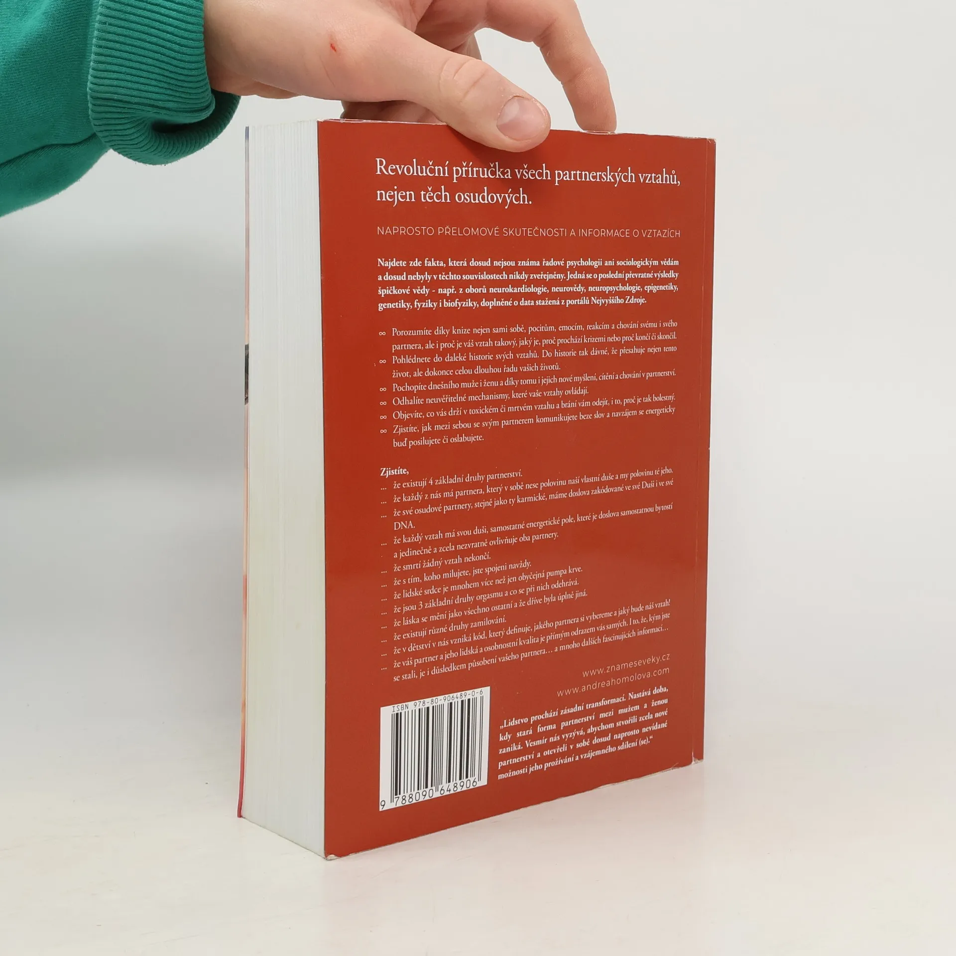 Kniha o vztazích, která změní váš život. Revoluční příručka všech partnerských vztahů, včetně těch osudových. Najdete zde naprosto přelomové skutečnosti a informace týkající se vztahů, fakta, která dosud nejsou známa řadové psychologii, ani sociologickým vědám, a dosud nebyla v těchto souvislostech nikdy zveřejněna. Jedná se nejen o poslední převratné výsledky špičkové světové vědy - např. z oborů neurokardiologie, neurovědy, neuropsychologie, epigenetiky, genetiky, fyziky a biofyziky, související se vztahy, ale i skutečnosti a souvislosti z duchovních věd. Kniha je výjimečná syntézou obou pramenů poznání a také tím, že vám zodpoví všechny otázky na téma partnerství, na které jste dosud hledali odpovědi, ale nenalezli je. Dozvíte se například, že DNA je neuroplastická, neboli že začínáme být schopni ji sami přepisovat svým vlastním vědomím. Že v DNA je uložen kód našich partnerů. Že žádný vztah nikdy neskončí, ani smrtí jednoho z partnerů. Že pouhou myšlenkou, i na vzdálenost tisíců kilometrů, ovlivňujeme tepovou frekvenci toho, na nějž s láskou pomyslíme a mnoho podobných převratných informací, které nebyly dosud zveřejněny v těchto souvislostech. Lze koupit na www.znameseveky.cz