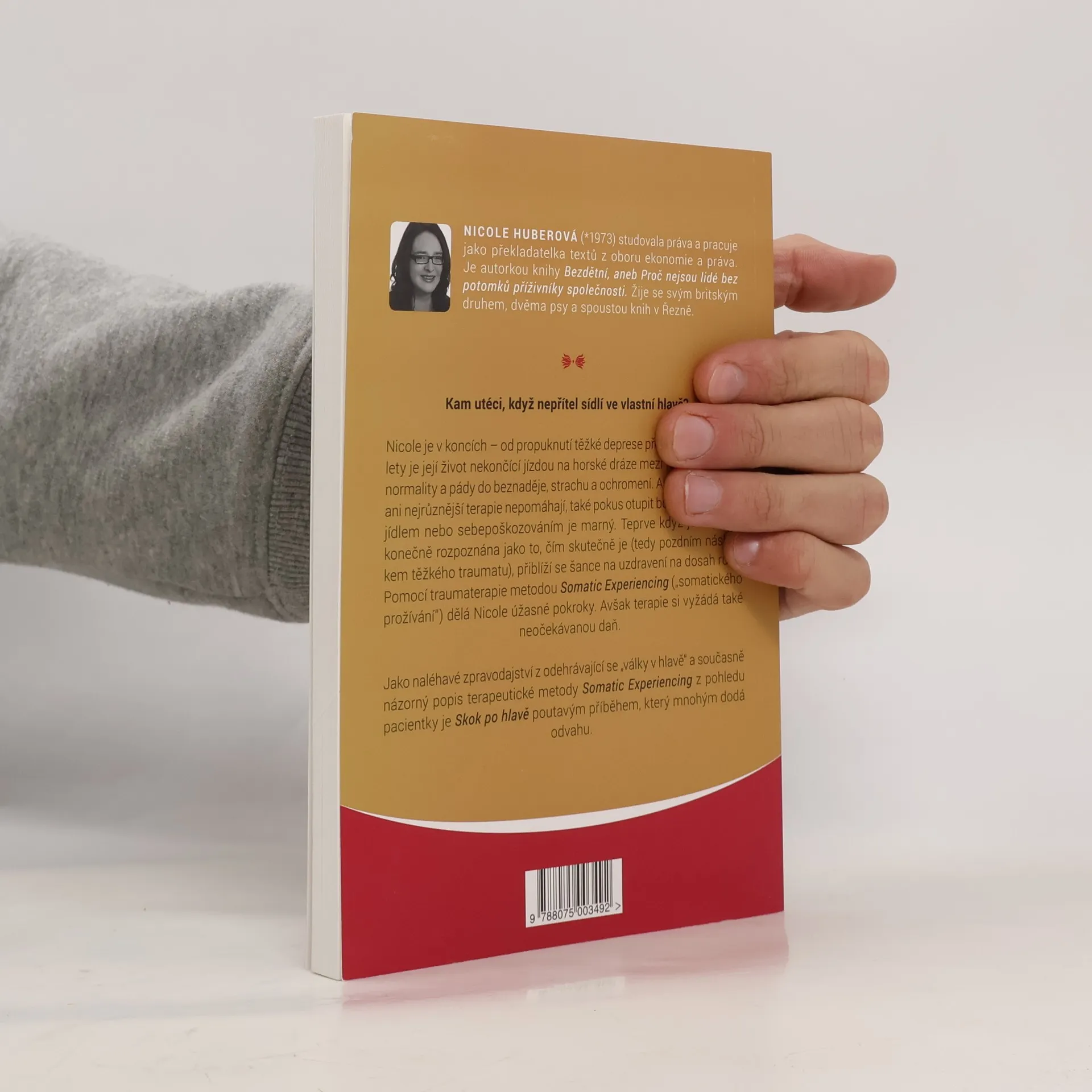 Kam utéci, když nepřítel sídlí ve vlastní hlavě? Nicole je v koncích – od propuknutí těžké deprese před více než deseti lety je její život nekončící jízdou na horské dráze mezi fázemi relativní normality a pády do beznaděje, strachu a ochromení. Ani antidepresiva, ani nejrůznější terapie nepomáhají, také pokus otupit bolest alkoholem, jídlem nebo sebepoškozováním je marný. Teprve když je deprese konečně rozpoznána jako to, čím skutečně je (tedy pozdním následkem těžkého traumatu), přiblíží se šance na uzdravení na dosah ruky. Pomocí traumaterapie metodou Somatic Experiencing („somatického prožívání“) dělá Nicole úžasné pokroky. Avšak terapie si vyžádá také neočekávanou daň. Jako naléhavé zpravodajství z odehrávající se „války v hlavě“ a současně názorný popis terapeutické metody Somatic Experiencing z pohledu pacientky je Skok po hlavě poutavým příběhem, který mnohým dodá odvahu.