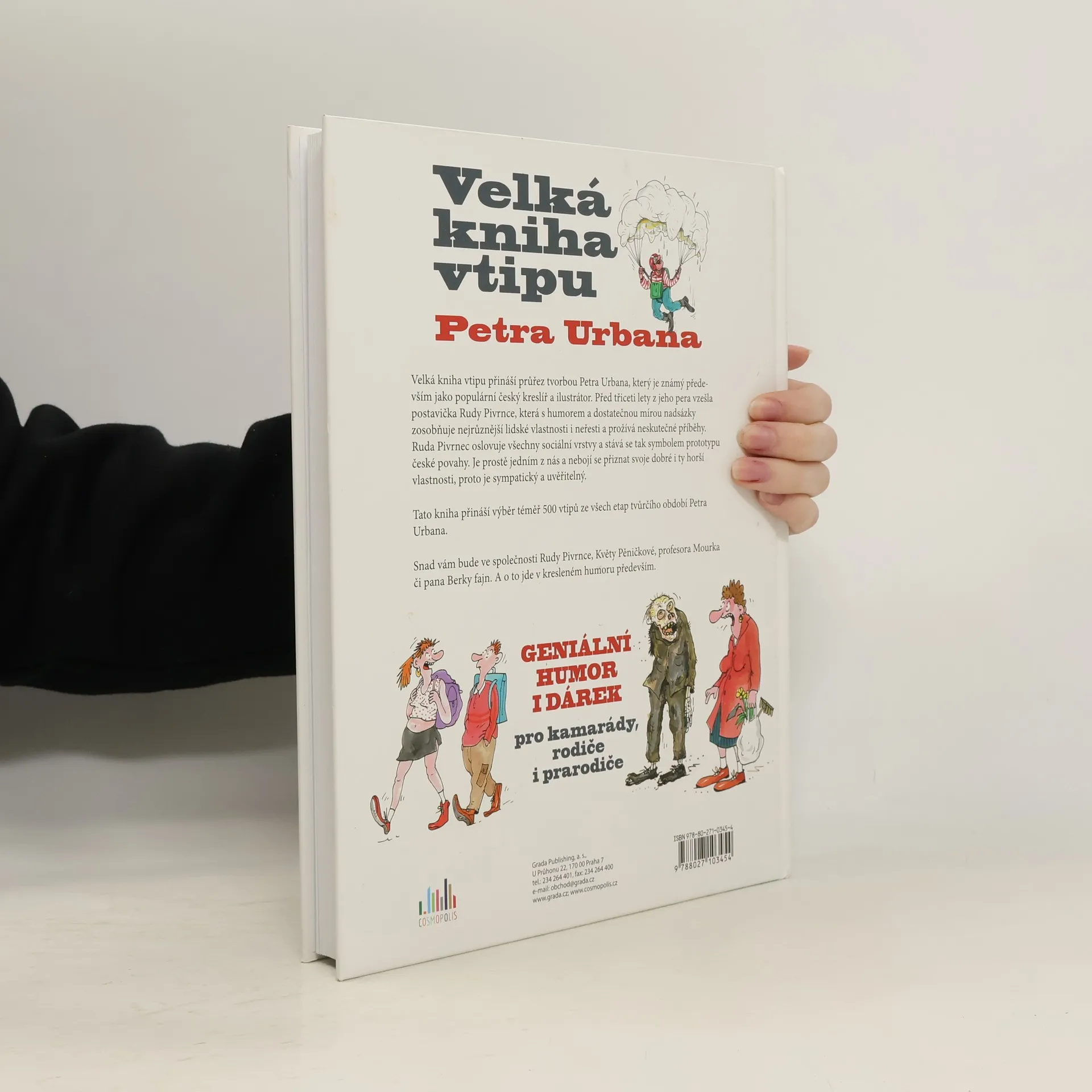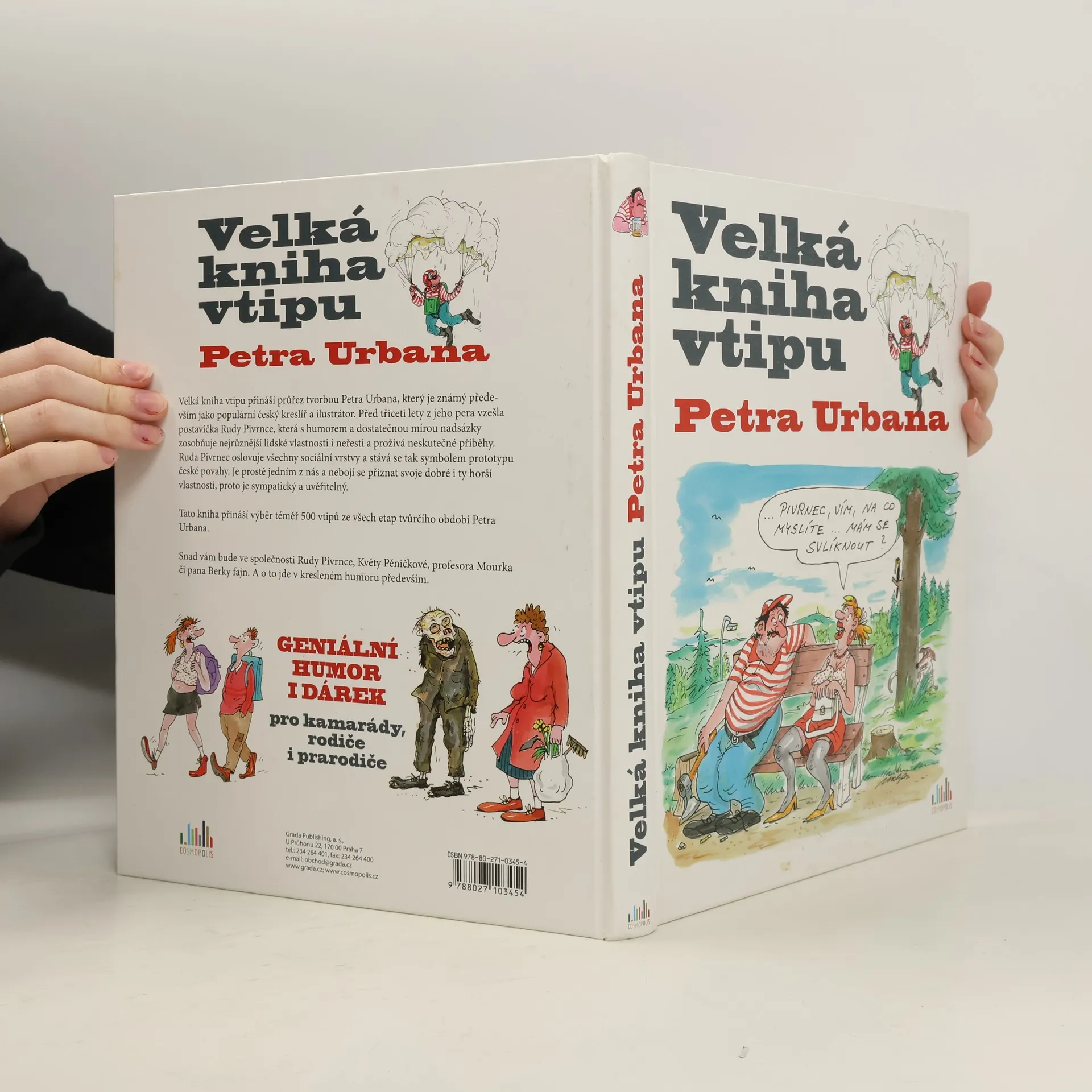 Velká kniha vtipu přináší průřez tvorbou Petra Urbana, který je známý především jako populární český kreslíř a ilustrátor. Z jeho pera před třiceti lety vzešla postavička Rudy Pivrnce, která zosobňuje s humorem a dostatečnou mírou nadsázky nejrůznější lidské vlastnosti i neřesti a prožívá neskutečné příběhy. Ruda Pivrnec oslovuje všechny sociální vrstvy obyvatel a stává se tak symbolem prototypu české povahy. Je prostě jedním z nás a nebojí se přiznat svoje dobré i ty horší vlastnosti, proto je sympatický a uvěřitelný. Tato kniha přináší výběr téměř 500 vtipů tak říkajíc od všeho něco a ze všech etap tvůrčího období Petra Urbana. Snad vám bude ve společnosti Rudy Pivrnce, Květy Pěničkové, profesora Mourka či pana Berky fajn. O to v kresleném humoru jde především.